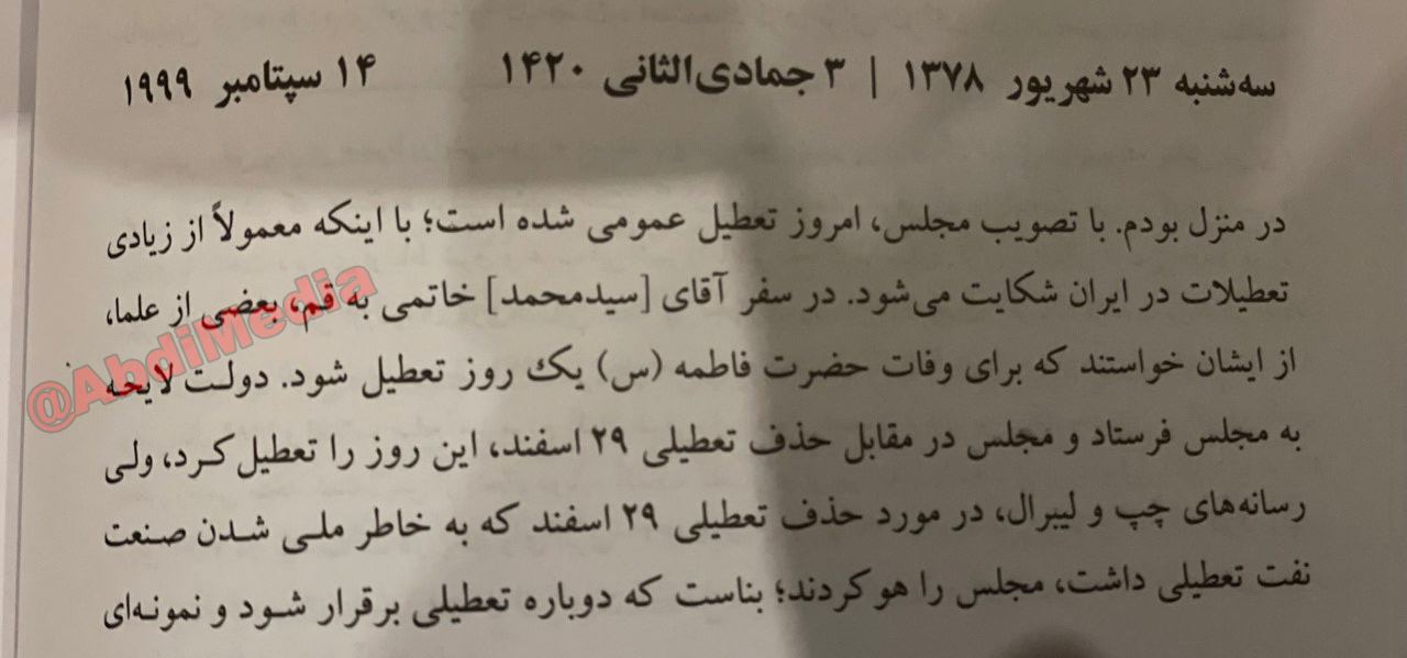 الرئيسية/ أكبر هاشمي رفسنجانيأصبح يوم السبت 23 شهريور 1378 عطلة رسمية بموافقة البرلمان وهي السنة الأولى من وفاة الحضرة فاطمة زهرة ابنة نبي الإسلام.يقرأدقيقة واحدة -السبت 2024/10/12 - 16:42كود الأخبار:672يشارك ويروي أكبر هاشمي رفسنجاني في مذكراته ما يلي: وأنجز هذا العمل على يد الرئيس آنذاك سيد محمد خاتمي بناء على نصيحة وطلب من سلطة في قم لم يذكر اسمها صراحة. كان من المفترض أن يتوقف الإغلاق في 29 مارس ، يوم تأميم صناعة النفط. وقال الهاشمي إن البرلمان والحكومة انحرفا عن هذا القرار من خلال استهجان وسائل الإعلام واعتبرا ذلك علامة على الضعف والسلبية. Take less than a minute, register and share your opinion under this post.Insulting or inciting messages will be deleted.اشتراكالقادم بعد ذلك ذكريات أكبر هاشمي - 1 يوليو 2002خواندن دقيقتان مراجعة تاريخية: دعوة رجال الأعمال الإيرانيين المقيمين في الخارج: من الضمانات السياسية إلى المعارضة الثوريةخواندن دقيقة واحدة إعادة قراءة تاريخية لموقف من الولايات المتحدة / من "نقد الحوار" إلى "الإعجاب بالدبلوماسية": تغيير في موقف مجاهدي الثورةخواندن دقيقة واحدة النشر لأول مرة / هاشمي: السيد خوينيحة، كانوا يقولون إنه عندما يكون لدينا رجال دين، ماذا نريد أن نفعل؟خواندن دقيقة واحدة حصري - نشر لأول مرة / هاشمي رفسنجاني في حوار تاريخي: آية الله منتظري سيكون خليفة الإمامخواندن دقيقة واحدةالأكثر قراءةذكريات أكبر هاشمي رفسنجاني _ 1 اسفند 1378 ولقاء هو بعبدالله جاسبي وقلقه على نتائج الانتخاباتفیلم/أين العمید مرتضى طلاي؟مذكرات أكبر الهاشمي ــ 19 شهريفر 1378ـ استمرت المفاوضات السياسية بين الرجلين مع واز الطبسي حتى اصطحبه إلى طهران، وفي النهاية قرر الهاشمي على ما يبدو أن يخوض انتخابات البرلمان السادس بجدية من هنا.تشير سجلات المجلس الإسلامي الحديثة إلى أن البرلمان ليس رئيس الشؤون ولا يمكنه التدخل أو الموافقة على صلاحيات القائد العام للقوات المسلحة على أي مستوى ناهيك عن الإشراف عليها.ماذا سيحدث لمستقبل إيران مع المرشحين المعلنين للانتخابات الرئاسية؟ / حوار مع الدكتور تقي آزاد ارامكيهل يمكن الشعور بالتعب معك؟تعيين طبيب بيطري من قوا الباسيج رئيساً للشبكة الصحية بدلاً من جراح الأذن والأنف والحنجرة!مذكرات أكبر هاشمي ــ 14 سبتمبر 1378 ــ استمرت لقاءات كبار مديري الجهاز القضائي مع هاشمي رفسنجاني وشكواهم من إهمال رئيس القضاء الجديد هاشمي الشاهرودي.مذكرات أكبر الهاشمي -16 شهريور 1378- التقى الهاشمي مرة أخرى هذه المرة بعد أن التقى الراحل واز الطبسي بجهود عدة لتشجيع الهاشمي على المشاركة في الانتخابات.مذكرات اكبر الهاشمي-18 شهريفر 1378-استمرار جولة الممتلكات والمباني والأعمال في أستان المقدس