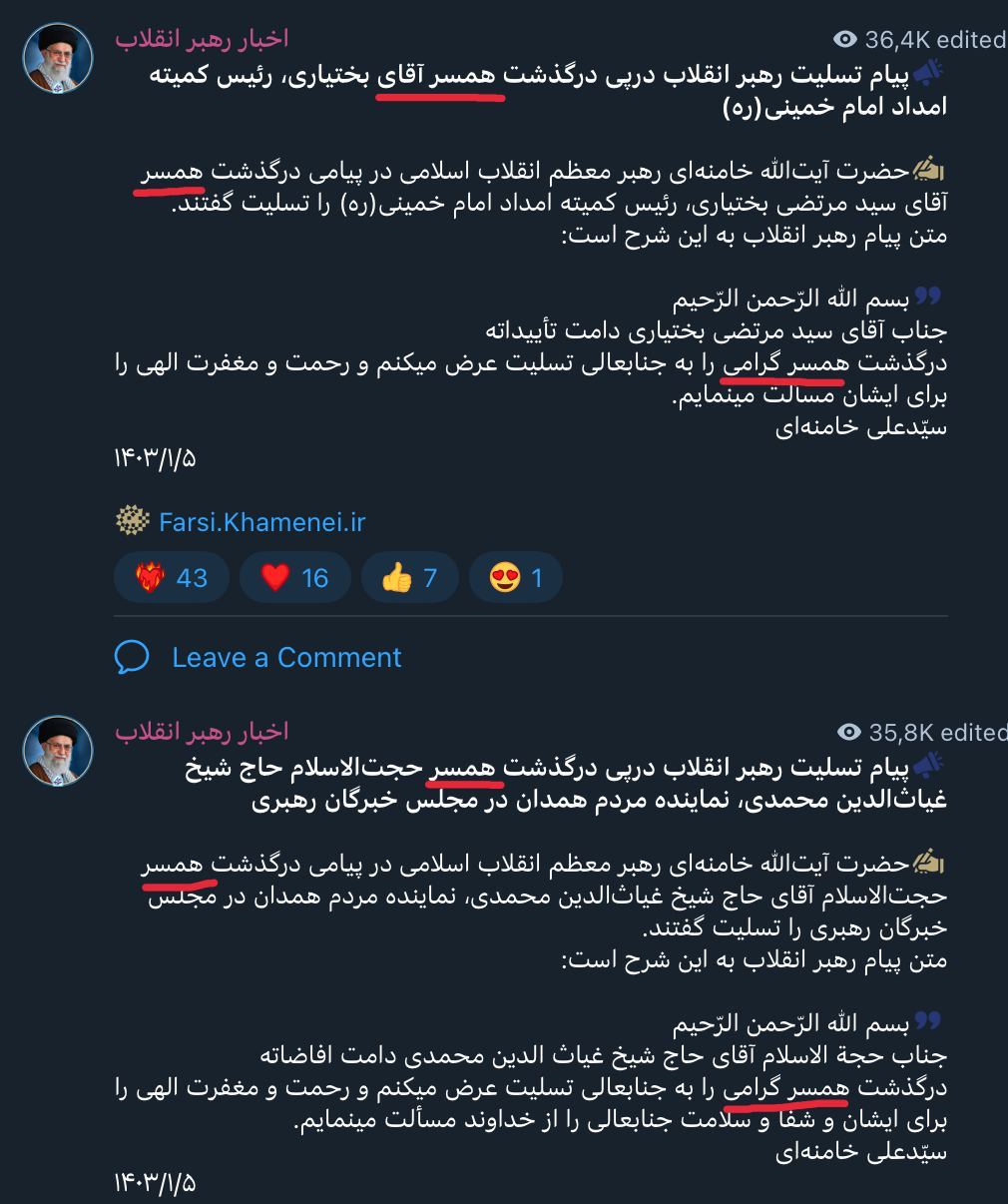 الرئيسية/آیت الله الخامنهایآية الله خامنئي في إرسال رسائل إلى السيد مرتضى بختياري والشيخ غياث الدين محمدي، اللذين فقدا زوجتيهما مؤخراً، استخدم عبارة "الزوجة الكريمة" بدلاً من "المتعلقة".يقرأدقيقة واحدة -الثلاثاء 2024/10/15 - 08:52كود الأخبار:4811يشارك لا أعلم إن كان هناك سابقة مشابهة، لكن من المثير للاهتمام أن نرى ما إذا كان استخدام "المتعلقة" سيتغير في المراسلات المستقبلية لزعيم الجمهورية الإسلامية. كما أنك ذكرت سابقاً في رسالة التعزية إلى آية الله وحيد خراساني أنه استخدم عنوان "المتعلقة" لزوجته، مما يشير إلى ثبات هذا الاستخدام في بعض السياقات. Take less than a minute, register and share your opinion under this post.Insulting or inciting messages will be deleted.اشتراكالقادم بعد ذلك قائد الجمهورية الإسلامية في خطبة صلاة عيد الفطر: السفارة بمثابة أرض ذلك البلد؛ عندما هاجموا القنصلية يعني أنهم هاجموا أرض إيران.خواندن دقيقة واحدة نشر لأول مرة / تصريحات آية الله خامنئي بصفته رئيس الجمهورية آنذاك في جمع قوات فرقة 17 علي بن أبي طالب في قم حول الحضور في الجبهة والظروف النفسية لقوات الجيش في أوائل الحرب.خواندن 0 آية الله خامنئي، إمام الأمة والولي المطلق الفقيه، وفقًا للمادة 57 من الدستور، أكد مجددًا على استخدام الأمة الإسلامية.خواندن 0 الدكتور علي أكبر گرجي والنظرة القانونية الدقيقة لتصريحات اليوم لآية الله خامنئي في لقائه مع الحكومة.خواندن 0 نهاية الجدل / أكد وأيد آية الله خامنئي تصريحات مسعود بزشكيان في جلسة التصويت على الثقة العلنية بشأن التنسيق الكامل معه تحت عنوان "المشورة".خواندن دقيقة واحدةالأكثر قراءةذكريات أكبر هاشمي رفسنجاني _ 1 اسفند 1378 ولقاء هو بعبدالله جاسبي وقلقه على نتائج الانتخاباتفیلم/أين العمید مرتضى طلاي؟مذكرات أكبر الهاشمي ــ 19 شهريفر 1378ـ استمرت المفاوضات السياسية بين الرجلين مع واز الطبسي حتى اصطحبه إلى طهران، وفي النهاية قرر الهاشمي على ما يبدو أن يخوض انتخابات البرلمان السادس بجدية من هنا.تشير سجلات المجلس الإسلامي الحديثة إلى أن البرلمان ليس رئيس الشؤون ولا يمكنه التدخل أو الموافقة على صلاحيات القائد العام للقوات المسلحة على أي مستوى ناهيك عن الإشراف عليها.ماذا سيحدث لمستقبل إيران مع المرشحين المعلنين للانتخابات الرئاسية؟ / حوار مع الدكتور تقي آزاد ارامكيهل يمكن الشعور بالتعب معك؟تعيين طبيب بيطري من قوا الباسيج رئيساً للشبكة الصحية بدلاً من جراح الأذن والأنف والحنجرة!مذكرات أكبر هاشمي ــ 14 سبتمبر 1378 ــ استمرت لقاءات كبار مديري الجهاز القضائي مع هاشمي رفسنجاني وشكواهم من إهمال رئيس القضاء الجديد هاشمي الشاهرودي.مذكرات أكبر الهاشمي -16 شهريور 1378- التقى الهاشمي مرة أخرى هذه المرة بعد أن التقى الراحل واز الطبسي بجهود عدة لتشجيع الهاشمي على المشاركة في الانتخابات.مذكرات اكبر الهاشمي-18 شهريفر 1378-استمرار جولة الممتلكات والمباني والأعمال في أستان المقدس