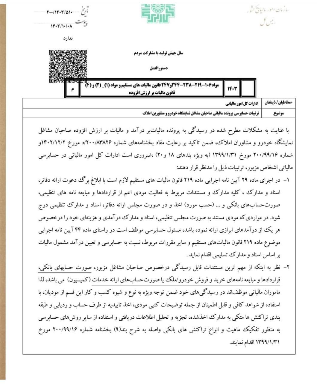 الرئيسية/قانونيتعليمات ترتيبات تدقيق الملف الضريبي لأصحاب الأعمال في معرض السيارات والوكلاء العقاريينيقرأدقيقة واحدة -الاثنين 2024/12/30 - 10:01كود الأخبار:10917يشارك الصورة الصورة Take less than a minute, register and share your opinion under this post.Insulting or inciting messages will be deleted.اشتراكالقادم بعد ذلك اجتماع قضائي في طهران حول وضعية استعادة الممتلكات في حال وفاة المتهمخواندن دقيقة واحدة ويتم معالجة جزء من القضية في مكتب المدعي العام والثوري في منطقة العشرين في طهران، في حين يتم إعداد الباقي في المركز القانوني الدولي الرئاسي.خواندن دقيقة واحدة رئيس السلطة القضائية: يجب التحقيق في قضية استشهاد حجة الإسلام والمسلمين حيدري بسرعةخواندن دقيقة واحدة قدم المحامي بهنام نزادي التماسا إلى الهيئة العامة للمحكمة الإدارية للعدل، مشيرا إلى أن تقييد مستوى العمليات المصرفية لعملاء المؤسسات الائتمانية، تماشيا مع الحكم السابق المماثل للهيئة العامة للمحكمة الإدارية للعدل، خارج نطاق صلاحيات مركز المعلومات الماليةخواندن دقيقة واحدة تحذر دائرة العدل العامة في محافظة خراسان رضوي نقابات المحامين من استخدام الرمز الوطني: 1111111111خواندن دقيقة واحدةالأكثر قراءةذكريات أكبر هاشمي رفسنجاني _ 1 اسفند 1378 ولقاء هو بعبدالله جاسبي وقلقه على نتائج الانتخاباتفیلم/أين العمید مرتضى طلاي؟مذكرات أكبر الهاشمي ــ 19 شهريفر 1378ـ استمرت المفاوضات السياسية بين الرجلين مع واز الطبسي حتى اصطحبه إلى طهران، وفي النهاية قرر الهاشمي على ما يبدو أن يخوض انتخابات البرلمان السادس بجدية من هنا.تشير سجلات المجلس الإسلامي الحديثة إلى أن البرلمان ليس رئيس الشؤون ولا يمكنه التدخل أو الموافقة على صلاحيات القائد العام للقوات المسلحة على أي مستوى ناهيك عن الإشراف عليها.ماذا سيحدث لمستقبل إيران مع المرشحين المعلنين للانتخابات الرئاسية؟ / حوار مع الدكتور تقي آزاد ارامكيهل يمكن الشعور بالتعب معك؟تعيين طبيب بيطري من قوا الباسيج رئيساً للشبكة الصحية بدلاً من جراح الأذن والأنف والحنجرة!مذكرات أكبر هاشمي ــ 14 سبتمبر 1378 ــ استمرت لقاءات كبار مديري الجهاز القضائي مع هاشمي رفسنجاني وشكواهم من إهمال رئيس القضاء الجديد هاشمي الشاهرودي.مذكرات أكبر الهاشمي -16 شهريور 1378- التقى الهاشمي مرة أخرى هذه المرة بعد أن التقى الراحل واز الطبسي بجهود عدة لتشجيع الهاشمي على المشاركة في الانتخابات.مذكرات اكبر الهاشمي-18 شهريفر 1378-استمرار جولة الممتلكات والمباني والأعمال في أستان المقدس