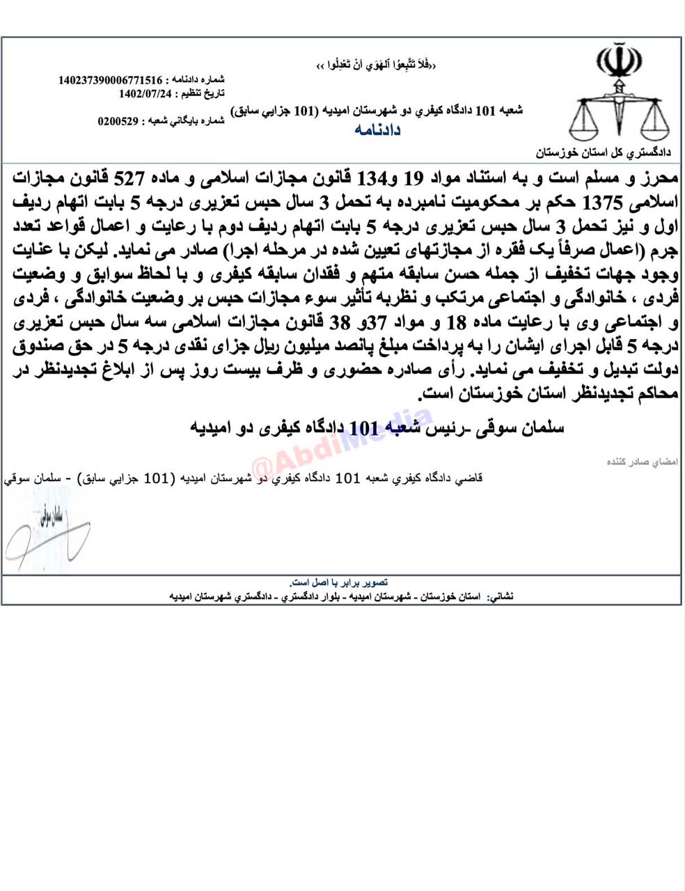 الرئيسية/قانونيمحکومية مظفر آقاجري، معاون شهردار أميدية بسبب تزوير الشهادة / هل سيتم استرداد المبالغ التي حصل عليها خلال فترة توليه المنصب غير القانوني؟يقرأدقيقة واحدة -الاثنين 2024/10/21 - 09:19كود الأخبار:3753يشاركالصورة الصورة PreviousNextتذكرون مذكرتي بشأن مظفر آقاجري، المعاون المزور لبلدية أميدية؟أخيراً، صدر قرار الاتهام من المدعي العام والثورة في أميدية للنظر في الاتهامات الموجهة إليه، حيث حُكم عليه بالسجن لمدة ثلاث سنوات بتهمة تزوير الشهادة الجامعية، وقد تم تحويل هذه العقوبة إلى غرامة مالية بموجب القوانين التخفيفية.هذا الحكم بالطبع قابل للاعتراض في المواعيد القانونية المحددة أمام محاكم الاستئناف في مركز محافظة خوزستان.لكن النقطة المهمة هي: ماذا فعل مدير عام التفتيش وإدارة الأداء والشؤون القانونية في محافظة خوزستان، ومدير عام الشؤون البلدية وشؤون المجالس في هذه المحافظة، وكذلك المفتش العام لمحافظة خوزستان، لاستعادة حقوق ومزايا التي حصل عليها من بلدية أميدية بناءً على الشهادة المزورة التي قدمها؟ Take less than a minute, register and share your opinion under this post.Insulting or inciting messages will be deleted.اشتراكالقادم بعد ذلك اجتماع قضائي في طهران حول وضعية استعادة الممتلكات في حال وفاة المتهمخواندن دقيقة واحدة ويتم معالجة جزء من القضية في مكتب المدعي العام والثوري في منطقة العشرين في طهران، في حين يتم إعداد الباقي في المركز القانوني الدولي الرئاسي.خواندن دقيقة واحدة رئيس السلطة القضائية: يجب التحقيق في قضية استشهاد حجة الإسلام والمسلمين حيدري بسرعةخواندن دقيقة واحدة قدم المحامي بهنام نزادي التماسا إلى الهيئة العامة للمحكمة الإدارية للعدل، مشيرا إلى أن تقييد مستوى العمليات المصرفية لعملاء المؤسسات الائتمانية، تماشيا مع الحكم السابق المماثل للهيئة العامة للمحكمة الإدارية للعدل، خارج نطاق صلاحيات مركز المعلومات الماليةخواندن دقيقة واحدة تحذر دائرة العدل العامة في محافظة خراسان رضوي نقابات المحامين من استخدام الرمز الوطني: 1111111111خواندن دقيقة واحدةالأكثر قراءةذكريات أكبر هاشمي رفسنجاني _ 1 اسفند 1378 ولقاء هو بعبدالله جاسبي وقلقه على نتائج الانتخاباتفیلم/أين العمید مرتضى طلاي؟مذكرات أكبر الهاشمي ــ 19 شهريفر 1378ـ استمرت المفاوضات السياسية بين الرجلين مع واز الطبسي حتى اصطحبه إلى طهران، وفي النهاية قرر الهاشمي على ما يبدو أن يخوض انتخابات البرلمان السادس بجدية من هنا.تشير سجلات المجلس الإسلامي الحديثة إلى أن البرلمان ليس رئيس الشؤون ولا يمكنه التدخل أو الموافقة على صلاحيات القائد العام للقوات المسلحة على أي مستوى ناهيك عن الإشراف عليها.ماذا سيحدث لمستقبل إيران مع المرشحين المعلنين للانتخابات الرئاسية؟ / حوار مع الدكتور تقي آزاد ارامكيهل يمكن الشعور بالتعب معك؟تعيين طبيب بيطري من قوا الباسيج رئيساً للشبكة الصحية بدلاً من جراح الأذن والأنف والحنجرة!مذكرات أكبر هاشمي ــ 14 سبتمبر 1378 ــ استمرت لقاءات كبار مديري الجهاز القضائي مع هاشمي رفسنجاني وشكواهم من إهمال رئيس القضاء الجديد هاشمي الشاهرودي.مذكرات أكبر الهاشمي -16 شهريور 1378- التقى الهاشمي مرة أخرى هذه المرة بعد أن التقى الراحل واز الطبسي بجهود عدة لتشجيع الهاشمي على المشاركة في الانتخابات.مذكرات اكبر الهاشمي-18 شهريفر 1378-استمرار جولة الممتلكات والمباني والأعمال في أستان المقدس