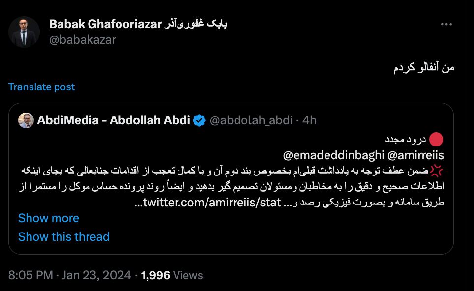 الرئيسية/سياسةجناب غفوريآذر الكريميقرأدقيقتان -الأربعاء 2024/10/23 - 14:31كود الأخبار:4635يشارك تحية لكم ولجميع الرفاق الكرام الذين يتابعون وكل الاحترام للأشخاص الكرام مثلكم الذين يرون من المناسب إلغاء المتابعة.عبدي ميديا هي وسيلة إعلامية مستقلة ولا تكتب أبداً بشكل مبتذل، وليست مدينة لأحد مقابل المعلومات الموثوقة تماماً التي تنشرها، وتدافع فقط عن الحق وبيان الحقيقة. لم أكتب يوماً أي موضوع لإرضاء أي شخص ولم أنتج محتوى لذلك.السيد أمير رئيسيان، المحامي المحترم، يمكنه أيضاً أن يجيب علناً على أسئلتي الواضحة والمليئة بالاحترام أو أن يواصل صمته. الموضوع بسيط وواضح تماماً؛ حياة الأفراد ليست لعبة في الألاعيب السياسية والإعلامية. حياة الأفراد محترمة.فيما يتعلق باثنين من الزملاء الصحفيين المحترمين الذين تم إطلاق سراحهم مؤخراً بكفالة، ذكرت هذا الأمر المهم في مذكرة. السجين، وبشكل عام الموكل، له الحق في أن يُدافع عنه بشكل صحيح ومناسب ومسؤول بالطبع.طبيعة حديثي لا ترتبط بإجراءات الجمهورية الإسلامية وتفاصيل هذا الملف القضائي في إزالة معارضيها، وهذه الأمور جانباً. ولكن عندما يتم الحديث عن ماهية النظر في إطار القوانين الداخلية لهذا البلد من قبل محامي الدفاع، يجب أن نعلم أن هناك صحفيين مثلي يبحثون في التفاصيل.لقد كتبت للتو جزءاً من المعلومات الموثوقة في التحقيق، وطرحتها ليلة أمس خلال أسئلة قانونية. كما أنه من الغريب جداً بالنسبة لي كصحفي تحقيقي محترم أن تختار هذا المسار بدلاً من متابعة الحصول على إجابات علنية للأسئلة البسيطة، وهو مسار أعتبره أيضاً محترماً.🔸وفي الوقت نفسه، فإن إنقاذ الأرواح بالنسبة لي أهم من إعدامهم وسجنهم. Take less than a minute, register and share your opinion under this post.Insulting or inciting messages will be deleted.اشتراكالقادم بعد ذلك انتقاد لاذع من عباس عبدي لسؤال في اختبار "فرهنغيان" (المعلمين)/ هل تعلم ما الهدف من هذا السؤال الذي وردت فيه كذبة؟خواندن دقيقة واحدة أما الحالة الأغرب التي تبذل كل الجهود لحجب خيوط واتصالات الجهات المعنية فهي ظاهرة مجموعة الزاوية المالية التي قمت بها حتى الآن دون نشر تفاصيلها في عبدي ميديا.خواندن دقيقة واحدة شمخاني: لأننا نقاطع أي مكان في العالم، لا يعمل معنا سلاح جديخواندن دقيقة واحدة شمخاني: الجمهورية الإسلامية لم تختبر الحرب المباشرة مع إسرائيلخواندن دقيقة واحدة شمخاني عن عملية عين الأسد: كانت سريعة وكافيةخواندن دقيقة واحدةالأكثر قراءةذكريات أكبر هاشمي رفسنجاني _ 1 اسفند 1378 ولقاء هو بعبدالله جاسبي وقلقه على نتائج الانتخاباتفیلم/أين العمید مرتضى طلاي؟مذكرات أكبر الهاشمي ــ 19 شهريفر 1378ـ استمرت المفاوضات السياسية بين الرجلين مع واز الطبسي حتى اصطحبه إلى طهران، وفي النهاية قرر الهاشمي على ما يبدو أن يخوض انتخابات البرلمان السادس بجدية من هنا.تشير سجلات المجلس الإسلامي الحديثة إلى أن البرلمان ليس رئيس الشؤون ولا يمكنه التدخل أو الموافقة على صلاحيات القائد العام للقوات المسلحة على أي مستوى ناهيك عن الإشراف عليها.ماذا سيحدث لمستقبل إيران مع المرشحين المعلنين للانتخابات الرئاسية؟ / حوار مع الدكتور تقي آزاد ارامكيهل يمكن الشعور بالتعب معك؟تعيين طبيب بيطري من قوا الباسيج رئيساً للشبكة الصحية بدلاً من جراح الأذن والأنف والحنجرة!مذكرات أكبر هاشمي ــ 14 سبتمبر 1378 ــ استمرت لقاءات كبار مديري الجهاز القضائي مع هاشمي رفسنجاني وشكواهم من إهمال رئيس القضاء الجديد هاشمي الشاهرودي.مذكرات أكبر الهاشمي -16 شهريور 1378- التقى الهاشمي مرة أخرى هذه المرة بعد أن التقى الراحل واز الطبسي بجهود عدة لتشجيع الهاشمي على المشاركة في الانتخابات.مذكرات اكبر الهاشمي-18 شهريفر 1378-استمرار جولة الممتلكات والمباني والأعمال في أستان المقدس