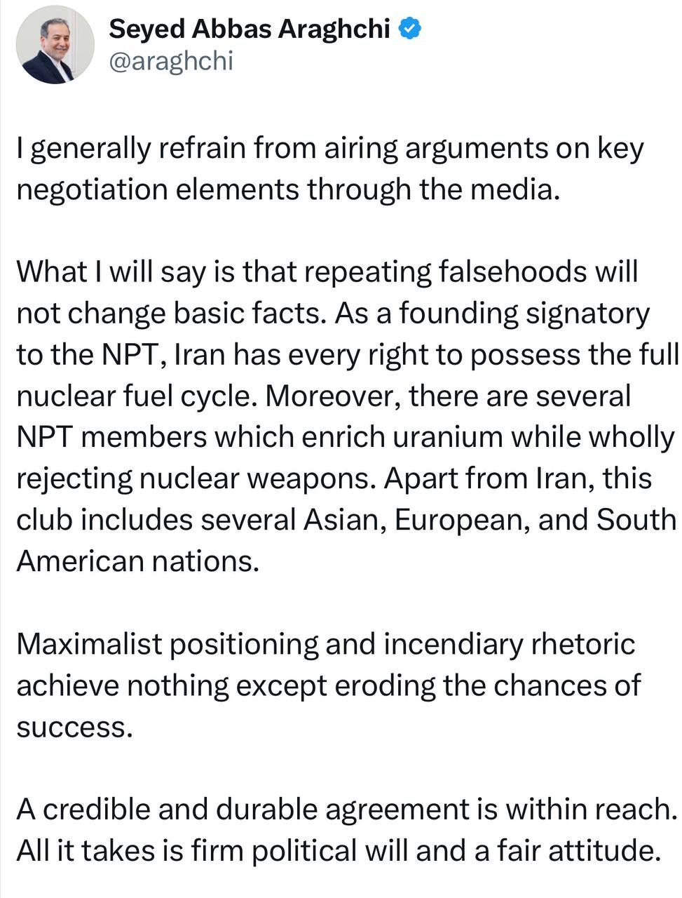 الرئيسية/سياسة عراقجي: تكرار الأكاذيب لا يغير الحقائق الأساسيةيقرأدقيقة واحدة -السبت 2025/05/03 - 11:43كود الأخبار:17424يشارك أتجنب من حيث المبدأ الجدال حول العناصر الرئيسية للتفاوض من خلال وسائل الإعلام. غرد وزير الخارجية:أتجنب من حيث المبدأ الجدال حول العناصر الرئيسية للتفاوض من خلال وسائل الإعلام. لكن ما أريد قوله هو أن تكرار الكذبة لا يغير الحقائق الأساسية. بصفتها أحد الموقعين المؤسسين على معاهدة عدم انتشار الأسلحة النووية، فإن لإيران كل الحق في دورة وقود نووي كاملة.بالإضافة إلى ذلك ، هناك العديد من أعضاء معاهدة عدم انتشار الأسلحة النووية الذين يقومون بتخصيب اليورانيوم بينما يرفضون الأسلحة النووية رفضا قاطعا. بصرف النظر عن إيران ، يضم هذا النادي أيضا العديد من الدول الآسيوية والأوروبية وأمريكا الجنوبية.إن الموقف المتطرف والخطاب الاستفزازي لا يمكن إلا أن يدمر فرص النجاح.اتفاقية سارية المفعول ودائمة متاحة. وكل ما نحتاجه هو إرادة سياسية حاسمة وموقف عادل. Take less than a minute, register and share your opinion under this post.Insulting or inciting messages will be deleted.اشتراكالقادم بعد ذلك بور محمدي: نحن متهورون في حماية المعلومات.خواندن دقيقة واحدة تاج زاده في مقابلة مع مجلة لوبوئن: يمكن للشعب أن ينهي حكم رجال الدين في إيران.خواندن %count دقائق بعد شكوى حميد رسايي واستفسار (طلب معلومات/توضيح) المدعي العام من محكمة رجال الدين الخاصة ومجلس صيانة الدستور.خواندن دقيقة واحدة تحياتي للسيد محسني إژيه، رئيس السلطة القضائية، والسيد مرتضوي، مساعد الإشراف والتفتيش في المحكمة العليا، والسيد دهقاني، رئيس القضاء في محافظة خوزستان.خواندن دقيقة واحدة كل تعليقاتنا وتغريداتنا في هذا الفضاء ستبقى إرثاً حتى لو حذفناها، وفي المستقبل سيُحاكموننا (أو سيحكمون علينا) بقسوة بسببها جميعاً.خواندن دقيقة واحدةالأكثر قراءةذكريات أكبر هاشمي رفسنجاني _ 1 اسفند 1378 ولقاء هو بعبدالله جاسبي وقلقه على نتائج الانتخاباتفیلم/أين العمید مرتضى طلاي؟مذكرات أكبر الهاشمي ــ 19 شهريفر 1378ـ استمرت المفاوضات السياسية بين الرجلين مع واز الطبسي حتى اصطحبه إلى طهران، وفي النهاية قرر الهاشمي على ما يبدو أن يخوض انتخابات البرلمان السادس بجدية من هنا.تشير سجلات المجلس الإسلامي الحديثة إلى أن البرلمان ليس رئيس الشؤون ولا يمكنه التدخل أو الموافقة على صلاحيات القائد العام للقوات المسلحة على أي مستوى ناهيك عن الإشراف عليها.ماذا سيحدث لمستقبل إيران مع المرشحين المعلنين للانتخابات الرئاسية؟ / حوار مع الدكتور تقي آزاد ارامكيهل يمكن الشعور بالتعب معك؟تعيين طبيب بيطري من قوا الباسيج رئيساً للشبكة الصحية بدلاً من جراح الأذن والأنف والحنجرة!مذكرات أكبر هاشمي ــ 14 سبتمبر 1378 ــ استمرت لقاءات كبار مديري الجهاز القضائي مع هاشمي رفسنجاني وشكواهم من إهمال رئيس القضاء الجديد هاشمي الشاهرودي.مذكرات أكبر الهاشمي -16 شهريور 1378- التقى الهاشمي مرة أخرى هذه المرة بعد أن التقى الراحل واز الطبسي بجهود عدة لتشجيع الهاشمي على المشاركة في الانتخابات.مذكرات اكبر الهاشمي-18 شهريفر 1378-استمرار جولة الممتلكات والمباني والأعمال في أستان المقدس
