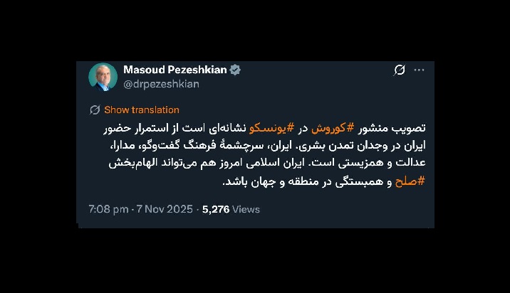 الرئيسية/سياسةتحياتي للسيد الرئيس رئيس المجلس الأعلى للثورة الثقافية ورئيس المجلس الأعلى للأمن القومييقرأدقيقة واحدة -السبت 2025/11/08 - 00:22كود الأخبار:23421يشارك هل يمكنك إدارة وتخفيف القيود حول كورش وقبره وضواحي البلاد؟ أم أن هذه التغريدة كافية؟تصویب منشور #کوروش در #یونسکو نشانهای است از استمرار حضور ایران در وجدان تمدن بشری. ایران، سرچشمهٔ فرهنگ گفتوگو، مدارا، عدالت و همزیستی است. ایران اسلامی امروز هم میتواند الهامبخش #صلح و همبستگی در منطقه و جهان باشد.— Masoud Pezeshkian (@drpezeshkian) November 7, 2025🔴 آقای رییس جمهور و رییس شورای عالی انقلاب فرهنگی و رییس شورای عالی امنیت ملیدرود🔸آیا میتوانید محدودیت های پیرامون #کوروش و آرامگاه او و حواشی های داخل کشور را هم مدیریت و کم رنگ تر بکنید؟ یا به همین توییت کفایت میفرمایید؟— AbdiMedia - Abdollah Abdi (@abdolah_abdi) November 7, 2025 Take less than a minute, register and share your opinion under this post.Insulting or inciting messages will be deleted.اشتراكالقادم بعد ذلك إيران في وضع يمكنها من التفاوض مع جميع البلدانخواندن دقيقة واحدة غادر عبد العظيم شمخاني محافظة الأهواز، وأصبح علي بويري رئيسًا لمحافظة الأهوازخواندن دقيقة واحدة هل هناك علاقة بين حزب الحضارة الإسلامية الجديد والمجموعة المالية؟خواندن دقيقة واحدة أنهى الصحفي والمحلل السياسي فؤاد شمس حياتهخواندن دقيقة واحدة السيد وزير الداخلية! هل هذا الكلام صحيح عن الشاب الذي أضرم النار في نفسه في الأهواز؟/ أخبر الشعب بالإجابة بكل حيادية وصراحة وصراحةخواندن دقيقة واحدةالأكثر قراءةذكريات أكبر هاشمي رفسنجاني _ 1 اسفند 1378 ولقاء هو بعبدالله جاسبي وقلقه على نتائج الانتخاباتفیلم/أين العمید مرتضى طلاي؟مذكرات أكبر الهاشمي ــ 19 شهريفر 1378ـ استمرت المفاوضات السياسية بين الرجلين مع واز الطبسي حتى اصطحبه إلى طهران، وفي النهاية قرر الهاشمي على ما يبدو أن يخوض انتخابات البرلمان السادس بجدية من هنا.تشير سجلات المجلس الإسلامي الحديثة إلى أن البرلمان ليس رئيس الشؤون ولا يمكنه التدخل أو الموافقة على صلاحيات القائد العام للقوات المسلحة على أي مستوى ناهيك عن الإشراف عليها.ماذا سيحدث لمستقبل إيران مع المرشحين المعلنين للانتخابات الرئاسية؟ / حوار مع الدكتور تقي آزاد ارامكيهل يمكن الشعور بالتعب معك؟تعيين طبيب بيطري من قوا الباسيج رئيساً للشبكة الصحية بدلاً من جراح الأذن والأنف والحنجرة!مذكرات أكبر هاشمي ــ 14 سبتمبر 1378 ــ استمرت لقاءات كبار مديري الجهاز القضائي مع هاشمي رفسنجاني وشكواهم من إهمال رئيس القضاء الجديد هاشمي الشاهرودي.مذكرات أكبر الهاشمي -16 شهريور 1378- التقى الهاشمي مرة أخرى هذه المرة بعد أن التقى الراحل واز الطبسي بجهود عدة لتشجيع الهاشمي على المشاركة في الانتخابات.مذكرات اكبر الهاشمي-18 شهريفر 1378-استمرار جولة الممتلكات والمباني والأعمال في أستان المقدس