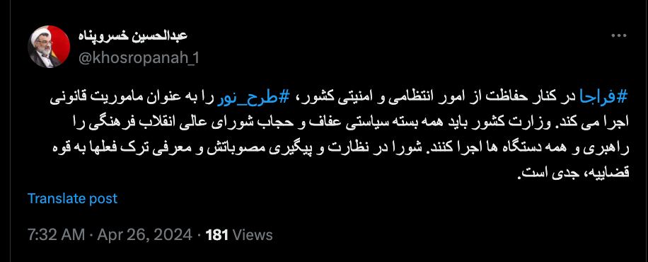 الرئيسية/سياسة"تغريدة أمين المجلس الأعلى للثورة الثقافيةيقرأدقيقة واحدة -الاثنين 2024/10/21 - 13:30كود الأخبار:5007يشارك أمين المجلس الأعلى للثورة الثقافية، من خلال نشر تغريدة، أعرب عن دعمه لإجراءات فراجا لتنفيذ خطة نور، وحث وزارة الداخلية على تنفيذ جميع قرارات هذا المجلس «التي تُعتبر في هيكل الجمهورية الإسلامية بمثابة قانون، وحتى الجهاز القضائي لا يستطيع معارضتها، وقد أكد آية الله خامنئي مؤخرًا على ذلك مجددًا».كما هدد الشيخ حجت الإسلام الدكتور خسرو پناه وزارة الداخلية باللجوء إلى القضاء في حال عدم تنفيذ القرارات المذكورة.أليس ذلك جميلًا؟" Take less than a minute, register and share your opinion under this post.Insulting or inciting messages will be deleted.اشتراكالقادم بعد ذلك انتقاد لاذع من عباس عبدي لسؤال في اختبار "فرهنغيان" (المعلمين)/ هل تعلم ما الهدف من هذا السؤال الذي وردت فيه كذبة؟خواندن دقيقة واحدة أما الحالة الأغرب التي تبذل كل الجهود لحجب خيوط واتصالات الجهات المعنية فهي ظاهرة مجموعة الزاوية المالية التي قمت بها حتى الآن دون نشر تفاصيلها في عبدي ميديا.خواندن دقيقة واحدة شمخاني: لأننا نقاطع أي مكان في العالم، لا يعمل معنا سلاح جديخواندن دقيقة واحدة شمخاني: الجمهورية الإسلامية لم تختبر الحرب المباشرة مع إسرائيلخواندن دقيقة واحدة شمخاني عن عملية عين الأسد: كانت سريعة وكافيةخواندن دقيقة واحدةالأكثر قراءةذكريات أكبر هاشمي رفسنجاني _ 1 اسفند 1378 ولقاء هو بعبدالله جاسبي وقلقه على نتائج الانتخاباتفیلم/أين العمید مرتضى طلاي؟مذكرات أكبر الهاشمي ــ 19 شهريفر 1378ـ استمرت المفاوضات السياسية بين الرجلين مع واز الطبسي حتى اصطحبه إلى طهران، وفي النهاية قرر الهاشمي على ما يبدو أن يخوض انتخابات البرلمان السادس بجدية من هنا.تشير سجلات المجلس الإسلامي الحديثة إلى أن البرلمان ليس رئيس الشؤون ولا يمكنه التدخل أو الموافقة على صلاحيات القائد العام للقوات المسلحة على أي مستوى ناهيك عن الإشراف عليها.ماذا سيحدث لمستقبل إيران مع المرشحين المعلنين للانتخابات الرئاسية؟ / حوار مع الدكتور تقي آزاد ارامكيهل يمكن الشعور بالتعب معك؟تعيين طبيب بيطري من قوا الباسيج رئيساً للشبكة الصحية بدلاً من جراح الأذن والأنف والحنجرة!مذكرات أكبر هاشمي ــ 14 سبتمبر 1378 ــ استمرت لقاءات كبار مديري الجهاز القضائي مع هاشمي رفسنجاني وشكواهم من إهمال رئيس القضاء الجديد هاشمي الشاهرودي.مذكرات أكبر الهاشمي -16 شهريور 1378- التقى الهاشمي مرة أخرى هذه المرة بعد أن التقى الراحل واز الطبسي بجهود عدة لتشجيع الهاشمي على المشاركة في الانتخابات.مذكرات اكبر الهاشمي-18 شهريفر 1378-استمرار جولة الممتلكات والمباني والأعمال في أستان المقدس