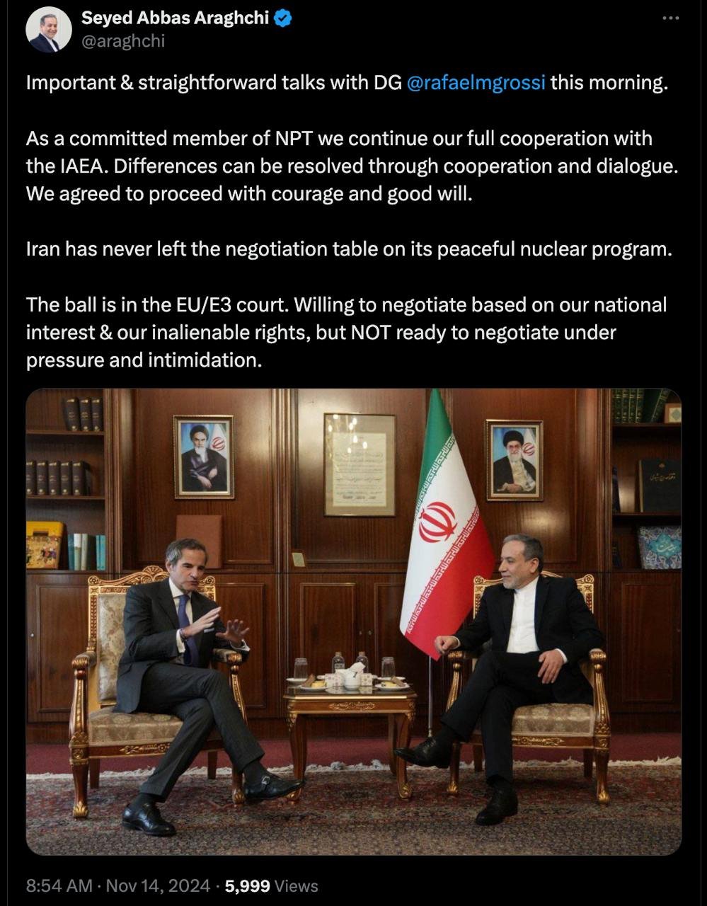 الرئيسية/سياسةعراقجي: مستعدون للتفاوض على أساس مصالحنا الوطنية وحقوقنا غير القابلة للتصرف/ إيران لم تغادر طاولة المفاوضات بشأن برنامجها النووي السلمي/ الآن جاء دور الاتحاد الأوروبي وثلاث دول أوروبيةيقرأدقيقة واحدة -الخميس 2024/11/14 - 11:58كود الأخبار:8393يشارك ويمكن حل النزاعات من خلال التعاون والحوار. واتفقنا على المضي قدما بإرادة قوية وحسن نية.ويمكن حل النزاعات من خلال التعاون والحوار. واتفقنا على المضي قدما بإرادة قوية وحسن نية.كتب عباس عراقجي، وزير الخارجية الإيراني:وقد أجرينا صباح اليوم محادثات هامة وصريحة مع المدير العام للوكالة الدولية للطاقة الذرية، السيد رافائيل غروسي.وبوصفنا عضوا ملتزما في معاهدة عدم الانتشار، نواصل التعاون الكامل مع الوكالة.لم تغادر إيران أبدا طاولة المفاوضات بشأن برنامجها النووي السلمي.والآن جاء دور الاتحاد الأوروبي والدول الأوروبية الثلاث. نحن مستعدون للتفاوض على أساس مصالحنا الوطنية وحقوقنا التي لا يمكن إنكارها، لكننا لسنا مستعدين للتفاوض تحت الضغط والترهيب. Take less than a minute, register and share your opinion under this post.Insulting or inciting messages will be deleted.اشتراكالقادم بعد ذلك بور محمدي: نحن متهورون في حماية المعلومات.خواندن دقيقة واحدة تاج زاده في مقابلة مع مجلة لوبوئن: يمكن للشعب أن ينهي حكم رجال الدين في إيران.خواندن %count دقائق بعد شكوى حميد رسايي واستفسار (طلب معلومات/توضيح) المدعي العام من محكمة رجال الدين الخاصة ومجلس صيانة الدستور.خواندن دقيقة واحدة تحياتي للسيد محسني إژيه، رئيس السلطة القضائية، والسيد مرتضوي، مساعد الإشراف والتفتيش في المحكمة العليا، والسيد دهقاني، رئيس القضاء في محافظة خوزستان.خواندن دقيقة واحدة كل تعليقاتنا وتغريداتنا في هذا الفضاء ستبقى إرثاً حتى لو حذفناها، وفي المستقبل سيُحاكموننا (أو سيحكمون علينا) بقسوة بسببها جميعاً.خواندن دقيقة واحدةالأكثر قراءةذكريات أكبر هاشمي رفسنجاني _ 1 اسفند 1378 ولقاء هو بعبدالله جاسبي وقلقه على نتائج الانتخاباتفیلم/أين العمید مرتضى طلاي؟مذكرات أكبر الهاشمي ــ 19 شهريفر 1378ـ استمرت المفاوضات السياسية بين الرجلين مع واز الطبسي حتى اصطحبه إلى طهران، وفي النهاية قرر الهاشمي على ما يبدو أن يخوض انتخابات البرلمان السادس بجدية من هنا.تشير سجلات المجلس الإسلامي الحديثة إلى أن البرلمان ليس رئيس الشؤون ولا يمكنه التدخل أو الموافقة على صلاحيات القائد العام للقوات المسلحة على أي مستوى ناهيك عن الإشراف عليها.ماذا سيحدث لمستقبل إيران مع المرشحين المعلنين للانتخابات الرئاسية؟ / حوار مع الدكتور تقي آزاد ارامكيهل يمكن الشعور بالتعب معك؟تعيين طبيب بيطري من قوا الباسيج رئيساً للشبكة الصحية بدلاً من جراح الأذن والأنف والحنجرة!مذكرات أكبر هاشمي ــ 14 سبتمبر 1378 ــ استمرت لقاءات كبار مديري الجهاز القضائي مع هاشمي رفسنجاني وشكواهم من إهمال رئيس القضاء الجديد هاشمي الشاهرودي.مذكرات أكبر الهاشمي -16 شهريور 1378- التقى الهاشمي مرة أخرى هذه المرة بعد أن التقى الراحل واز الطبسي بجهود عدة لتشجيع الهاشمي على المشاركة في الانتخابات.مذكرات اكبر الهاشمي-18 شهريفر 1378-استمرار جولة الممتلكات والمباني والأعمال في أستان المقدس