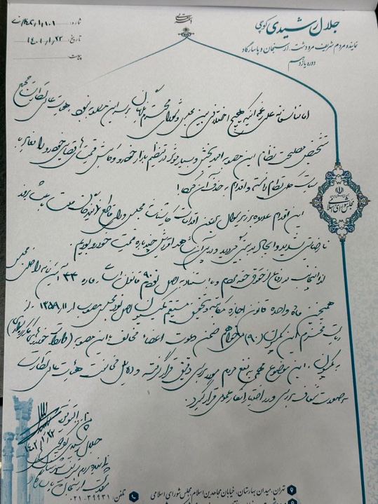 الرئيسية/ملاحظة خاصةعزيزي السيد راشيدي كوشييقرأدقيقة واحدة -الثلاثاء 2024/10/15 - 21:33كود الأخبار:2761يشاركالصورة الصورة الصورة PreviousNextإنه أمر محترم أن تتخذ إجراءات قانونية ثم تنشرها للجمهور. وبناء على ملاحظتي في عبدي ميديا حول تاريخ المادة 76 من الدستور ورأي مجلس الوصاية أتمنى كثيرا ألا يرد المجلس الأعلى للرقابة في البرلمان على لجنة المادة 90 من الدستور بخصوص مضمون التفسيرات التي تحد من صلاحيات البرلمان: «نحن إحدى الصلاحيات الثلاث التي لم تذكر في المادة 90، نحن نتجاوز البرلمان ونحن لا نجيب. ” وفي الوقت نفسه، فإن أي رد إيجابي أو سلبي من هذه اللجنة على لجنة المادة 90 من الدستور هو رد تاريخي وقانوني. حظا سعيدا. عبد الله العبدي ونشر رشدي كوتشي الرسالة والوثيقة عبر حسابه على تويتر وكتب: «اليوم، يتم الاستشهاد بالمادة 90 من الدستور، والمادة 44 من النظام الداخلي للبرلمان، وبمادة واحدة من قانون الاتصالات والتحقيقات المباشرة. وافقت لجنة المادة 90 بتاريخ 1 نوفمبر 1959 وقدمت شكوى إلى رئيس لجنة المادة 90 الموقر بشأن إلغاء قرار البرلمان من قبل اللجنة العليا للرقابة على استيراد السيارات المستعملة. Take less than a minute, register and share your opinion under this post.Insulting or inciting messages will be deleted.اشتراكالقادم بعد ذلك من فضلك أرسل أخبارًا موثوقة ومبشرة بدقة بالغة، حيث سأقوم بنشرها لإطلاع مواطنينا الأعزاء. أو قم بردّ الادعاءات المضللة بشكل موثق. هل هذا صعب؟خواندن دقيقة واحدة أعتقد أن الجميع حصلوا على ما يريدون. لقد أخذوا احتفالاتهم والقصة ، كما كتبت من قبل ، لن تتجاوز هذه الظروف.خواندن دقيقة واحدة سلوك خطير للغاية لقوات الجيش والشرطةخواندن دقيقة واحدة اكتشاف فساد فلكي آخر داخل القضاء / اكتشاف آثار عصابة خاصة في فترات قضاء خراسان رضويخواندن %count دقائق حضرة عماد العلم وحجة الإسلام والمسلمين السيد الدكتور محسن البرهاني السيدة عزة العاليخواندن %count دقائقالأكثر قراءةذكريات أكبر هاشمي رفسنجاني _ 1 اسفند 1378 ولقاء هو بعبدالله جاسبي وقلقه على نتائج الانتخاباتفیلم/أين العمید مرتضى طلاي؟مذكرات أكبر الهاشمي ــ 19 شهريفر 1378ـ استمرت المفاوضات السياسية بين الرجلين مع واز الطبسي حتى اصطحبه إلى طهران، وفي النهاية قرر الهاشمي على ما يبدو أن يخوض انتخابات البرلمان السادس بجدية من هنا.تشير سجلات المجلس الإسلامي الحديثة إلى أن البرلمان ليس رئيس الشؤون ولا يمكنه التدخل أو الموافقة على صلاحيات القائد العام للقوات المسلحة على أي مستوى ناهيك عن الإشراف عليها.ماذا سيحدث لمستقبل إيران مع المرشحين المعلنين للانتخابات الرئاسية؟ / حوار مع الدكتور تقي آزاد ارامكيهل يمكن الشعور بالتعب معك؟تعيين طبيب بيطري من قوا الباسيج رئيساً للشبكة الصحية بدلاً من جراح الأذن والأنف والحنجرة!مذكرات أكبر هاشمي ــ 14 سبتمبر 1378 ــ استمرت لقاءات كبار مديري الجهاز القضائي مع هاشمي رفسنجاني وشكواهم من إهمال رئيس القضاء الجديد هاشمي الشاهرودي.مذكرات أكبر الهاشمي -16 شهريور 1378- التقى الهاشمي مرة أخرى هذه المرة بعد أن التقى الراحل واز الطبسي بجهود عدة لتشجيع الهاشمي على المشاركة في الانتخابات.مذكرات اكبر الهاشمي-18 شهريفر 1378-استمرار جولة الممتلكات والمباني والأعمال في أستان المقدس