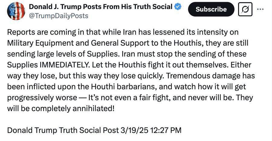 الرئيسية/عالمي ترامب: الحوثيون سيهزمون على أي حال، لكن إذا توقفت طهران عن الدعم، فسوف يهزمون بشكل أسرع.يقرأدقيقة واحدة -الخميس 2025/03/20 - 08:16كود الأخبار:15236يشارك كانت هناك تقارير تفيد بأن إيران خفضت كثافة شحنات المعدات العسكرية والدعم العام للحوثيين كتب الرئيس الأمريكي دونالد ترامب على شبكة التواصل الاجتماعي "تروث سوشيال":كانت هناك تقارير تفيد بأن إيران خفضت كثافة شحناتها من المعدات العسكرية والدعم الشامل للحوثيين، لكنها تواصل إرسال كميات كبيرة من المعدات والإمدادات، وعلى إيران التوقف فورا عن إرسال هذه المعدات. دع الحوثيين يقاتلون بمفردهم.في كلتا الحالتين ، سوف يفشلون ، لكن بهذه الطريقة ، سيفشلون بشكل أسرع. لقد تكبد الحوثيون خسائر فادحة، وسيزداد هذا الاتجاه. كانت هذه المعركة غير متكافئة منذ البداية ولن تكون عادلة أبدا. سيتم تدميرها بالكامل. Take less than a minute, register and share your opinion under this post.Insulting or inciting messages will be deleted.اشتراكالقادم بعد ذلك توم باراك، المبعوث الخاص للولايات المتحدة: الشرق الأوسط ليس سوى وهم.خواندن دقيقة واحدة وول ستريت جورنال: تسعى جميع البلدان إلى نسخ من الطائرات بدون طيار الإيرانيةخواندن دقيقة واحدة ترجمة خطاب ترامب في الأمم المتحدة بشأن إيرانخواندن 0 وزارت الخارجية الأميركية، بمناسبة الذكرى الثالثة لوفاة مهسا (جينا) أميني، أصدرت بياناً قالت فيه إن مستقبل إيران ــ من وجهة نظر الولايات المتحدة ــ قد "نهبته طبقة حاكمة فاسدة".خواندن دقيقة واحدة زعمت مطبوعة أميركية: المدن الصاروخية الإيرانية لم تتضرر جراء الهجمات الإسرائيليةخواندن دقيقة واحدةالأكثر قراءةذكريات أكبر هاشمي رفسنجاني _ 1 اسفند 1378 ولقاء هو بعبدالله جاسبي وقلقه على نتائج الانتخاباتفیلم/أين العمید مرتضى طلاي؟مذكرات أكبر الهاشمي ــ 19 شهريفر 1378ـ استمرت المفاوضات السياسية بين الرجلين مع واز الطبسي حتى اصطحبه إلى طهران، وفي النهاية قرر الهاشمي على ما يبدو أن يخوض انتخابات البرلمان السادس بجدية من هنا.تشير سجلات المجلس الإسلامي الحديثة إلى أن البرلمان ليس رئيس الشؤون ولا يمكنه التدخل أو الموافقة على صلاحيات القائد العام للقوات المسلحة على أي مستوى ناهيك عن الإشراف عليها.ماذا سيحدث لمستقبل إيران مع المرشحين المعلنين للانتخابات الرئاسية؟ / حوار مع الدكتور تقي آزاد ارامكيهل يمكن الشعور بالتعب معك؟تعيين طبيب بيطري من قوا الباسيج رئيساً للشبكة الصحية بدلاً من جراح الأذن والأنف والحنجرة!مذكرات أكبر هاشمي ــ 14 سبتمبر 1378 ــ استمرت لقاءات كبار مديري الجهاز القضائي مع هاشمي رفسنجاني وشكواهم من إهمال رئيس القضاء الجديد هاشمي الشاهرودي.مذكرات أكبر الهاشمي -16 شهريور 1378- التقى الهاشمي مرة أخرى هذه المرة بعد أن التقى الراحل واز الطبسي بجهود عدة لتشجيع الهاشمي على المشاركة في الانتخابات.مذكرات اكبر الهاشمي-18 شهريفر 1378-استمرار جولة الممتلكات والمباني والأعمال في أستان المقدس