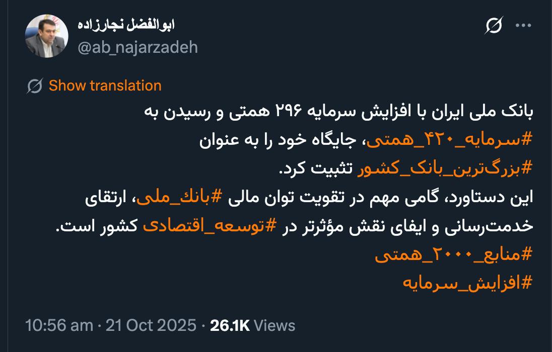 خانه/اقتصادی آقای مدیرعامل بانک ملی ایران درود قدم بعدی در ادغام احتمالی بانک آینده در بانک ملی ایران را برای سپرده گذاران دو بانک بخصوص بانک_آینده ترسیم بفرمایید که نگرانی ها کاهش و التیام یابد.خواندن1 دقیقه -چهارشنبه 1404/07/30 - 23:09کد خبر23163اشتراکگذاری عدم اطلاع رسانی به موقع موجب تشدید شایعات و نگرانی ها میشودبانک ملی ایران با افزایش سرمایه ۲۹۶ همتی و رسیدن به #سرمایه_۴۲۰_همتی، جایگاه خود را به عنوان #بزرگترین_بانک_کشور تثبیت کرد.این دستاورد، گامی مهم در تقویت توان مالی #بانك_ملی، ارتقای خدمترسانی و ایفای نقش مؤثرتر در #توسعه_اقتصادی کشور است.#منابع_۲۰۰۰_همتی#افزایش_سرمایه— ابوالفضل نجارزاده (@ab_najarzadeh) October 21, 2025🔴 آقای مدیرعامل بانک ملی ایراندرود💢قدم بعدی در ادغام احتمالی بانک آینده در بانک ملی ایران را برای سپرده گذاران دو بانک بخصوص #بانک_آینده ترسیم بفرمایید که نگرانی ها کاهش و التیام یابد.🔸عدم اطلاع رسانی به موقع موجب تشدید شایعات و نگرانی ها میشود— AbdiMedia - Abdollah Abdi (@abdolah_abdi) October 22, 2025 کمتر از یک دقیقه زمان بگذارید، ثبتنام کنید و نظرتان را زیر همین پست به اشتراک بگذارید.پیامهای توهینآمیز و یا حاوی دعوت به خشونت حذف خواهند شد.ثبت نامدر ادامه بخوانید کیوان جعفری بازپرس شعبه اول دادسرای کارکنان دولت، محمدهادی سبحانیان رییس کل سازمان امورمالیاتی کشور را از حیث اتهامات...خواندن 1 دقیقه شرکت سرمایه گذاری نفت و گاز زاویه و فرار از مالیات واقعی؟خواندن 2 دقیقه آقای بابک زنجانی از آقای رییس کل بانک مرکزی به دادستان عمومی و انقلاب تهران شکایت کیفری کردید؟ اگر بله دقیقا نتیجه چه بوده؟ اگر خیر چرا؟خواندن 1 دقیقه این همه سر و صدا درباره واردات غیرقانونی طلا توسط بابک زنجانی یادتان هست؟خواندن 1 دقیقه افشاگری عضو شورای عالی انقلاب فرهنگی از سند افتضاح وزارت صمتخواندن 1 دقیقهباید خواندخاطرات اکبر هاشمی - ۱ اسفند ۱۳۷۸ - ملاقات عبدالله جاسبی و نگرانی از نتایج انتخاباتفیلم/ سردار مرتضی طلایی کجاست؟خاطرات اکبر هاشمی - ۱۹ شهريور ۱۳۷۸ - مذاکرات دو نفره سیاسی با واعظ طبسی تا هنگام بدرقه به سوی تهران هم ادامه داشته که در نهایت هاشمی ظاهرا از اینجا تصمیم به شرکت جدی در انتخابات مجلس ششم گرفتسوابق ادوار اخیر مجلس شورای اسلامی نشان داد که مجلس در راس امور نیست و در اختیارات فرمانده کل قوا و نیروهای مسلح در هیچ سطحی نمیتواند دخالت و یا مصوبه طی کند، چه برسد که نظارت کندآینده ایران با نامزدهای اعلام شده انتخابات ریاست جمهوری چه میشود؟ / گفتگو با دکتر تقی آزاد ارمکیمیشه با شما احساس خستگی کرد؟یک دامپزشک بسیجی بجای جراح گوش و حلق و بینی سرپرست شبکه بهداشت ایذه شد!خاطرات اکبر هاشمی - ۱۴ شهريور ۱۳۷۸ - دیدار مدیران ارشد دستگاه قضایی با هاشمی رفسنجانی و گله آنان از بی توجهی هاشمی شاهرودی رییس جدید قوه قضاییه ادامه داردخاطرات اکبر هاشمی - ۱۶ شهريور ۱۳۷۸ - در ادامه تلاش های مرحوم واعظ طبسی که در دیدارهای مکرر برای تشویق هاشمی به شرکت در انتخابات اقدام میکرد این بار هم او با هاشمی ملاقات کردخاطرات اکبر هاشمی - ۱۸ شهريور ۱۳۷۸ - ادامه بازدید ها از متعلقات و ابنیه و آثار آستان قدس