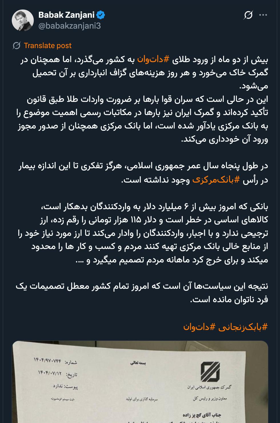 خانه/اقتصادی آقای بابک زنجانی از آقای رییس کل بانک مرکزی به دادستان عمومی و انقلاب تهران شکایت کیفری کردید؟ اگر بله دقیقا نتیجه چه بوده؟ اگر خیر چرا؟خواندن1 دقیقه -چهارشنبه 1404/07/23 - 14:49کد خبر23052اشتراکگذاری تصویر بیش از دو ماه از ورود طلای #داتوان به کشور میگذرد، اما همچنان در گمرک خاک میخورد و هر روز هزینههای گزاف انبارداری بر آن تحمیل میشود.این در حالی است که سران قوا بارها بر ضرورت واردات طلا طبق قانون تأکید کردهاند و گمرک ایران نیز بارها در مکاتبات رسمی اهمیت موضوع را به بانک… pic.twitter.com/Kf4eOIOSpW— Babak Zanjani (@babakzanjani3) October 14, 2025🔴 آقای بابک زنجانیاز آقای رییس کل بانک مرکزی به دادستان عمومی و انقلاب تهران شکایت کیفری کردید؟ اگر بله دقیقا نتیجه چه بوده؟ اگر خیر چرا؟— AbdiMedia - Abdollah Abdi (@abdolah_abdi) October 14, 2025 کمتر از یک دقیقه زمان بگذارید، ثبتنام کنید و نظرتان را زیر همین پست به اشتراک بگذارید.پیامهای توهینآمیز و یا حاوی دعوت به خشونت حذف خواهند شد.ثبت نامدر ادامه بخوانید این همه سر و صدا درباره واردات غیرقانونی طلا توسط بابک زنجانی یادتان هست؟خواندن 1 دقیقه افشاگری عضو شورای عالی انقلاب فرهنگی از سند افتضاح وزارت صمتخواندن 1 دقیقه یادداشتی که بیش از دو سال و نیم پیش در مورد بابک زنجانی نوشته بودمخواندن 1 دقیقه از آن شرکت عزل شدند اما با رایزنی تشریف بردند مدیرعامل یک شرکت جدید شدند.خواندن 1 دقیقه جناب بابک زنجانی درود در مورد این گزارش خلاف واقع که می فرمایید خودتان یا وکیل از سوی شما آیا شکایت کیفری کردید؟ اگر بله نتیجه چه شده؟ اگر خیر چرا؟خواندن 1 دقیقهباید خواندخاطرات اکبر هاشمی - ۱ اسفند ۱۳۷۸ - ملاقات عبدالله جاسبی و نگرانی از نتایج انتخاباتفیلم/ سردار مرتضی طلایی کجاست؟خاطرات اکبر هاشمی - ۱۹ شهريور ۱۳۷۸ - مذاکرات دو نفره سیاسی با واعظ طبسی تا هنگام بدرقه به سوی تهران هم ادامه داشته که در نهایت هاشمی ظاهرا از اینجا تصمیم به شرکت جدی در انتخابات مجلس ششم گرفتسوابق ادوار اخیر مجلس شورای اسلامی نشان داد که مجلس در راس امور نیست و در اختیارات فرمانده کل قوا و نیروهای مسلح در هیچ سطحی نمیتواند دخالت و یا مصوبه طی کند، چه برسد که نظارت کندآینده ایران با نامزدهای اعلام شده انتخابات ریاست جمهوری چه میشود؟ / گفتگو با دکتر تقی آزاد ارمکیمیشه با شما احساس خستگی کرد؟یک دامپزشک بسیجی بجای جراح گوش و حلق و بینی سرپرست شبکه بهداشت ایذه شد!خاطرات اکبر هاشمی - ۱۴ شهريور ۱۳۷۸ - دیدار مدیران ارشد دستگاه قضایی با هاشمی رفسنجانی و گله آنان از بی توجهی هاشمی شاهرودی رییس جدید قوه قضاییه ادامه داردخاطرات اکبر هاشمی - ۱۶ شهريور ۱۳۷۸ - در ادامه تلاش های مرحوم واعظ طبسی که در دیدارهای مکرر برای تشویق هاشمی به شرکت در انتخابات اقدام میکرد این بار هم او با هاشمی ملاقات کردخاطرات اکبر هاشمی - ۱۸ شهريور ۱۳۷۸ - ادامه بازدید ها از متعلقات و ابنیه و آثار آستان قدس