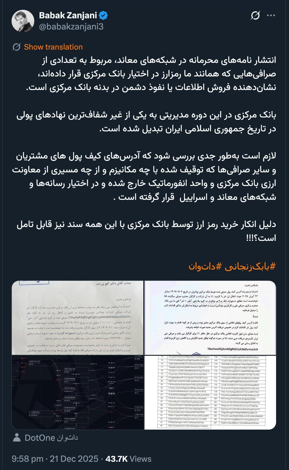 خانه/اقتصادیمدتی پیش سربسته در مورد رمز ارزها در پرونده اتهامی گروه مالی زاویه به مسئولان ارشد کشور علنی هشدار دادم خواندن1 دقیقه -پنجشنبه 1404/10/04 - 00:38کد خبر24015اشتراکگذاری که اکنون بابک زنجانی صرف نظر از صحت و سقم و جزییات آن به موضوع اشاره کرده است. جالب است بدانید تا همین الان وضعیت فعالیت رمزهای گروه مالی زاویه مانند فرار مالیاتی آنها مشخص نشد که نشد.⭕️ #ویژه - مدتی پیش #سربسته در مورد #رمز_ارزها در پرونده اتهامی #گروه_مالی_زاویه به مسئولان ارشد کشور علنی هشدار دادم @mrfarzin_ir @hadi_sobhanian @shadanews_ir https://t.co/snPPPMXjBD💢که اکنون بابک زنجانی صرف نظر از صحت و سقم و جزییات آن به موضوع اشاره کرده است.📌جالب است… https://t.co/0qIgSfsuzA— AbdiMedia - Abdollah Abdi (@abdolah_abdi) December 22, 2025 کمتر از یک دقیقه زمان بگذارید، ثبتنام کنید و نظرتان را زیر همین پست به اشتراک بگذارید.پیامهای توهینآمیز و یا حاوی دعوت به خشونت حذف خواهند شد.ثبت نامدر ادامه بخوانید آقای مدیر عامل خبرگزاری میزان درودخواندن 1 دقیقه تسریع در استرداد مالیات بر ارزش افزوده صادر کنندگان کالاخواندن 1 دقیقه رابطه و نظارت بانک مرکزی و هیات عالی نظارت آن با صندوق های پژوهش و فناوریخواندن 2 دقیقه غفلت از مبارزه ومقابله با پولشویی در صندوقهای پژوهش وفناوریخواندن 1 دقیقه عزل مدیرعامل یکی از شرکتهای زیرمجموعه چادرملو به علت دریافتی نامتعارفخواندن 1 دقیقهباید خواندخاطرات اکبر هاشمی - ۱ اسفند ۱۳۷۸ - ملاقات عبدالله جاسبی و نگرانی از نتایج انتخاباتفیلم/ سردار مرتضی طلایی کجاست؟خاطرات اکبر هاشمی - ۱۹ شهريور ۱۳۷۸ - مذاکرات دو نفره سیاسی با واعظ طبسی تا هنگام بدرقه به سوی تهران هم ادامه داشته که در نهایت هاشمی ظاهرا از اینجا تصمیم به شرکت جدی در انتخابات مجلس ششم گرفتسوابق ادوار اخیر مجلس شورای اسلامی نشان داد که مجلس در راس امور نیست و در اختیارات فرمانده کل قوا و نیروهای مسلح در هیچ سطحی نمیتواند دخالت و یا مصوبه طی کند، چه برسد که نظارت کندآینده ایران با نامزدهای اعلام شده انتخابات ریاست جمهوری چه میشود؟ / گفتگو با دکتر تقی آزاد ارمکیمیشه با شما احساس خستگی کرد؟یک دامپزشک بسیجی بجای جراح گوش و حلق و بینی سرپرست شبکه بهداشت ایذه شد!خاطرات اکبر هاشمی - ۱۴ شهريور ۱۳۷۸ - دیدار مدیران ارشد دستگاه قضایی با هاشمی رفسنجانی و گله آنان از بی توجهی هاشمی شاهرودی رییس جدید قوه قضاییه ادامه داردخاطرات اکبر هاشمی - ۱۶ شهريور ۱۳۷۸ - در ادامه تلاش های مرحوم واعظ طبسی که در دیدارهای مکرر برای تشویق هاشمی به شرکت در انتخابات اقدام میکرد این بار هم او با هاشمی ملاقات کردخاطرات اکبر هاشمی - ۱۸ شهريور ۱۳۷۸ - ادامه بازدید ها از متعلقات و ابنیه و آثار آستان قدس