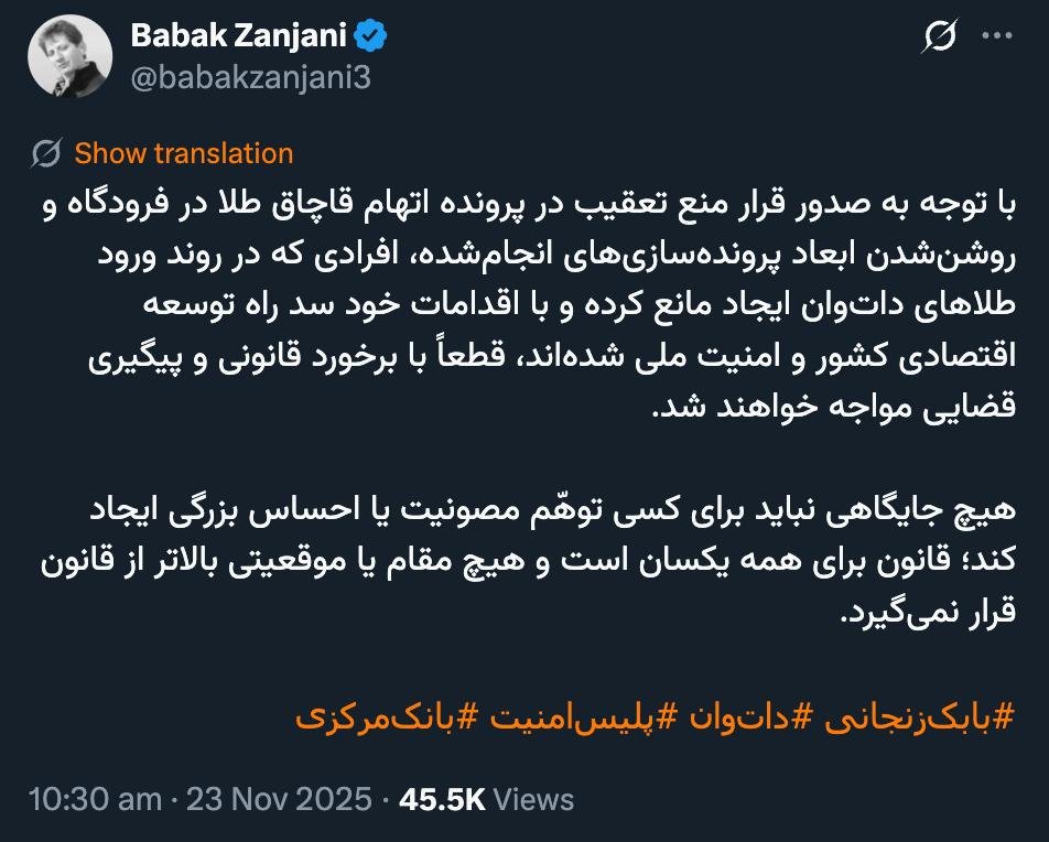 خانه/اقتصادی آقای زنجانی درود با قطعیت قرار منع تعقیب صادره میشود. عینا آن را منتشر کنید تا مبانی و استدلال مقام قضایی رسیدگی کننده هم مشخص و شفاف تر شود؟خواندن1 دقیقه -دوشنبه 1404/09/03 - 11:59کد خبر23681اشتراکگذاری با توجه به صدور قرار منع تعقیب در پرونده اتهام قاچاق طلا در فرودگاه و روشنشدن ابعاد پروندهسازیهای انجامشده، افرادی که در روند ورود طلاهای داتوان ایجاد مانع کرده و با اقدامات خود سد راه توسعه اقتصادی کشور و امنیت ملی شدهاند، قطعاً با برخورد قانونی و پیگیری قضایی مواجه…— Babak Zanjani (@babakzanjani3) November 23, 2025🔴 آقای زنجانیدرود💢 با قطعیت قرار منع تعقیب صادره میشود. عینا آن را منتشر کنید تا مبانی و استدلال مقام قضایی رسیدگی کننده هم مشخص و شفاف تر شود؟— AbdiMedia - Abdollah Abdi (@abdolah_abdi) November 23, 2025 کمتر از یک دقیقه زمان بگذارید، ثبتنام کنید و نظرتان را زیر همین پست به اشتراک بگذارید.پیامهای توهینآمیز و یا حاوی دعوت به خشونت حذف خواهند شد.ثبت نامدر ادامه بخوانید با مقام های عالی رتبه وزارت نفت هم در ارتباط نیست؟خواندن 1 دقیقه عباس عبدی،فیاض زاهد و محمد مهاجری:یکبار برای همیشه،انرژی را به مردم بدهید و قیمت را به خودشان بسپارید/این چه جهلی است که قیمت بنزین را ۲۰۰۰ تومان میداندخواندن 1 دقیقه ورود مرکز اطلاعات مالی به جابهجایی ۱۱ هزار میلیارد تومان پول توسط یک قاچاقچیخواندن 1 دقیقه مهدی اخوان مشایخی هم خیلی اتفاقی و طبیعی از ریاست سازمان حراست صنعت نفت رفتخواندن 1 دقیقه ارجاع قابل تامل رییس دفتر رئیسجمهور به وزیر اقتصاد و داراییخواندن 1 دقیقهباید خواندخاطرات اکبر هاشمی - ۱ اسفند ۱۳۷۸ - ملاقات عبدالله جاسبی و نگرانی از نتایج انتخاباتفیلم/ سردار مرتضی طلایی کجاست؟خاطرات اکبر هاشمی - ۱۹ شهريور ۱۳۷۸ - مذاکرات دو نفره سیاسی با واعظ طبسی تا هنگام بدرقه به سوی تهران هم ادامه داشته که در نهایت هاشمی ظاهرا از اینجا تصمیم به شرکت جدی در انتخابات مجلس ششم گرفتسوابق ادوار اخیر مجلس شورای اسلامی نشان داد که مجلس در راس امور نیست و در اختیارات فرمانده کل قوا و نیروهای مسلح در هیچ سطحی نمیتواند دخالت و یا مصوبه طی کند، چه برسد که نظارت کندآینده ایران با نامزدهای اعلام شده انتخابات ریاست جمهوری چه میشود؟ / گفتگو با دکتر تقی آزاد ارمکیمیشه با شما احساس خستگی کرد؟یک دامپزشک بسیجی بجای جراح گوش و حلق و بینی سرپرست شبکه بهداشت ایذه شد!خاطرات اکبر هاشمی - ۱۴ شهريور ۱۳۷۸ - دیدار مدیران ارشد دستگاه قضایی با هاشمی رفسنجانی و گله آنان از بی توجهی هاشمی شاهرودی رییس جدید قوه قضاییه ادامه داردخاطرات اکبر هاشمی - ۱۶ شهريور ۱۳۷۸ - در ادامه تلاش های مرحوم واعظ طبسی که در دیدارهای مکرر برای تشویق هاشمی به شرکت در انتخابات اقدام میکرد این بار هم او با هاشمی ملاقات کردخاطرات اکبر هاشمی - ۱۸ شهريور ۱۳۷۸ - ادامه بازدید ها از متعلقات و ابنیه و آثار آستان قدس