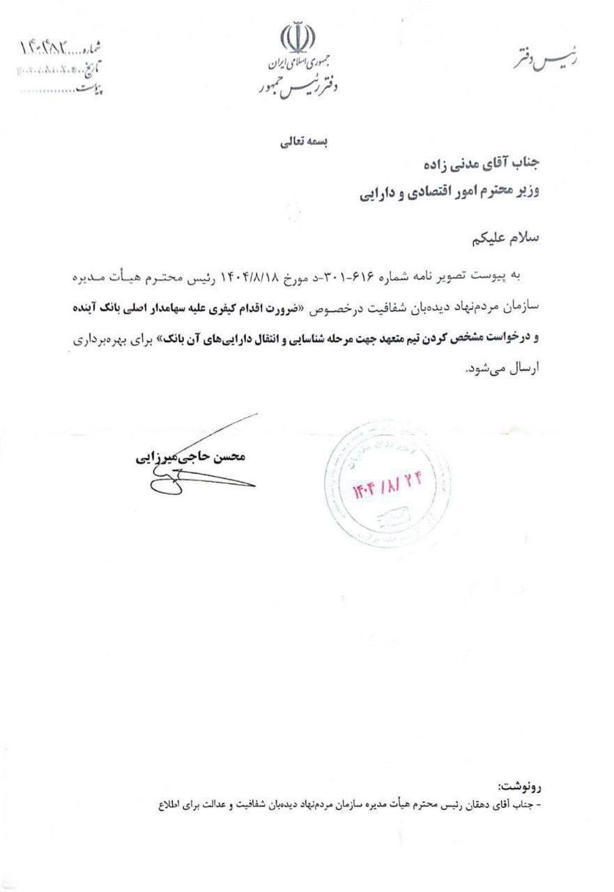 خانه/اقتصادی ارجاع قابل تامل رییس دفتر رئیسجمهور به وزیر اقتصاد و داراییخواندن1 دقیقه -یکشنبه 1404/09/02 - 13:27کد خبر23655اشتراکگذاری دفتر رئیسجمهور با ارسال نامهای به وزیر امور اقتصادی و دارایی، پیشنهاد «اقدام کیفری علیه سهامدار اصلی بانک آینده» دفتر رئیسجمهور با ارسال نامهای به وزیر امور اقتصادی و دارایی، پیشنهاد «اقدام کیفری علیه سهامدار اصلی بانک آینده» و «تشکیل تیم متعهد برای شناسایی و انتقال داراییهای این بانک» را با قید برای_بهره_برداری بدون اینکه حتی نتیجه را هم از این وزارت خانه بخواهد، ارجاع کرد.زیبا نیست؟ کمتر از یک دقیقه زمان بگذارید، ثبتنام کنید و نظرتان را زیر همین پست به اشتراک بگذارید.پیامهای توهینآمیز و یا حاوی دعوت به خشونت حذف خواهند شد.ثبت نامدر ادامه بخوانید عباس عبدی،فیاض زاهد و محمد مهاجری:یکبار برای همیشه،انرژی را به مردم بدهید و قیمت را به خودشان بسپارید/این چه جهلی است که قیمت بنزین را ۲۰۰۰ تومان میداندخواندن 1 دقیقه ورود مرکز اطلاعات مالی به جابهجایی ۱۱ هزار میلیارد تومان پول توسط یک قاچاقچیخواندن 1 دقیقه مهدی اخوان مشایخی هم خیلی اتفاقی و طبیعی از ریاست سازمان حراست صنعت نفت رفتخواندن 1 دقیقه پس از صدور قرار منع تعقیب برای رییس کل سازمان امور مالیاتی کشور و قطعیت آن در دادگاه کارکنان دولت؛ این بار صدور قرار منع تعقیب برای رییس مرکز بازرسی، مبارزه با پولشویی و فرار مالیاتی این سازمانخواندن 1 دقیقه مرکز اطلاعات مالی در راستای بهبود شفافیت در اقتصاد کشور چه اقداماتی انجام داد؟خواندن 4 دقیقهباید خواندخاطرات اکبر هاشمی - ۱ اسفند ۱۳۷۸ - ملاقات عبدالله جاسبی و نگرانی از نتایج انتخاباتفیلم/ سردار مرتضی طلایی کجاست؟خاطرات اکبر هاشمی - ۱۹ شهريور ۱۳۷۸ - مذاکرات دو نفره سیاسی با واعظ طبسی تا هنگام بدرقه به سوی تهران هم ادامه داشته که در نهایت هاشمی ظاهرا از اینجا تصمیم به شرکت جدی در انتخابات مجلس ششم گرفتسوابق ادوار اخیر مجلس شورای اسلامی نشان داد که مجلس در راس امور نیست و در اختیارات فرمانده کل قوا و نیروهای مسلح در هیچ سطحی نمیتواند دخالت و یا مصوبه طی کند، چه برسد که نظارت کندآینده ایران با نامزدهای اعلام شده انتخابات ریاست جمهوری چه میشود؟ / گفتگو با دکتر تقی آزاد ارمکیمیشه با شما احساس خستگی کرد؟یک دامپزشک بسیجی بجای جراح گوش و حلق و بینی سرپرست شبکه بهداشت ایذه شد!خاطرات اکبر هاشمی - ۱۴ شهريور ۱۳۷۸ - دیدار مدیران ارشد دستگاه قضایی با هاشمی رفسنجانی و گله آنان از بی توجهی هاشمی شاهرودی رییس جدید قوه قضاییه ادامه داردخاطرات اکبر هاشمی - ۱۶ شهريور ۱۳۷۸ - در ادامه تلاش های مرحوم واعظ طبسی که در دیدارهای مکرر برای تشویق هاشمی به شرکت در انتخابات اقدام میکرد این بار هم او با هاشمی ملاقات کردخاطرات اکبر هاشمی - ۱۸ شهريور ۱۳۷۸ - ادامه بازدید ها از متعلقات و ابنیه و آثار آستان قدس