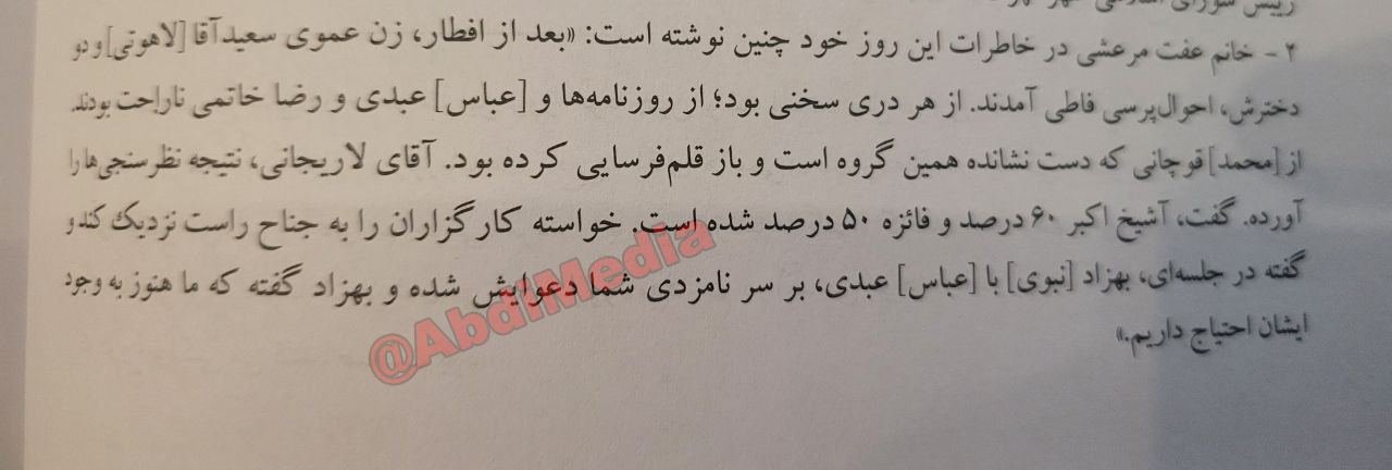 Home/Akbar Hashemi RafsanjaniPart of the memories of 2000 January 6, Efat MarashiRead1 minute -Thursday 2024/09/12 - 13:41News Code:693Share Efat Marashi writes about her displeasure with Abbas Abdi, Mohammad Reza Khatami and Mohammad Quchani.How strange, Mohammad Quchani, who wrote articles against the Hashemites, brought him close to the construction agents and he became a member of their central council. Take less than a minute, register and share your opinion under this post.Insulting or inciting messages will be deleted.Sign UpComming Up Next Memories of Akbar Hashemi, 20th January 2002خواندن 3 minutes Akbar Hashemi's Memoirs - January 1خواندن 3 minutes Akbar Hashemi's Memoirs - December 19, 2002خواندن 2 minutes Akbar Hashemi's Memoirs - December 18, 2002خواندن 2 minutes Akbar Hashemi's Memoirs - December 17, 2002خواندن 2 minutesMost ReadMemories of Akbar Hashemi - February 20, 2000 - Meeting with Abdullah Jasbi and Concerns About Election ResultsMovie / Where is Commander Morteza Talaie?Akbar Hashemi's memoirs - 1999 September 10 - The two-person political negotiations with Vaez Tabasi continued until he was escorted to Tehran, where Hashemi apparently decided to seriously participate in the sixth parliamentary elections.The records of the recent periods of the Islamic Council showed that the parliament is not in charge of affairs and cannot interfere or pass resolutions on the authority of the Commander-in-Chief of the Armed Forces at any level, let alone supervise.What will be the future of Iran with the announced candidates for the presidential election? / Conversation with Dr. Taghi Azad AramakiCan I feel tired with you?A Basiji veterinarian was appointed head of the health network instead of an otolaryngologist.Akbar Hashemi's memoirs - 1999 September 5 - The meeting of the senior managers of the judiciary with Hashemi Rafsanjani and their complaint about the neglect of Hashemi Shahroudi, the new head of the judiciary, continues.Memories of Akbar Hashemi - 1999 September 7 - In continuation of the efforts of the late Vaez Tabasi, who used to encourage Hashemi to participate in the elections in frequent meetings, this time he also met with Hashemi.Akbar Hashemi's memories - 1999 September 9 - Continued visits to the belongings, buildings and works of Astan Quds