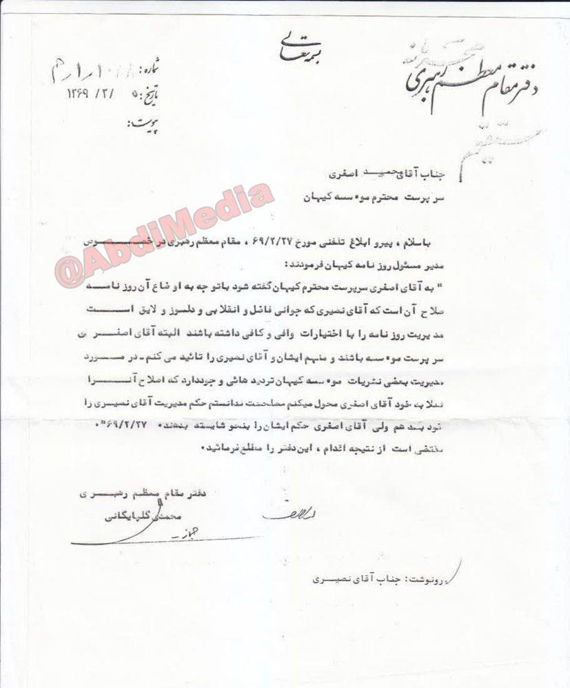 Home/Ayatollah KhameneiMehdi Nasiri from Ayatollah Khamenei's point of view is classified in a letterRead1 minute -Thursday 2024/09/26 - 14:59News Code:2531Share The written notification of Ayatollah Khamenei's will in June 1990 for full support of Mehdi Nasiri at Keyhan Institute following the previous telephone notification.This communication was addressed to Dr. Seyed Mohammad Asghari, the head of this institution at the time, by the office of the leader of the Islamic Republic, who had determined that it should be directly communicated confidentially.This communication has extremely important historical points.And the passage of Mehdi Nasiri's life from the past to the present... Take less than a minute, register and share your opinion under this post.Insulting or inciting messages will be deleted.Sign UpComming Up Next Mr. Parsai, greetings againخواندن 1 minute End of footnotes, Ayatollah Khamenei emphasized and confirmed the statements of Masoud Pezeshkian in the public meeting of the vote of confidence regarding full coordination with her, under the title of "Consultation".خواندن 1 minute Dr. Ali Akbar Gurji and a detailed legal look at today's statements of Ayatollah Khamenei in the meeting with the governmentخواندن 0 The leader of the Islamic Republic traveled a considerable distance without holding a cane (which is a demonstration of his health and authority) and cast his vote in the ballot boxخواندن 0 Ayatollah Khamenei from leaving the house to the end of votingخواندن 0Most ReadMemories of Akbar Hashemi - February 20, 2000 - Meeting with Abdullah Jasbi and Concerns About Election ResultsMovie / Where is Commander Morteza Talaie?Akbar Hashemi's memoirs - 1999 September 10 - The two-person political negotiations with Vaez Tabasi continued until he was escorted to Tehran, where Hashemi apparently decided to seriously participate in the sixth parliamentary elections.The records of the recent periods of the Islamic Council showed that the parliament is not in charge of affairs and cannot interfere or pass resolutions on the authority of the Commander-in-Chief of the Armed Forces at any level, let alone supervise.What will be the future of Iran with the announced candidates for the presidential election? / Conversation with Dr. Taghi Azad AramakiCan I feel tired with you?A Basiji veterinarian was appointed head of the health network instead of an otolaryngologist.Akbar Hashemi's memoirs - 1999 September 5 - The meeting of the senior managers of the judiciary with Hashemi Rafsanjani and their complaint about the neglect of Hashemi Shahroudi, the new head of the judiciary, continues.Memories of Akbar Hashemi - 1999 September 7 - In continuation of the efforts of the late Vaez Tabasi, who used to encourage Hashemi to participate in the elections in frequent meetings, this time he also met with Hashemi.Akbar Hashemi's memories - 1999 September 9 - Continued visits to the belongings, buildings and works of Astan Quds