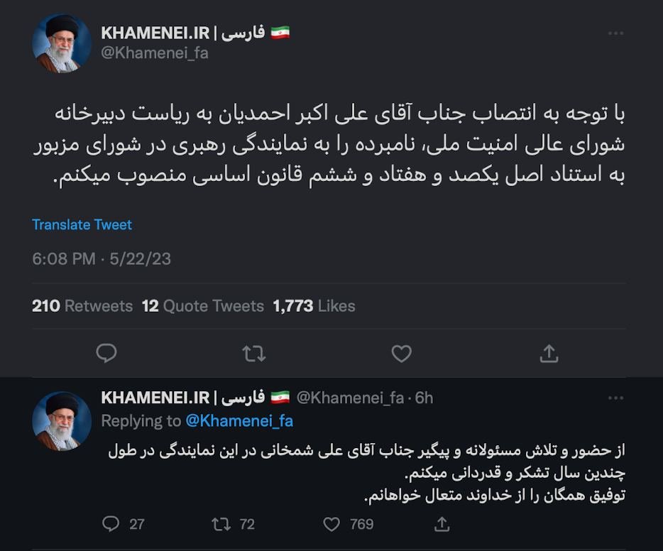 Home/Ayatollah KhameneiPay attention to Ayatollah Khamenei's reconfirmed tweetRead1 minute -Thursday 2024/10/03 - 01:35News Code:3372Share His ruling without directly addressing Ali Akbar Ahmadian and Ravi's emphasis regarding the appointment of "Mr. Sir" instead of "military title" by the Commander in Chief and also without the usual title "Secretary of the Supreme National Security Council" and the use of the phrase "Head of the Secretariat" Supreme National Security Council" is given.Although both titles are almost the same, does the emphasis on this phrase "side" indirectly indicate the agility and miniaturization of Shaam's secretariat?I emphasize that Ali Shamkhani's "real" membership in the Council of Expediency and his non-transfer to the Commander-in-Chief's Military Advisers Group, as well as the inclusion of Shamkhani as a "political advisor" in the appointment order, despite the crude and crude speculations about Shamkhani, are a sign of He has the support and trust of Ayatollah Khamenei. And I will play a greater role in the country's politics.Again, I emphasize to pay more attention to the clear and obvious signs and pay attention to the Ayatollah's usual procedures and his previous measures, so that later... Take less than a minute, register and share your opinion under this post.Insulting or inciting messages will be deleted.Sign UpComming Up Next Mr. Parsai, greetings againخواندن 1 minute End of footnotes, Ayatollah Khamenei emphasized and confirmed the statements of Masoud Pezeshkian in the public meeting of the vote of confidence regarding full coordination with her, under the title of "Consultation".خواندن 1 minute Dr. Ali Akbar Gurji and a detailed legal look at today's statements of Ayatollah Khamenei in the meeting with the governmentخواندن 0 The leader of the Islamic Republic traveled a considerable distance without holding a cane (which is a demonstration of his health and authority) and cast his vote in the ballot boxخواندن 0 Ayatollah Khamenei from leaving the house to the end of votingخواندن 0Most ReadMemories of Akbar Hashemi - February 20, 2000 - Meeting with Abdullah Jasbi and Concerns About Election ResultsMovie / Where is Commander Morteza Talaie?Akbar Hashemi's memoirs - 1999 September 10 - The two-person political negotiations with Vaez Tabasi continued until he was escorted to Tehran, where Hashemi apparently decided to seriously participate in the sixth parliamentary elections.The records of the recent periods of the Islamic Council showed that the parliament is not in charge of affairs and cannot interfere or pass resolutions on the authority of the Commander-in-Chief of the Armed Forces at any level, let alone supervise.What will be the future of Iran with the announced candidates for the presidential election? / Conversation with Dr. Taghi Azad AramakiCan I feel tired with you?A Basiji veterinarian was appointed head of the health network instead of an otolaryngologist.Akbar Hashemi's memoirs - 1999 September 5 - The meeting of the senior managers of the judiciary with Hashemi Rafsanjani and their complaint about the neglect of Hashemi Shahroudi, the new head of the judiciary, continues.Memories of Akbar Hashemi - 1999 September 7 - In continuation of the efforts of the late Vaez Tabasi, who used to encourage Hashemi to participate in the elections in frequent meetings, this time he also met with Hashemi.Akbar Hashemi's memories - 1999 September 9 - Continued visits to the belongings, buildings and works of Astan Quds
