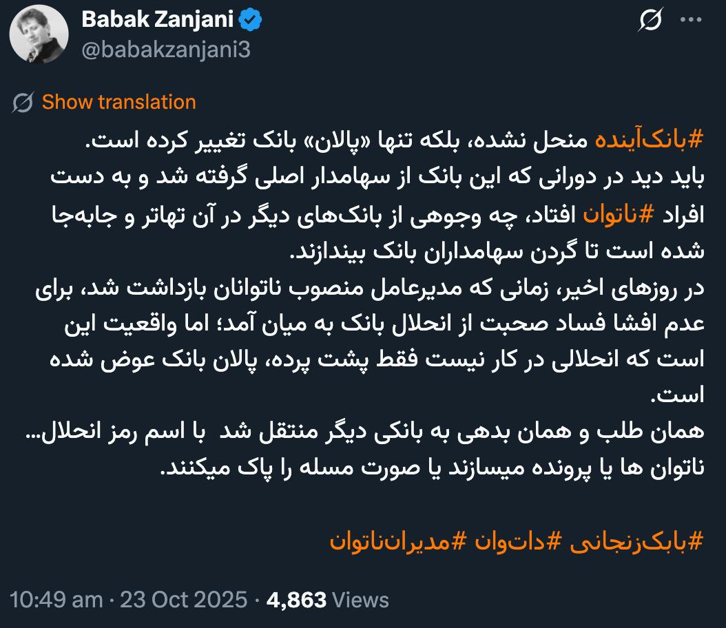 Home/EconomicMr. Babak Zanjani, who will finally be able to state the reality of this bank and other possible credit institutions?Read1 minute -Friday 2025/10/24 - 00:14News Code:23185Share Why is everyone talking to Ima Washare?!!#بانکآینده منحل نشده، بلکه تنها «پالان» بانک تغییر کرده است.باید دید در دورانی که این بانک از سهامدار اصلی گرفته شد و به دست افراد #ناتوان افتاد، چه وجوهی از بانکهای دیگر در آن تهاتر و جابهجا شده است تا گردن سهامداران بانک بیندازند.در روزهای اخیر، زمانی که مدیرعامل منصوب…— Babak Zanjani (@babakzanjani3) October 23, 2025🔴 آقای بابک زنجانیبالاخره چه کسی توان خواهد داشت تا #واقعیت این بانک و موسسات اعتباری #محتمل دیگر را بیان کند؟https://t.co/a0ndTPDkhG 🔸چرا همه با ایما واشاره سخن میگویند؟!!— AbdiMedia - Abdollah Abdi (@abdolah_abdi) October 23, 2025Related news Today's thought-provoking message from Ali Ansari to the staff of Ayandeh Bank Take less than a minute, register and share your opinion under this post.Insulting or inciting messages will be deleted.Sign UpComming Up Next He was right, he had a future. It is not clear where the accumulated losses are? No one will take responsibility.خواندن 1 minute Mr. Manzoor, greetings, Mr. Deputy of the Central Bank, and other officials active in cyberspace, how can they claim that the accumulated losses are not transferred to the Meli Bank?خواندن 1 minute Finally, did the Central Bank fulfill its legal obligations and powers, or was this action, whatever it is called, a merger or dissolution or.... a decision by the heads of the three branches of government?!!!خواندن 1 minute Hamidreza Ghani Abadi: Indeh Bank has not yet been dissolved or merged, it is in a transitional phase.خواندن 1 minute Will Kasri Nouri, the advisor to the minister and director general of the ministerial office of the Ministry of Oil, step aside from this responsibility too casually?خواندن 1 minuteMost ReadMemories of Akbar Hashemi - February 20, 2000 - Meeting with Abdullah Jasbi and Concerns About Election ResultsMovie / Where is Commander Morteza Talaie?Akbar Hashemi's memoirs - 1999 September 10 - The two-person political negotiations with Vaez Tabasi continued until he was escorted to Tehran, where Hashemi apparently decided to seriously participate in the sixth parliamentary elections.The records of the recent periods of the Islamic Council showed that the parliament is not in charge of affairs and cannot interfere or pass resolutions on the authority of the Commander-in-Chief of the Armed Forces at any level, let alone supervise.What will be the future of Iran with the announced candidates for the presidential election? / Conversation with Dr. Taghi Azad AramakiCan I feel tired with you?A Basiji veterinarian was appointed head of the health network instead of an otolaryngologist.Akbar Hashemi's memoirs - 1999 September 5 - The meeting of the senior managers of the judiciary with Hashemi Rafsanjani and their complaint about the neglect of Hashemi Shahroudi, the new head of the judiciary, continues.Memories of Akbar Hashemi - 1999 September 7 - In continuation of the efforts of the late Vaez Tabasi, who used to encourage Hashemi to participate in the elections in frequent meetings, this time he also met with Hashemi.Akbar Hashemi's memories - 1999 September 9 - Continued visits to the belongings, buildings and works of Astan Quds