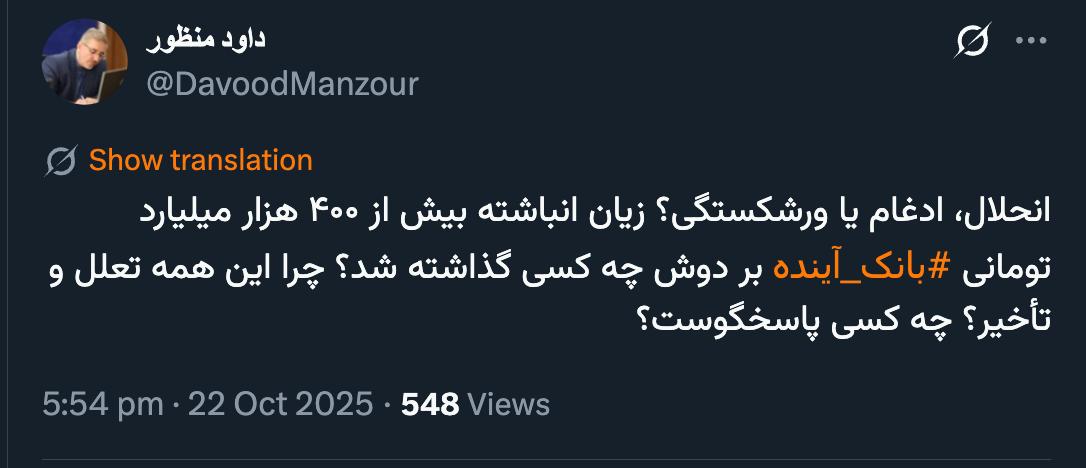 Home/EconomicMr. Manzoor, greetings, Mr. Deputy of the Central Bank, and other officials active in cyberspace, how can they claim that the accumulated losses are not transferred to the Meli Bank?Read1 minute -Friday 2025/10/24 - 01:06News Code:23198Share What exactly is this loss?انحلال، ادغام یا ورشکستگی؟ زیان انباشته بیش از ۴۰۰ هزار میلیارد تومانی #بانک_آینده بر دوش چه کسی گذاشته شد؟ چرا این همه تعلل و تأخیر؟ چه کسی پاسخگوست؟— داود منظور (@DavoodManzour) October 22, 2025🔴 آقای منظور؛ درود💢آقای معاون بانک مرکزی و سایر مسئولان فعال در فضای مجازی چگونه مدعی هستند زیان انباشته به بانک ملی منتقل نمیشود؟🔸واقعاً این زیان چه میشود؟— AbdiMedia - Abdollah Abdi (@abdolah_abdi) October 23, 2025 Take less than a minute, register and share your opinion under this post.Insulting or inciting messages will be deleted.Sign UpComming Up Next He was right, he had a future. It is not clear where the accumulated losses are? No one will take responsibility.خواندن 1 minute Finally, did the Central Bank fulfill its legal obligations and powers, or was this action, whatever it is called, a merger or dissolution or.... a decision by the heads of the three branches of government?!!!خواندن 1 minute Hamidreza Ghani Abadi: Indeh Bank has not yet been dissolved or merged, it is in a transitional phase.خواندن 1 minute Will Kasri Nouri, the advisor to the minister and director general of the ministerial office of the Ministry of Oil, step aside from this responsibility too casually?خواندن 1 minute Mr. Babak Zanjani, who will finally be able to state the reality of this bank and other possible credit institutions?خواندن 1 minuteMost ReadMemories of Akbar Hashemi - February 20, 2000 - Meeting with Abdullah Jasbi and Concerns About Election ResultsMovie / Where is Commander Morteza Talaie?Akbar Hashemi's memoirs - 1999 September 10 - The two-person political negotiations with Vaez Tabasi continued until he was escorted to Tehran, where Hashemi apparently decided to seriously participate in the sixth parliamentary elections.The records of the recent periods of the Islamic Council showed that the parliament is not in charge of affairs and cannot interfere or pass resolutions on the authority of the Commander-in-Chief of the Armed Forces at any level, let alone supervise.What will be the future of Iran with the announced candidates for the presidential election? / Conversation with Dr. Taghi Azad AramakiCan I feel tired with you?A Basiji veterinarian was appointed head of the health network instead of an otolaryngologist.Akbar Hashemi's memoirs - 1999 September 5 - The meeting of the senior managers of the judiciary with Hashemi Rafsanjani and their complaint about the neglect of Hashemi Shahroudi, the new head of the judiciary, continues.Memories of Akbar Hashemi - 1999 September 7 - In continuation of the efforts of the late Vaez Tabasi, who used to encourage Hashemi to participate in the elections in frequent meetings, this time he also met with Hashemi.Akbar Hashemi's memories - 1999 September 9 - Continued visits to the belongings, buildings and works of Astan Quds