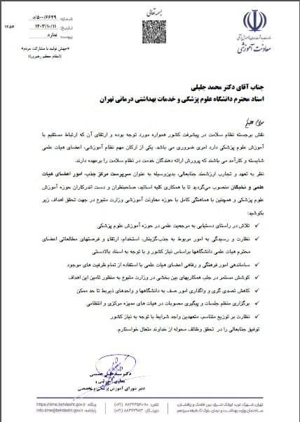 Home/Health and treatmentBy the decree of the Deputy Minister of Education of the Ministry of Health, Dr. Mohammad Jalili, a professor at Tehran University of Medical Sciences, was appointed as the head of the Center for Recruitment, Faculty Members' Affairs and ElitesRead0 -Tuesday 2024/12/31 - 15:55News Code:11023Share Take less than a minute, register and share your opinion under this post.Insulting or inciting messages will be deleted.Sign UpComming Up Next It is noteworthy that Mr. President, Mr. Minister of Health, Medical Education, and the Governor of Isfahan are you aware of this claim?خواندن 0 Dr. Seyed Mohammad Mirkhani, Social and Parliamentary Deputy of the Medical System Organization, responded sharply to Sheikh Abbas Tabrizian's claim: "Your hands are stained with people's blood during the Corona eraخواندن 0 Yesterday, a group of families of patients with the rare disease Cystinosis gathered in front of the Ministry of Health due to the sharp price increase of the foreign medication for this disease.خواندن 1 minute Untold stories from the dissection hall; is justice being served for the departed?خواندن 2 minutes The last state of the outbreak of the fever of Dengie; The presence of Aisdas mosquito in Gilanخواندن 1 minuteMost ReadMemories of Akbar Hashemi - February 20, 2000 - Meeting with Abdullah Jasbi and Concerns About Election ResultsMovie / Where is Commander Morteza Talaie?Akbar Hashemi's memoirs - 1999 September 10 - The two-person political negotiations with Vaez Tabasi continued until he was escorted to Tehran, where Hashemi apparently decided to seriously participate in the sixth parliamentary elections.The records of the recent periods of the Islamic Council showed that the parliament is not in charge of affairs and cannot interfere or pass resolutions on the authority of the Commander-in-Chief of the Armed Forces at any level, let alone supervise.What will be the future of Iran with the announced candidates for the presidential election? / Conversation with Dr. Taghi Azad AramakiCan I feel tired with you?A Basiji veterinarian was appointed head of the health network instead of an otolaryngologist.Akbar Hashemi's memoirs - 1999 September 5 - The meeting of the senior managers of the judiciary with Hashemi Rafsanjani and their complaint about the neglect of Hashemi Shahroudi, the new head of the judiciary, continues.Memories of Akbar Hashemi - 1999 September 7 - In continuation of the efforts of the late Vaez Tabasi, who used to encourage Hashemi to participate in the elections in frequent meetings, this time he also met with Hashemi.Akbar Hashemi's memories - 1999 September 9 - Continued visits to the belongings, buildings and works of Astan Quds