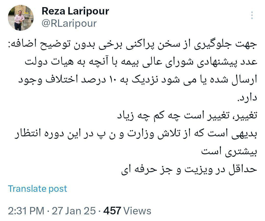 Home/Health and treatment Tweet by Dr. Reza Laripour, Technical and Supervision Deputy of the Medical Council Organization in Complement of the Previous TweetRead1 minute -Tuesday 2025/01/28 - 00:23News Code:12492Share Reza Laripour, who yesterday announced the re-manipulation of the tariff proposed by the Supreme Council of Health Insurance in the Planning and Budget Organization Reza Laripour, who yesterday announced the re-manipulation of the tariff proposed by the Supreme Council of Health Insurance in the Planning and Budget Organization and called the situation "deplorable", wrote in conclusion on Channel X:In order to prevent some people from spreading rumors, without further explanation:There is a difference of nearly 10 percent between the number proposed by the Supreme Council of Insurance and what has been or will be sent to the Cabinet of Ministers.Change is change, whether it is a little or a lot.Obviously, more is expected from the efforts of the ministry and the NP (medical system) in this period, at least in the visits and the professional component Related news Strange Statements of the Technical Deputy of the General Medical Council Organization Take less than a minute, register and share your opinion under this post.Insulting or inciting messages will be deleted.Sign UpComming Up Next It is noteworthy that Mr. President, Mr. Minister of Health, Medical Education, and the Governor of Isfahan are you aware of this claim?خواندن 0 Dr. Seyed Mohammad Mirkhani, Social and Parliamentary Deputy of the Medical System Organization, responded sharply to Sheikh Abbas Tabrizian's claim: "Your hands are stained with people's blood during the Corona eraخواندن 0 Yesterday, a group of families of patients with the rare disease Cystinosis gathered in front of the Ministry of Health due to the sharp price increase of the foreign medication for this disease.خواندن 1 minute Untold stories from the dissection hall; is justice being served for the departed?خواندن 2 minutes The last state of the outbreak of the fever of Dengie; The presence of Aisdas mosquito in Gilanخواندن 1 minuteMost ReadMemories of Akbar Hashemi - February 20, 2000 - Meeting with Abdullah Jasbi and Concerns About Election ResultsMovie / Where is Commander Morteza Talaie?Akbar Hashemi's memoirs - 1999 September 10 - The two-person political negotiations with Vaez Tabasi continued until he was escorted to Tehran, where Hashemi apparently decided to seriously participate in the sixth parliamentary elections.The records of the recent periods of the Islamic Council showed that the parliament is not in charge of affairs and cannot interfere or pass resolutions on the authority of the Commander-in-Chief of the Armed Forces at any level, let alone supervise.What will be the future of Iran with the announced candidates for the presidential election? / Conversation with Dr. Taghi Azad AramakiCan I feel tired with you?A Basiji veterinarian was appointed head of the health network instead of an otolaryngologist.Akbar Hashemi's memoirs - 1999 September 5 - The meeting of the senior managers of the judiciary with Hashemi Rafsanjani and their complaint about the neglect of Hashemi Shahroudi, the new head of the judiciary, continues.Memories of Akbar Hashemi - 1999 September 7 - In continuation of the efforts of the late Vaez Tabasi, who used to encourage Hashemi to participate in the elections in frequent meetings, this time he also met with Hashemi.Akbar Hashemi's memories - 1999 September 9 - Continued visits to the belongings, buildings and works of Astan Quds