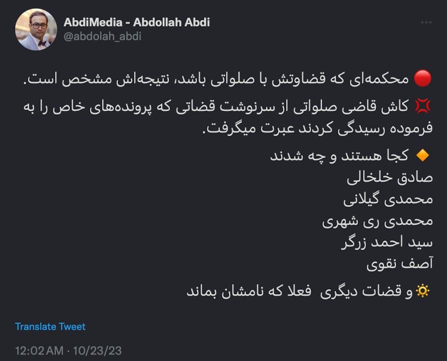 Home/PoliticsA court whose judgment is based on prayer, the outcome is clear.Read1 minute -Thursday 2024/10/24 - 15:52News Code:3745ShareImage I wish Judge Salawati would learn from the fate of the judges who heard the cases.Where are they and what have they become? Sadiq Khalkhali Mohammadi Gilani Mohammadi Ray City Seyed Ahmed Zargar Asif Naqvi And the other judges, whose names remain. Take less than a minute, register and share your opinion under this post.Insulting or inciting messages will be deleted.Sign UpComming Up Next The Omani foreign minister, whom I hope will one day publish a memoir of the details of these negotiations, which would certainly be very interesting to read, is now in Washington to provide further explanation.خواندن 1 minute Mr. Mohammad Jafar Qaempanah, Executive Deputy of the President, Mr. Majid Farahani, Deputy of Coordination and Follow-up of the Executive Deputy of the President, helloخواندن 1 minute I was thinking about the strange and ruthless labyrinth of power and politics.خواندن 1 minute Greetings, Mr. Houshmand. Why were these martyrs not buried within the Holy Shrine of Imam Reza or the Astan-e Quds territory, but instead in Behesht-e Reza?خواندن 1 minute The issue is very simple: solving the difference between fatwa and government decreeخواندن 1 minuteMost ReadMemories of Akbar Hashemi - February 20, 2000 - Meeting with Abdullah Jasbi and Concerns About Election ResultsMovie / Where is Commander Morteza Talaie?Akbar Hashemi's memoirs - 1999 September 10 - The two-person political negotiations with Vaez Tabasi continued until he was escorted to Tehran, where Hashemi apparently decided to seriously participate in the sixth parliamentary elections.The records of the recent periods of the Islamic Council showed that the parliament is not in charge of affairs and cannot interfere or pass resolutions on the authority of the Commander-in-Chief of the Armed Forces at any level, let alone supervise.What will be the future of Iran with the announced candidates for the presidential election? / Conversation with Dr. Taghi Azad AramakiCan I feel tired with you?A Basiji veterinarian was appointed head of the health network instead of an otolaryngologist.Akbar Hashemi's memoirs - 1999 September 5 - The meeting of the senior managers of the judiciary with Hashemi Rafsanjani and their complaint about the neglect of Hashemi Shahroudi, the new head of the judiciary, continues.Memories of Akbar Hashemi - 1999 September 7 - In continuation of the efforts of the late Vaez Tabasi, who used to encourage Hashemi to participate in the elections in frequent meetings, this time he also met with Hashemi.Akbar Hashemi's memories - 1999 September 9 - Continued visits to the belongings, buildings and works of Astan Quds