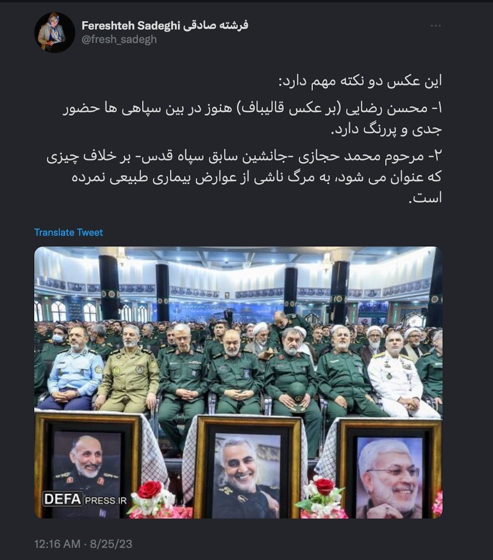 Home/PoliticsConcerning Sardar Hosseinzadeh Hejazi, when Ayatollah Khamenei agreed to grant a rank after his death, it indicates that his death was not due to natural causes and he is considered a 'martyrRead0 -Friday 2024/09/27 - 01:04News Code:4293Share Take less than a minute, register and share your opinion under this post.Insulting or inciting messages will be deleted.Sign UpComming Up Next Greetings, Mr. Director of Government Information. The core and essence of the security departments (Herasat) is the Personnel Protection Deputy. Does the Minister of Science or any other minister have the authority to dismiss these deputies as well?خواندن 1 minute Brigadier General Ahmad Vahidi, now in the position of Deputy Commander-in-Chief of the IRGC and commander of another centralized headquarters within the IRGC, continues on the path of implementing the mandates of Ayatollah...خواندن 1 minute Do you remember my note about the difficult path of summoning Sardar Ahmad Vahidi?خواندن 1 minute Twitter repliesخواندن 1 minute Did the Minister of Science have such power and authority without a notification from the Head of the National Security and Intelligence Organization (Herasat)?خواندن 1 minuteMost ReadMemories of Akbar Hashemi - February 20, 2000 - Meeting with Abdullah Jasbi and Concerns About Election ResultsMovie / Where is Commander Morteza Talaie?Akbar Hashemi's memoirs - 1999 September 10 - The two-person political negotiations with Vaez Tabasi continued until he was escorted to Tehran, where Hashemi apparently decided to seriously participate in the sixth parliamentary elections.The records of the recent periods of the Islamic Council showed that the parliament is not in charge of affairs and cannot interfere or pass resolutions on the authority of the Commander-in-Chief of the Armed Forces at any level, let alone supervise.What will be the future of Iran with the announced candidates for the presidential election? / Conversation with Dr. Taghi Azad AramakiCan I feel tired with you?A Basiji veterinarian was appointed head of the health network instead of an otolaryngologist.Akbar Hashemi's memoirs - 1999 September 5 - The meeting of the senior managers of the judiciary with Hashemi Rafsanjani and their complaint about the neglect of Hashemi Shahroudi, the new head of the judiciary, continues.Memories of Akbar Hashemi - 1999 September 7 - In continuation of the efforts of the late Vaez Tabasi, who used to encourage Hashemi to participate in the elections in frequent meetings, this time he also met with Hashemi.Akbar Hashemi's memories - 1999 September 9 - Continued visits to the belongings, buildings and works of Astan Quds
