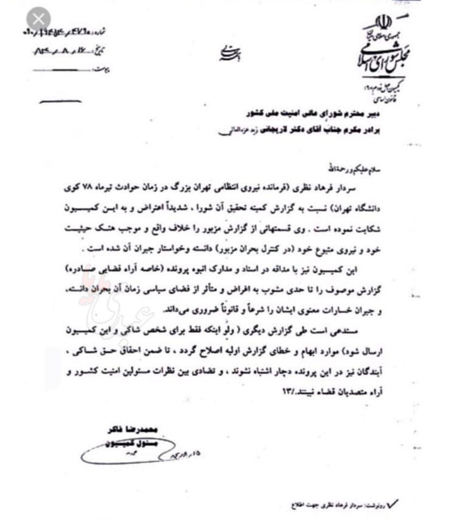 Home/PoliticsA question for Dr. Ali Larijani about Sardar Farhad NazariRead1 minute -Sunday 2025/10/05 - 14:21News Code:22954Share The Secretariat of the Supreme National Security Council finally, after correspondences and follow-ups by the Article 90 Commission of the ConstitutionImage Greetings to the Secretary of the Supreme National Security CouncilAfter correspondence and follow-ups by the Commission of Article 90 of the Constitution regarding Farhad Nazari's role in the July 1999 incidents at the University Dormitory and the written inquiry by Seyyed Mohammad Khatami, what exactly did the Secretariat of the Supreme National Security Council do?Were the reports of the Secretariat amended or not? Take less than a minute, register and share your opinion under this post.Insulting or inciting messages will be deleted.Sign UpComming Up Next "Smart" is good, but not for Iranians!خواندن 1 minute Abbas Abdi warns Qalibaf about gasoline; the wound of 2019 is still fresh, why should we go down the same wrong path again?خواندن 1 minute And more agreements... let's keep them for later.خواندن 1 minute Twitter replies on October 5خواندن 1 minute And what a bloody heart Hadi Khani and his colleagues at the Financial Intelligence Center did not eat, it was approved, but now?!!!!خواندن 1 minuteMost ReadMemories of Akbar Hashemi - February 20, 2000 - Meeting with Abdullah Jasbi and Concerns About Election ResultsMovie / Where is Commander Morteza Talaie?Akbar Hashemi's memoirs - 1999 September 10 - The two-person political negotiations with Vaez Tabasi continued until he was escorted to Tehran, where Hashemi apparently decided to seriously participate in the sixth parliamentary elections.The records of the recent periods of the Islamic Council showed that the parliament is not in charge of affairs and cannot interfere or pass resolutions on the authority of the Commander-in-Chief of the Armed Forces at any level, let alone supervise.What will be the future of Iran with the announced candidates for the presidential election? / Conversation with Dr. Taghi Azad AramakiCan I feel tired with you?A Basiji veterinarian was appointed head of the health network instead of an otolaryngologist.Akbar Hashemi's memoirs - 1999 September 5 - The meeting of the senior managers of the judiciary with Hashemi Rafsanjani and their complaint about the neglect of Hashemi Shahroudi, the new head of the judiciary, continues.Memories of Akbar Hashemi - 1999 September 7 - In continuation of the efforts of the late Vaez Tabasi, who used to encourage Hashemi to participate in the elections in frequent meetings, this time he also met with Hashemi.Akbar Hashemi's memories - 1999 September 9 - Continued visits to the belongings, buildings and works of Astan Quds