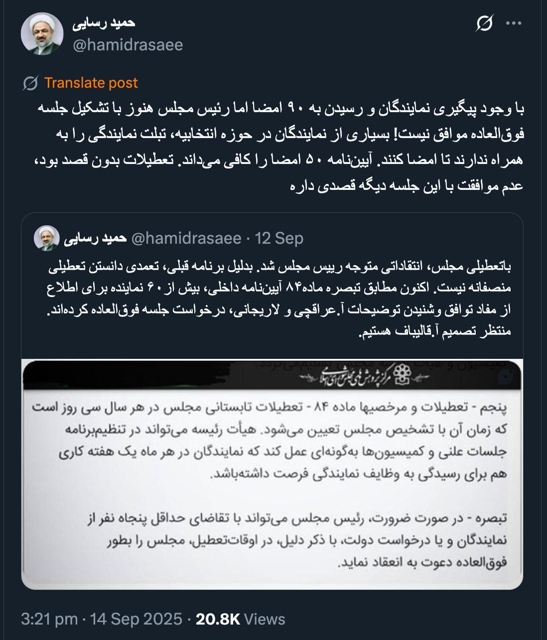 Home/PoliticsHaj Sheikh, greetings. As stated in the text of the law, it may be done; as you surely know, it is a possibility, not an obligation.Read1 minute -Monday 2025/09/15 - 04:15News Code:22601Share با وجود پیگیری نمایندگان و رسیدن به ۹۰ امضا اما رئیس مجلس هنوز با تشکیل جلسه فوقالعاده موافق نیست! بسیاری از نمایندگان در حوزه انتخابیه، تبلت نمایندگی را به همراه ندارند تا امضا کنند. آییننامه ۵۰ امضا را کافی میداند. تعطیلات بدون قصد بود، عدم موافقت با این جلسه دیگه قصدی داره https://t.co/WXevB8doR2— حمید رسایی (@hamidrasaee) September 14, 2025🔴حاج شیخدرود🔸در نص قانون آمده #میتواند و حتما مستحضرید میتواند تکلیف نیست— AbdiMedia - Abdollah Abdi (@abdolah_abdi) September 14, 2025 Take less than a minute, register and share your opinion under this post.Insulting or inciting messages will be deleted.Sign UpComming Up Next Azari Jahormi, the second guarantor of Dr. Masoud Pezeshkian : Are you telling us to shut up and not complain about the government?خواندن 1 minute Mr. CEO of Mizan news agency, when a prisoner is absent on leave, do they immediately arrest him? Or is the case of absence due to leave not established and the reason of the absence not being investigated?خواندن 1 minute They say that the agreement with Telegram is not valid without the approval of the parliamentخواندن 1 minute Agents raided the house of Mustafa Tajzadeh's daughter and took her back to prison.خواندن 0 Akhundi: One destruction is enough / In the Soviet Union, the real struggle for the people was not the arms race with the United States; rather, it was the battle between the official television and the refrigerator.خواندن 1 minuteMost ReadMemories of Akbar Hashemi - February 20, 2000 - Meeting with Abdullah Jasbi and Concerns About Election ResultsMovie / Where is Commander Morteza Talaie?Akbar Hashemi's memoirs - 1999 September 10 - The two-person political negotiations with Vaez Tabasi continued until he was escorted to Tehran, where Hashemi apparently decided to seriously participate in the sixth parliamentary elections.The records of the recent periods of the Islamic Council showed that the parliament is not in charge of affairs and cannot interfere or pass resolutions on the authority of the Commander-in-Chief of the Armed Forces at any level, let alone supervise.What will be the future of Iran with the announced candidates for the presidential election? / Conversation with Dr. Taghi Azad AramakiCan I feel tired with you?A Basiji veterinarian was appointed head of the health network instead of an otolaryngologist.Akbar Hashemi's memoirs - 1999 September 5 - The meeting of the senior managers of the judiciary with Hashemi Rafsanjani and their complaint about the neglect of Hashemi Shahroudi, the new head of the judiciary, continues.Memories of Akbar Hashemi - 1999 September 7 - In continuation of the efforts of the late Vaez Tabasi, who used to encourage Hashemi to participate in the elections in frequent meetings, this time he also met with Hashemi.Akbar Hashemi's memories - 1999 September 9 - Continued visits to the belongings, buildings and works of Astan Quds