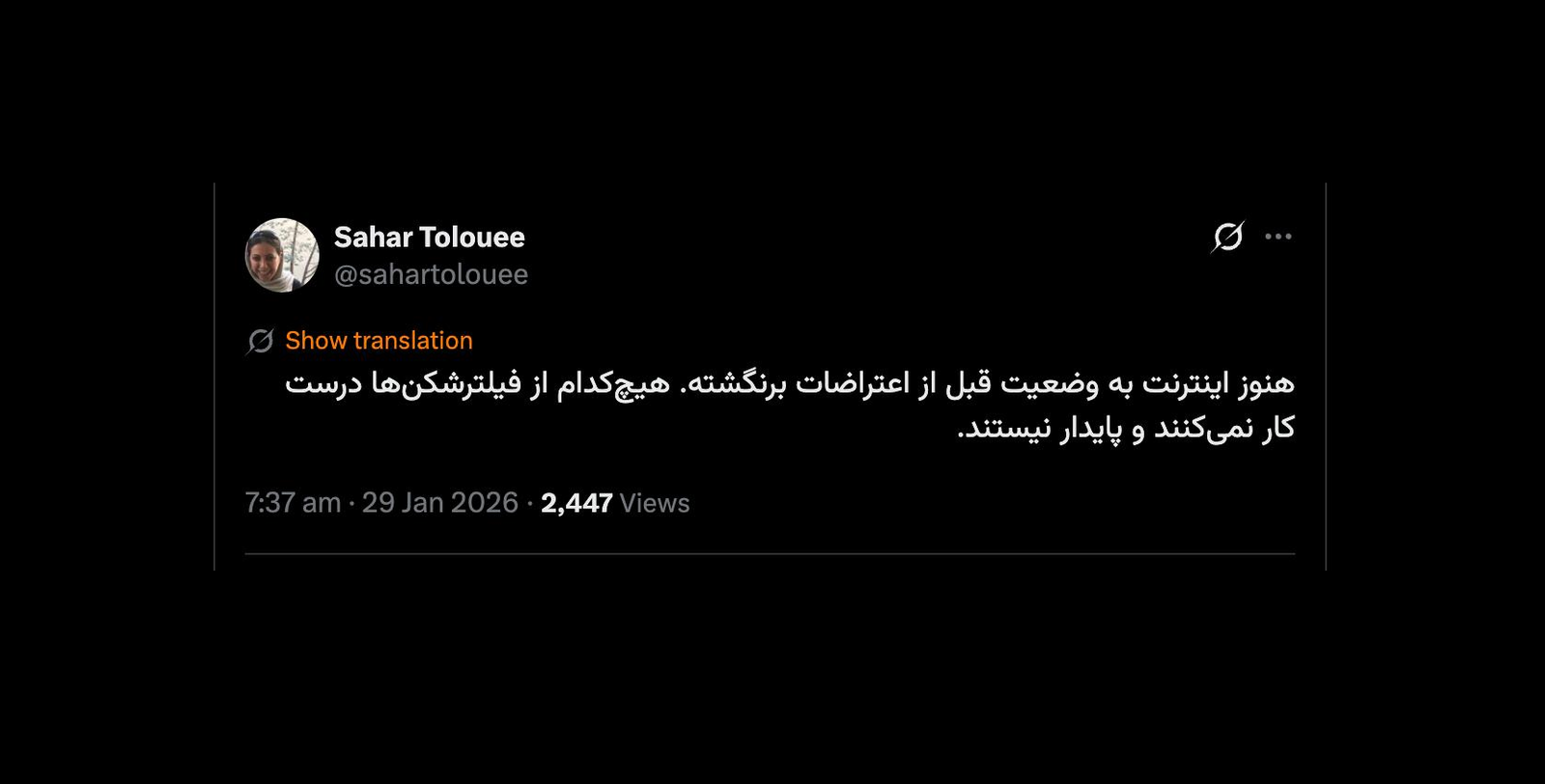 Home/PoliticsHave you noticed that when international internet wasn't connected, more VPNs would connect? Not clear?Read1 minute -Thursday 2026/01/29 - 18:19News Code:24270Share هنوز اینترنت به وضعیت قبل از اعتراضات برنگشته. هیچکدام از فیلترشکنها درست کار نمیکنند و پایدار نیستند.— Sahar Tolouee (@sahartolouee) January 29, 2026🔴 درود🔸دقت کردید زمانی که اینترنت بینالملل وصل نشده بود ویپیانهای بیشتری وصل میشدند؟ روشن نیست؟— AbdiMedia - Abdollah Abdi (@abdolah_abdi) January 29, 2026 Take less than a minute, register and share your opinion under this post.Insulting or inciting messages will be deleted.Sign UpComming Up Next Ayatollah Khamenei, the Leader of the Islamic Republic, attended the tomb of Ayatollah Khomeini this morning (Saturday, January 31, 2026), following the usual custom and regardless of domestic and foreign crises...خواندن 1 minute Sheikh Mehdi Karroubi's statement on the bloody days of Iran: The miserable situation in Iran today is the result of Mr. Khamenei's destructive policies / The peaceful way out of this crisis is a free referendumخواندن 2 minutes Iran issued an aviation warning about live gunfire in the approach routes to the Strait of Hormuzخواندن 2 minutes The European Union has placed the Revolutionary Guard Corps on its list of terrorist organizations.خواندن 1 minute Mirhossein Mousavi's statement from Hesr: The game is over! Put down your gun and step asideخواندن 2 minutesMost ReadMemories of Akbar Hashemi - February 20, 2000 - Meeting with Abdullah Jasbi and Concerns About Election ResultsMovie / Where is Commander Morteza Talaie?Akbar Hashemi's memoirs - 1999 September 10 - The two-person political negotiations with Vaez Tabasi continued until he was escorted to Tehran, where Hashemi apparently decided to seriously participate in the sixth parliamentary elections.The records of the recent periods of the Islamic Council showed that the parliament is not in charge of affairs and cannot interfere or pass resolutions on the authority of the Commander-in-Chief of the Armed Forces at any level, let alone supervise.What will be the future of Iran with the announced candidates for the presidential election? / Conversation with Dr. Taghi Azad AramakiCan I feel tired with you?A Basiji veterinarian was appointed head of the health network instead of an otolaryngologist.Akbar Hashemi's memoirs - 1999 September 5 - The meeting of the senior managers of the judiciary with Hashemi Rafsanjani and their complaint about the neglect of Hashemi Shahroudi, the new head of the judiciary, continues.Memories of Akbar Hashemi - 1999 September 7 - In continuation of the efforts of the late Vaez Tabasi, who used to encourage Hashemi to participate in the elections in frequent meetings, this time he also met with Hashemi.Akbar Hashemi's memories - 1999 September 9 - Continued visits to the belongings, buildings and works of Astan Quds