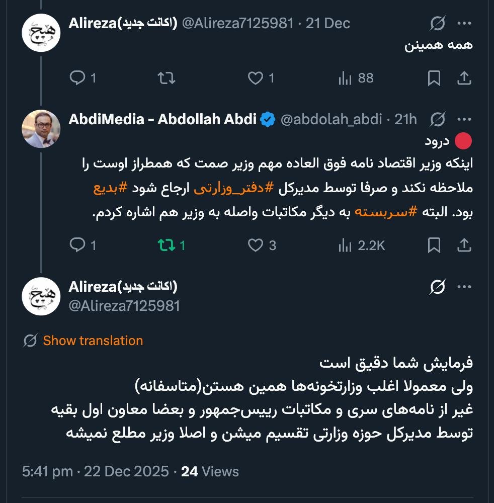 Home/PoliticsWhat is the topic?Read2 minutes -Thursday 2025/12/25 - 18:22News Code:24020Share It can be justified that the Director General of the Ministerial Office or the Director General of the Organizations' Directorate or the Director General of the Governor's Department; due to the minister's busy schedule, initially refers correspondence from non-equal or senior officials of the system with the authority he has from the minister and requests the result from the headquarters and ranks, and then, once the response and report are received, informs the records.But two very important points in this correspondence have been overlooked:First: An important issue was personally signed and sent by the Chief Minister of one ministry to the Chief Minister of another ministry (due to the powers of the ministries), and it is natural that the dignity of ministers and the status of the letter required that the Minister of Economic Affairs and Finance consider and refer it.Second: Where in this letter do you see that Mr. Mohammad Anbari, as the Director General of the Ministry's Office, at least demanded the result from the recipients after the referral?!!!🔴درود💢میشود توجیه کرد مدیر کل دفتر وزارتی یا مدیر کل حوزه ریاست سازمان ها یا مدیرکل حوزه استاندار؛ به خاطر مشغله #وزیر، مکاتبات #غیر_همطراز یا مسئولان ارشد نظام را #بدواً با اختیاری که از #وزیر دارد ارجاع کند و #نتیجه را از ستاد و صف بخواهد و بعد که پاسخ و گزارش واصل شد، سوابق را باستحضار برساند.📌 اما دونکته در این مکاتبه بسیار مهم است که مغفول مانده:🔸اول: موضوعی مهم را ابر وزیر یک وزارت خانه با امضای خود به ابر وزیر یک وزارت خانه دیگر (از بابت اختیارات وزارت خانه ها) شخصاً امضا کرده و فرستاده و طبیعی است شان وزیران و شئون نامه اقتضا میکرد شخص وزیر امور اقتصادی و دارایی آن را ملاحظه و ارجاع کند.🔸دوم: در کجای این نامه ملاحظه می فرمایید که آقای #محمد_عنبری به عنوان مدیرکل دفتر وزارتی حداقل پس از ارجاع از مخاطبان #نتیجه را مطالبه کرده باشد؟!!!— Abdollah Abdi (@abdolah_abdi) December 23, 2025 Take less than a minute, register and share your opinion under this post.Insulting or inciting messages will be deleted.Sign UpComming Up Next It was novel that the Minister of Economy did not consider the extremely important letter from Minister Samat, who is on his level, and that it was merely referred to by the Director General of the Ministry's Office. Of course, I also briefly mentioned otخواندن 1 minute Notification of Ahvaz Jundishapur University of Medical Sciences was canceledخواندن 1 minute Greetings, Mr. Sadeghi Moghadam has been the Deputy Executive and Election Affairs of the Guardian Council for many years and was a member of the Guardian Council's legal team for a while, but was not introduced this time.خواندن 2 minutes Saeed Ohadi moved from deputy to advisor to the presidentخواندن 1 minute finally that prison director full of strange news is goneخواندن 1 minuteMost ReadMemories of Akbar Hashemi - February 20, 2000 - Meeting with Abdullah Jasbi and Concerns About Election ResultsMovie / Where is Commander Morteza Talaie?Akbar Hashemi's memoirs - 1999 September 10 - The two-person political negotiations with Vaez Tabasi continued until he was escorted to Tehran, where Hashemi apparently decided to seriously participate in the sixth parliamentary elections.The records of the recent periods of the Islamic Council showed that the parliament is not in charge of affairs and cannot interfere or pass resolutions on the authority of the Commander-in-Chief of the Armed Forces at any level, let alone supervise.What will be the future of Iran with the announced candidates for the presidential election? / Conversation with Dr. Taghi Azad AramakiCan I feel tired with you?A Basiji veterinarian was appointed head of the health network instead of an otolaryngologist.Akbar Hashemi's memoirs - 1999 September 5 - The meeting of the senior managers of the judiciary with Hashemi Rafsanjani and their complaint about the neglect of Hashemi Shahroudi, the new head of the judiciary, continues.Memories of Akbar Hashemi - 1999 September 7 - In continuation of the efforts of the late Vaez Tabasi, who used to encourage Hashemi to participate in the elections in frequent meetings, this time he also met with Hashemi.Akbar Hashemi's memories - 1999 September 9 - Continued visits to the belongings, buildings and works of Astan Quds