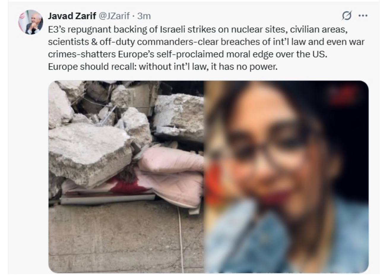 Home/PoliticsZarif: European trickery support for IsraelRead1 minute -Friday 2025/07/11 - 16:04News Code:19699Share British, France and Germany's supportive support for Israeli attacks on nuclear facilities destroys Europe's moral superiority claim The former Foreign Minister wrote: British, France and Germany's supportive support for Israeli attacks on nuclear facilities destroys Europe's moral superiority claim British, France and Germany's support for Israeli attacks against nuclear facilities, civilian areas, scientists and commanders (at rest), all of which are considered to be in violation of international law and even war crimes, destroy Europe's moral supremacy even over the United States. Europe must remember: without international rights, Europe has no power. Take less than a minute, register and share your opinion under this post.Insulting or inciting messages will be deleted.Sign UpComming Up Next Babak Zanjani narrated by Ishaq Jahangiriخواندن 7 minutes Listen | Episode Eleven | How the West Became the West? (Economic and Social Backgrounds of the 'Protestant Revolt' [1522-1525]) by Dr. Sadegh Zibakalamخواندن 1 minute Kerbaschi's warning about the consequences of US military, economic and political confrontation with Iran / Economic reforms are not possible without "regulated diplomacy"خواندن 1 minute Iran After 12 Days - Seyed Mostafa Tajzadehخواندن 26 minutes Even if the Leader's aide could be appointed as Vice President or to a corresponding position, it would be a reduction of his stature.خواندن 1 minuteMost ReadMemories of Akbar Hashemi - February 20, 2000 - Meeting with Abdullah Jasbi and Concerns About Election ResultsMovie / Where is Commander Morteza Talaie?Akbar Hashemi's memoirs - 1999 September 10 - The two-person political negotiations with Vaez Tabasi continued until he was escorted to Tehran, where Hashemi apparently decided to seriously participate in the sixth parliamentary elections.The records of the recent periods of the Islamic Council showed that the parliament is not in charge of affairs and cannot interfere or pass resolutions on the authority of the Commander-in-Chief of the Armed Forces at any level, let alone supervise.What will be the future of Iran with the announced candidates for the presidential election? / Conversation with Dr. Taghi Azad AramakiCan I feel tired with you?A Basiji veterinarian was appointed head of the health network instead of an otolaryngologist.Akbar Hashemi's memoirs - 1999 September 5 - The meeting of the senior managers of the judiciary with Hashemi Rafsanjani and their complaint about the neglect of Hashemi Shahroudi, the new head of the judiciary, continues.Memories of Akbar Hashemi - 1999 September 7 - In continuation of the efforts of the late Vaez Tabasi, who used to encourage Hashemi to participate in the elections in frequent meetings, this time he also met with Hashemi.Akbar Hashemi's memories - 1999 September 9 - Continued visits to the belongings, buildings and works of Astan Quds