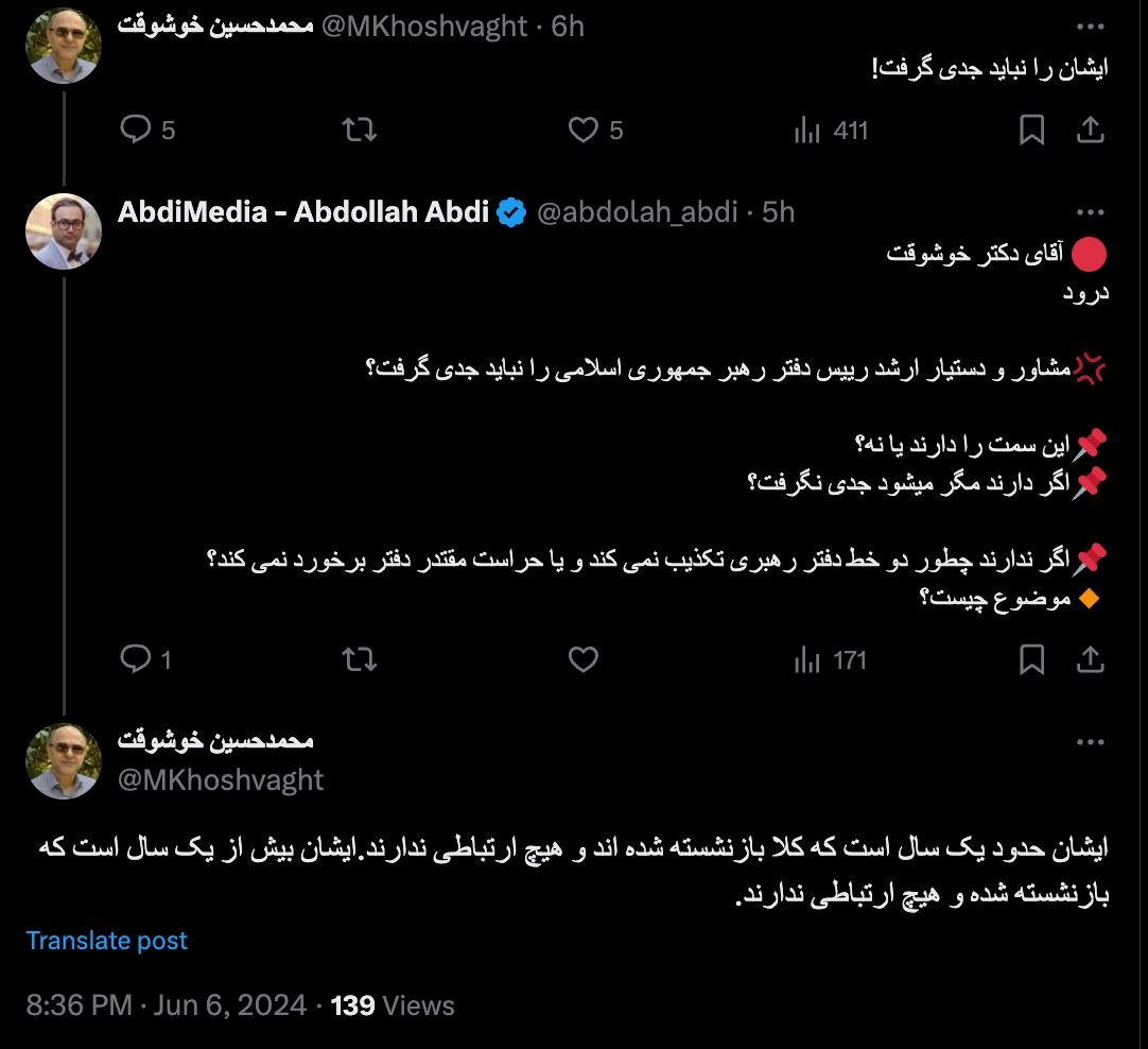 Home/Special noteThe Great Ambiguity in the Current Job Title of Seyed Vahid Haghanian Read1 minute -Monday 2024/10/21 - 21:58News Code:5513ShareVideo file Abdollah Abdi - Abdi MediaSeyed Vahid Haghanian, for the past year, has had no connection whatsoever with the Leadership Office.Question:How is it that Seyed Vahid, in his promotional video, officially introduces himself as Senior Advisor and Assistant to the Chief of Staff of the Leader's Office?And the Leader's Office does not deny this, nor does the office's security take action?Why is no one addressing this major ambiguity? Take less than a minute, register and share your opinion under this post.Insulting or inciting messages will be deleted.Sign UpComming Up Next Republication - The text of the Supreme Judicial Council's directive dated December 19, 1984, to all courts and prosecutor's offices in Iran regarding the acceptance of attorneys.خواندن 1 minute This “costly calm” was the best possible condition for completing the internal security ring.خواندن 1 minute When and under what conditions does the internet connect? The answer is on the street, at sea, and in the sky.خواندن 4 minutes The policy of reclaiming the street: from control to the beginning of a tough crackdownخواندن 3 minutes Trump, Iran Street, and the Politics of Deal-Making; How Important is Democracy?خواندن 5 minutesMost ReadMemories of Akbar Hashemi - February 20, 2000 - Meeting with Abdullah Jasbi and Concerns About Election ResultsMovie / Where is Commander Morteza Talaie?Akbar Hashemi's memoirs - 1999 September 10 - The two-person political negotiations with Vaez Tabasi continued until he was escorted to Tehran, where Hashemi apparently decided to seriously participate in the sixth parliamentary elections.The records of the recent periods of the Islamic Council showed that the parliament is not in charge of affairs and cannot interfere or pass resolutions on the authority of the Commander-in-Chief of the Armed Forces at any level, let alone supervise.What will be the future of Iran with the announced candidates for the presidential election? / Conversation with Dr. Taghi Azad AramakiCan I feel tired with you?A Basiji veterinarian was appointed head of the health network instead of an otolaryngologist.Akbar Hashemi's memoirs - 1999 September 5 - The meeting of the senior managers of the judiciary with Hashemi Rafsanjani and their complaint about the neglect of Hashemi Shahroudi, the new head of the judiciary, continues.Memories of Akbar Hashemi - 1999 September 7 - In continuation of the efforts of the late Vaez Tabasi, who used to encourage Hashemi to participate in the elections in frequent meetings, this time he also met with Hashemi.Akbar Hashemi's memories - 1999 September 9 - Continued visits to the belongings, buildings and works of Astan Quds