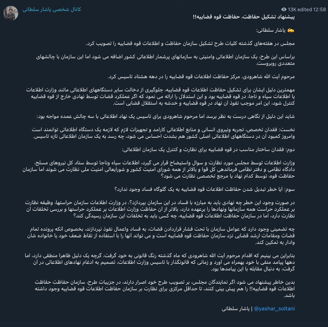 Home/Special noteGreetings to you, Mr. Yashar Soltani!Read1 minute -Sunday 2024/09/29 - 11:51News Code:4666Share یادداشت شما را خواندم.Of course, this plan, which was approved by the parliament, has effectively been implemented at the "Center" for the Protection of Information of the Judiciary for years, and the country’s intelligence agencies have adapted themselves to it, accepting this existential reality.Now, just like the Prosecutor's Office and the Special Clergy Court, which was an existential reality that was only given legal status in the fifth parliament by a provision at the end of the Civil Procedure Code, the "Center" is transforming into an "Organization."Another point that should not be overlooked is that the parliament at the time did not approve the Center for the Protection of Information of the Judiciary as an agent in the Criminal Procedure Code. However, Sheikh Sadegh Larijani easily bypassed the parliament by preparing a request from Ayatollah Khamenei, and with his approval as the #Absolute_Wali_of_the_Order, he designated this center as an agent of the judiciary.Regarding the establishment of protection for the personnel of this center, it seems that there is a mechanism similar to the Protection Information Department of the Ministry of Intelligence, albeit more agile in its dimensions, which has led to some internal arrests within this center and actions that were partly made public, all under the direct supervision and guidance of the head of this center and that specific unit.Best regards, -Abdollah Abdi Take less than a minute, register and share your opinion under this post.Insulting or inciting messages will be deleted.Sign UpComming Up Next Republication - The text of the Supreme Judicial Council's directive dated December 19, 1984, to all courts and prosecutor's offices in Iran regarding the acceptance of attorneys.خواندن 1 minute This “costly calm” was the best possible condition for completing the internal security ring.خواندن 1 minute When and under what conditions does the internet connect? The answer is on the street, at sea, and in the sky.خواندن 4 minutes The policy of reclaiming the street: from control to the beginning of a tough crackdownخواندن 3 minutes Trump, Iran Street, and the Politics of Deal-Making; How Important is Democracy?خواندن 5 minutesMost ReadMemories of Akbar Hashemi - February 20, 2000 - Meeting with Abdullah Jasbi and Concerns About Election ResultsMovie / Where is Commander Morteza Talaie?Akbar Hashemi's memoirs - 1999 September 10 - The two-person political negotiations with Vaez Tabasi continued until he was escorted to Tehran, where Hashemi apparently decided to seriously participate in the sixth parliamentary elections.The records of the recent periods of the Islamic Council showed that the parliament is not in charge of affairs and cannot interfere or pass resolutions on the authority of the Commander-in-Chief of the Armed Forces at any level, let alone supervise.What will be the future of Iran with the announced candidates for the presidential election? / Conversation with Dr. Taghi Azad AramakiCan I feel tired with you?A Basiji veterinarian was appointed head of the health network instead of an otolaryngologist.Akbar Hashemi's memoirs - 1999 September 5 - The meeting of the senior managers of the judiciary with Hashemi Rafsanjani and their complaint about the neglect of Hashemi Shahroudi, the new head of the judiciary, continues.Memories of Akbar Hashemi - 1999 September 7 - In continuation of the efforts of the late Vaez Tabasi, who used to encourage Hashemi to participate in the elections in frequent meetings, this time he also met with Hashemi.Akbar Hashemi's memories - 1999 September 9 - Continued visits to the belongings, buildings and works of Astan Quds