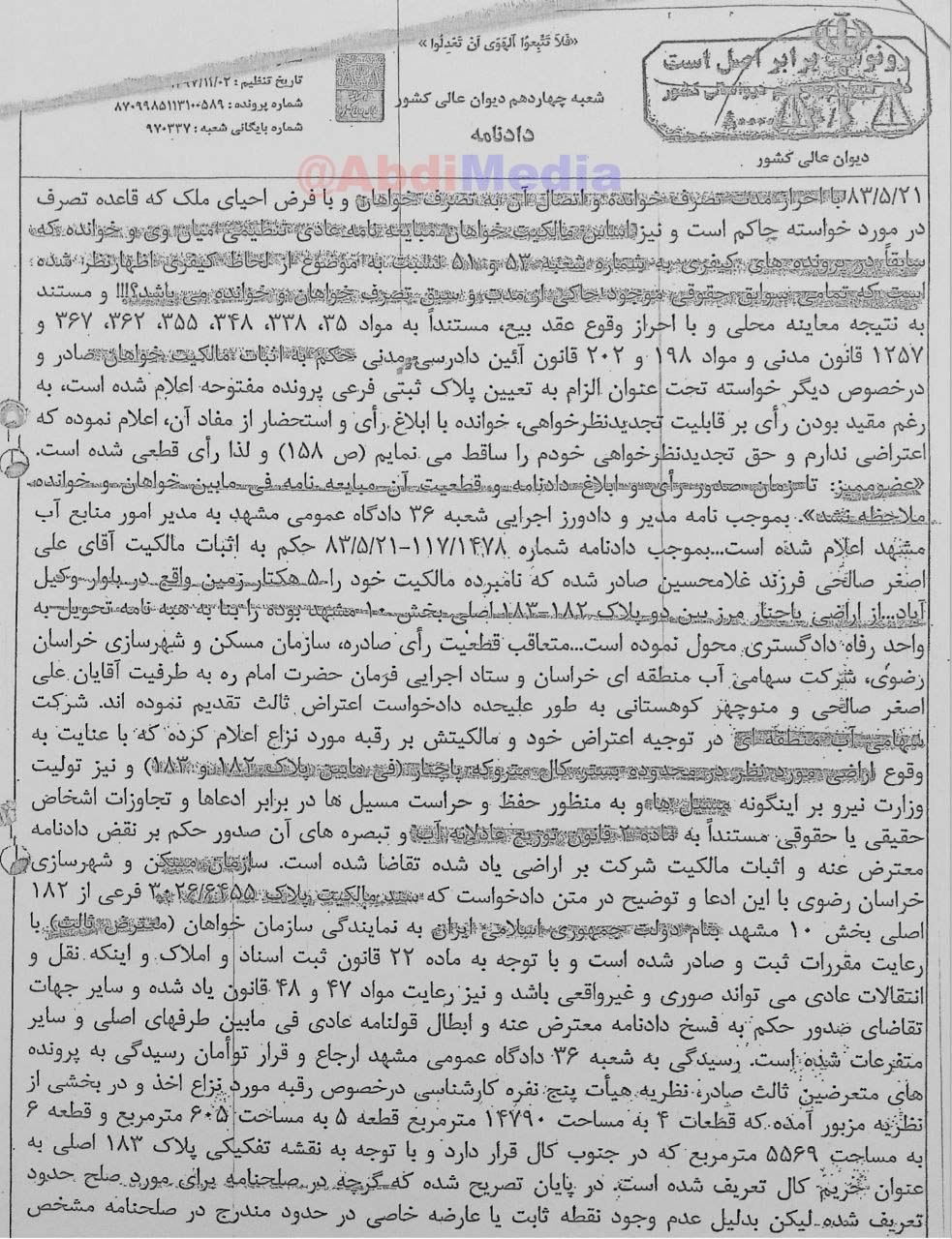 Home/Special noteThe discovery of another astronomical corruption in the judiciary / the discovery of traces of a special gang in the eras of Khorasan Razavi's judiciary!Read4 minutes -Saturday 2024/10/12 - 21:28News Code:4036ShareImage Image Image Image Image Image Image Image Image Image PreviousNextUnfortunately, one year after the formal peace agreement of Soori Kadhaei, case number 75/16543/D of Samad Kompany and Ali Asghar Ilkhani estates in branch 17 of the Tehran Revolution Court (special principle 49) with the follow-up of the legal assistant The executive headquarters of the Imam's decree leading to the decree No. 59920 on July 10, 1997, regarding the confiscation of 25% of the aforementioned two hundred hectares for khums and religious purposes, and the plan of the broker gang of the justice managers of the mentioned province is messed up!But this is not the end of the story and another strange story begins that takes about twenty years!The chief justices of the entire province (from Yesaghi, the current head of the Supreme Court branch, and Shariati, the former judge of the 28th branch of the Supreme Court, and Bakhtiari, the current head of the Imam Relief Committee, and Ismaili, the current head of the president's office, to Mozafari, the current head of the Qom judiciary, and Sadeghi, a member of the deputy branches The Supreme Court of the country and of course the adviser to the first deputy head of the judiciary) and the judicial assistants and the head of protection and information of the general judiciary (up to Salmani and Hosseini) and the welfare of the judiciary (up to Haqi and Masrour) are successively changed, but all of them somehow have a common goal. follow And that is the round-the-clock effort to revive and take over and register the official ownership of this valuable property with the help of various legal cases and exerting influence on the expert panels for the benefit of the judiciary and the detriment of the executive headquarters of the Imam's decree in the legal and appeal courts of Khorasan province, and that's it...In the meantime, another relatively unexpected event occurs, which is the division of Greater Khorasan Province into three provinces: North Khorasan, Razavi, and South Khorasan.But Mr. Haj Ali Asghar Salehi (Kazhai peacemaker) by handing over his peace rights to the justice of Khorasan Razavi province under the peace agreement of Kazhai, gives a bad whistle and the newly appointed managers of the other two provinces remains without a share!But these arrows, which were left in the dark by the senior leaders of the judiciary, are fruitless because the head of the third protester (the water and sewage company, which claims that the judiciary has taken over the river's boundary!) is also found, and with the resumption of the proceedings of the then Minister of Energy regarding the petitions Branches 19 of Revision and 47 and 48 of Mashhad General Law, Branch 14 of the Supreme Court headed by Mohammad Reza Saber and Counselor Khalaf Rezaei in the historical decision 9709970907400514 dated January 22, 2019, strongly criticizes the self-interested actions of Khorasan's justice managers and is addressed as such. give that:"Irrespective of the fact that the judicial system of the province in planning, prosecuting and bringing to fruition the lawsuits and the related goals, as argued by the judicial colleagues, was not and is not a member of the judicial system, and regardless of the series of actions carried out and the legal relationship between the petitioners. How was the first Mr. Ali Asghar Salehi with the Justice Welfare Department and was it real or not? Basically, the initial lawsuit related to the issue of proof of ownership and the requirement to determine the sub-registration plate with high quality was not able to be heard"!And it violates the judgments of the Khorasan Razavi Court of Appeals and Branches 47 and 48 of Mashhad, and gives the right to the Ministry of Energy in the wide part of the riverbed and river boundary (which was taken over by the Khorasan Justice Managers!).More interestingly, the 32nd branch of the Supreme Court of the country, headed by Reza Farajollahi and the advisor of Fariborz Lashgari, in decision number 9909970910500566 dated 2020 October 28, violated the rest of the decision of the 19th branch of the Court of Appeal of Khorasan Razavi, ruled to cancel the land registration documents included in the Kazai peace agreement. and the case claimed by Khorasan justice managers.But this is not the end of the strange efforts of the Khorasan Razavi justice gang and the story continues...Footnote: Regarding this astronomical organizational corruption, if any of the natural or legal persons whose names are mentioned in this report send an explanation to Abdi Media in order to comply with professional ethics, I will publish it, and if so, in the official and reliable media inside or outside the country. publish it and send me its link and verify its authenticity, I will publish it again.This is the same for all notes and news of Abdi Media.Abdollah Abdi Take less than a minute, register and share your opinion under this post.Insulting or inciting messages will be deleted.Sign UpComming Up Next Republication - The text of the Supreme Judicial Council's directive dated December 19, 1984, to all courts and prosecutor's offices in Iran regarding the acceptance of attorneys.خواندن 1 minute This “costly calm” was the best possible condition for completing the internal security ring.خواندن 1 minute When and under what conditions does the internet connect? The answer is on the street, at sea, and in the sky.خواندن 4 minutes The policy of reclaiming the street: from control to the beginning of a tough crackdownخواندن 3 minutes Trump, Iran Street, and the Politics of Deal-Making; How Important is Democracy?خواندن 5 minutesMost ReadMemories of Akbar Hashemi - February 20, 2000 - Meeting with A
