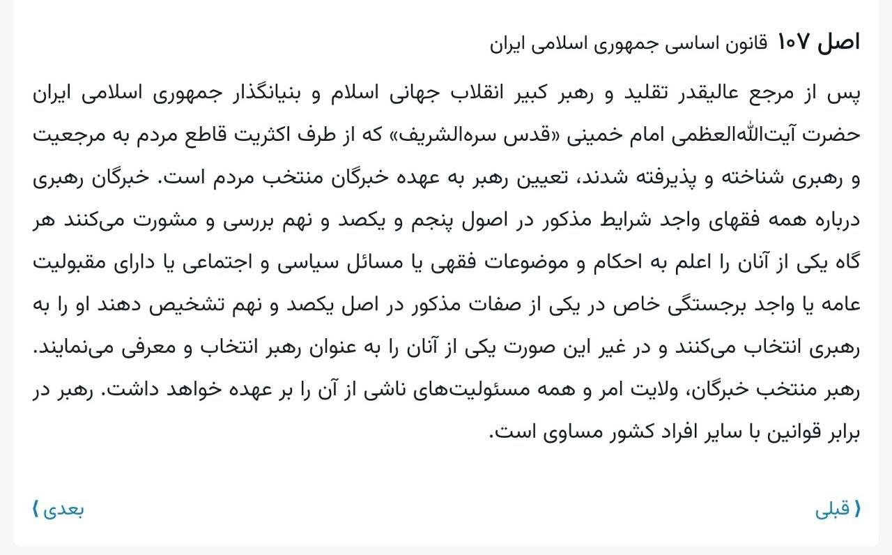 Home/Special noteHistorical mistake and conflict of interests in the constitutional amendment after 33 yearsRead1 minute -Wednesday 2024/09/11 - 11:59News Code:559Share The approvers of the amendment to the Constitution in 1989, who legalized Article 57 of the Constitution by establishing and including (absolute sovereignty), when amending Article 107 of the Constitution, which was approved with the number after Article 57, forgot that the last sentences of the phrase Remove this principle (the leader is equal to other people of the country before the laws).In fact, according to Article 107, which is after Article 57, is the leader equal to other people before the laws?Or according to Article 57 of the Constitution, the leader himself is governed by the law and his decrees precede the law, and as far as we know, the final resolution of the parliament of each country is called the law, and there is no other authority?Abdollah Abdi Take less than a minute, register and share your opinion under this post.Insulting or inciting messages will be deleted.Sign UpComming Up Next Yalda, this beautiful and graceful long-haired Iran, is the legacy of our ancestors.خواندن 2 minutes Please send verified and hopeful news with the utmost accuracy, as I will share them for the awareness of our esteemed compatriots. Or, substantiate the rejection of the alleged distortions with evidence. Is that too difficult?خواندن 1 minute I think everyone got what they wanted. They took their celebrations and the story, as I wrote before, will not go beyond these conditions.خواندن 1 minute A Question for the Deputy Chief of the President's Office and Head of the Government's Information Councilخواندن 1 minute Another Example of Legislative Writing and Its Approval in the Revolutionary Parliament, Particularly Regarding the Important Law of the Central Bankخواندن 2 minutesMost ReadMemories of Akbar Hashemi - February 20, 2000 - Meeting with Abdullah Jasbi and Concerns About Election ResultsMovie / Where is Commander Morteza Talaie?Akbar Hashemi's memoirs - 1999 September 10 - The two-person political negotiations with Vaez Tabasi continued until he was escorted to Tehran, where Hashemi apparently decided to seriously participate in the sixth parliamentary elections.The records of the recent periods of the Islamic Council showed that the parliament is not in charge of affairs and cannot interfere or pass resolutions on the authority of the Commander-in-Chief of the Armed Forces at any level, let alone supervise.What will be the future of Iran with the announced candidates for the presidential election? / Conversation with Dr. Taghi Azad AramakiCan I feel tired with you?A Basiji veterinarian was appointed head of the health network instead of an otolaryngologist.Akbar Hashemi's memoirs - 1999 September 5 - The meeting of the senior managers of the judiciary with Hashemi Rafsanjani and their complaint about the neglect of Hashemi Shahroudi, the new head of the judiciary, continues.Memories of Akbar Hashemi - 1999 September 7 - In continuation of the efforts of the late Vaez Tabasi, who used to encourage Hashemi to participate in the elections in frequent meetings, this time he also met with Hashemi.Akbar Hashemi's memories - 1999 September 9 - Continued visits to the belongings, buildings and works of Astan Quds