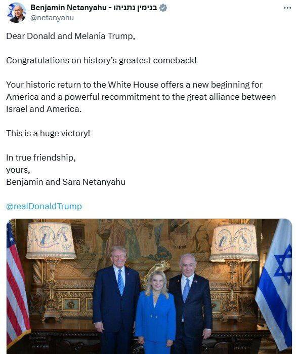 Home/WorldBenjamin Netanyahu's happiness with Trump's victory/family congratulatory messageRead1 minute -Wednesday 2024/11/06 - 12:01News Code:8054Share Dear Donald and Melania Trump Congratulations on the biggest comeback in history!Your historic return to the White House marks a new beginning for America and a powerful renewed commitment to the great alliance between Israel and America. This is a great victory! In true friendship, yours, Benjamin and Sarah Netanyahu Take less than a minute, register and share your opinion under this post.Insulting or inciting messages will be deleted.Sign UpComming Up Next American announcements and warnings in Persianخواندن 0 Trump on how he got Hamas to accept the deal: I spoke a little bit tough and that was enough. That's what works in a tough world like this: You have to speak tough.خواندن 1 minute Venezuelan opposition leader Maria Corina Machado has won the 2025 Nobel Peace Prize.خواندن 0 Hamas statement: We announce the achievement of an agreement that will end the war on Gaza, the occupiers will withdraw from it, humanitarian aid will reach Gaza, and a prisoner exchange will take place.خواندن 1 minute Tom Barrack, U.S. Special Envoy: The Middle East is nothing but an illusion.خواندن 1 minuteMost ReadMemories of Akbar Hashemi - February 20, 2000 - Meeting with Abdullah Jasbi and Concerns About Election ResultsMovie / Where is Commander Morteza Talaie?Akbar Hashemi's memoirs - 1999 September 10 - The two-person political negotiations with Vaez Tabasi continued until he was escorted to Tehran, where Hashemi apparently decided to seriously participate in the sixth parliamentary elections.The records of the recent periods of the Islamic Council showed that the parliament is not in charge of affairs and cannot interfere or pass resolutions on the authority of the Commander-in-Chief of the Armed Forces at any level, let alone supervise.What will be the future of Iran with the announced candidates for the presidential election? / Conversation with Dr. Taghi Azad AramakiCan I feel tired with you?A Basiji veterinarian was appointed head of the health network instead of an otolaryngologist.Akbar Hashemi's memoirs - 1999 September 5 - The meeting of the senior managers of the judiciary with Hashemi Rafsanjani and their complaint about the neglect of Hashemi Shahroudi, the new head of the judiciary, continues.Memories of Akbar Hashemi - 1999 September 7 - In continuation of the efforts of the late Vaez Tabasi, who used to encourage Hashemi to participate in the elections in frequent meetings, this time he also met with Hashemi.Akbar Hashemi's memories - 1999 September 9 - Continued visits to the belongings, buildings and works of Astan Quds