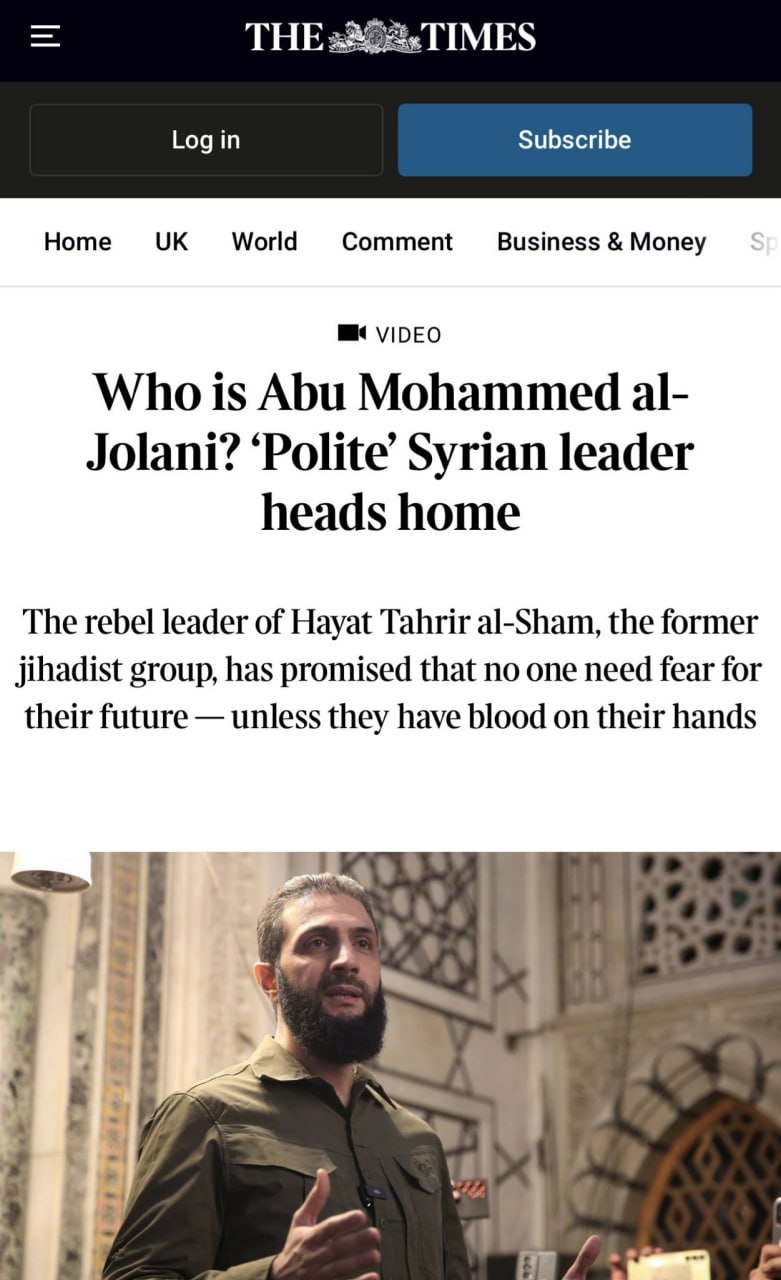 Home/WorldThe Times of England's bizarre defense of al-Julani: "He's a polite ex-jihadi!"Read0 -Sunday 2024/12/15 - 00:19News Code:10060Share Take less than a minute, register and share your opinion under this post.Insulting or inciting messages will be deleted.Sign UpComming Up Next American announcements and warnings in Persianخواندن 0 Trump on how he got Hamas to accept the deal: I spoke a little bit tough and that was enough. That's what works in a tough world like this: You have to speak tough.خواندن 1 minute Venezuelan opposition leader Maria Corina Machado has won the 2025 Nobel Peace Prize.خواندن 0 Hamas statement: We announce the achievement of an agreement that will end the war on Gaza, the occupiers will withdraw from it, humanitarian aid will reach Gaza, and a prisoner exchange will take place.خواندن 1 minute Tom Barrack, U.S. Special Envoy: The Middle East is nothing but an illusion.خواندن 1 minuteMost ReadMemories of Akbar Hashemi - February 20, 2000 - Meeting with Abdullah Jasbi and Concerns About Election ResultsMovie / Where is Commander Morteza Talaie?Akbar Hashemi's memoirs - 1999 September 10 - The two-person political negotiations with Vaez Tabasi continued until he was escorted to Tehran, where Hashemi apparently decided to seriously participate in the sixth parliamentary elections.The records of the recent periods of the Islamic Council showed that the parliament is not in charge of affairs and cannot interfere or pass resolutions on the authority of the Commander-in-Chief of the Armed Forces at any level, let alone supervise.What will be the future of Iran with the announced candidates for the presidential election? / Conversation with Dr. Taghi Azad AramakiCan I feel tired with you?A Basiji veterinarian was appointed head of the health network instead of an otolaryngologist.Akbar Hashemi's memoirs - 1999 September 5 - The meeting of the senior managers of the judiciary with Hashemi Rafsanjani and their complaint about the neglect of Hashemi Shahroudi, the new head of the judiciary, continues.Memories of Akbar Hashemi - 1999 September 7 - In continuation of the efforts of the late Vaez Tabasi, who used to encourage Hashemi to participate in the elections in frequent meetings, this time he also met with Hashemi.Akbar Hashemi's memories - 1999 September 9 - Continued visits to the belongings, buildings and works of Astan Quds