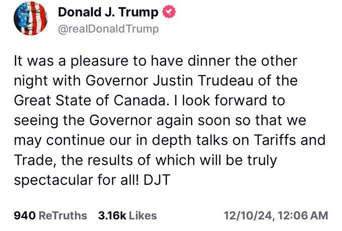 Home/WorldIn a message to Justin Trudeau, the Prime Minister of Canada, Trump humiliated him by calling him a "governor" and also implied that Canada is just another state within the United States.Read1 minute -Thursday 2024/12/12 - 10:38News Code:9831Share It was an honor to have dinner with the governor of the great state of Canada.Trump, after joking a few days ago about annexing Canada to the United States, this time wrote on Twitter:It was an honor to have dinner with the governor of the great state of Canada. I hope to see the governor again soon to talk about trade and tariffs. Take less than a minute, register and share your opinion under this post.Insulting or inciting messages will be deleted.Sign UpComming Up Next American announcements and warnings in Persianخواندن 0 Trump on how he got Hamas to accept the deal: I spoke a little bit tough and that was enough. That's what works in a tough world like this: You have to speak tough.خواندن 1 minute Venezuelan opposition leader Maria Corina Machado has won the 2025 Nobel Peace Prize.خواندن 0 Hamas statement: We announce the achievement of an agreement that will end the war on Gaza, the occupiers will withdraw from it, humanitarian aid will reach Gaza, and a prisoner exchange will take place.خواندن 1 minute Tom Barrack, U.S. Special Envoy: The Middle East is nothing but an illusion.خواندن 1 minuteMost ReadMemories of Akbar Hashemi - February 20, 2000 - Meeting with Abdullah Jasbi and Concerns About Election ResultsMovie / Where is Commander Morteza Talaie?Akbar Hashemi's memoirs - 1999 September 10 - The two-person political negotiations with Vaez Tabasi continued until he was escorted to Tehran, where Hashemi apparently decided to seriously participate in the sixth parliamentary elections.The records of the recent periods of the Islamic Council showed that the parliament is not in charge of affairs and cannot interfere or pass resolutions on the authority of the Commander-in-Chief of the Armed Forces at any level, let alone supervise.What will be the future of Iran with the announced candidates for the presidential election? / Conversation with Dr. Taghi Azad AramakiCan I feel tired with you?A Basiji veterinarian was appointed head of the health network instead of an otolaryngologist.Akbar Hashemi's memoirs - 1999 September 5 - The meeting of the senior managers of the judiciary with Hashemi Rafsanjani and their complaint about the neglect of Hashemi Shahroudi, the new head of the judiciary, continues.Memories of Akbar Hashemi - 1999 September 7 - In continuation of the efforts of the late Vaez Tabasi, who used to encourage Hashemi to participate in the elections in frequent meetings, this time he also met with Hashemi.Akbar Hashemi's memories - 1999 September 9 - Continued visits to the belongings, buildings and works of Astan Quds