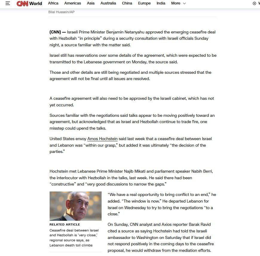 Home/WorldCNN: Netanyahu has approved the Lebanese ceasefire agreement in its entirety.Read0 -Monday 2024/11/25 - 21:57News Code:8813Share Take less than a minute, register and share your opinion under this post.Insulting or inciting messages will be deleted.Sign UpComming Up Next American announcements and warnings in Persianخواندن 0 Trump on how he got Hamas to accept the deal: I spoke a little bit tough and that was enough. That's what works in a tough world like this: You have to speak tough.خواندن 1 minute Venezuelan opposition leader Maria Corina Machado has won the 2025 Nobel Peace Prize.خواندن 0 Hamas statement: We announce the achievement of an agreement that will end the war on Gaza, the occupiers will withdraw from it, humanitarian aid will reach Gaza, and a prisoner exchange will take place.خواندن 1 minute Tom Barrack, U.S. Special Envoy: The Middle East is nothing but an illusion.خواندن 1 minuteMost ReadMemories of Akbar Hashemi - February 20, 2000 - Meeting with Abdullah Jasbi and Concerns About Election ResultsMovie / Where is Commander Morteza Talaie?Akbar Hashemi's memoirs - 1999 September 10 - The two-person political negotiations with Vaez Tabasi continued until he was escorted to Tehran, where Hashemi apparently decided to seriously participate in the sixth parliamentary elections.The records of the recent periods of the Islamic Council showed that the parliament is not in charge of affairs and cannot interfere or pass resolutions on the authority of the Commander-in-Chief of the Armed Forces at any level, let alone supervise.What will be the future of Iran with the announced candidates for the presidential election? / Conversation with Dr. Taghi Azad AramakiCan I feel tired with you?A Basiji veterinarian was appointed head of the health network instead of an otolaryngologist.Akbar Hashemi's memoirs - 1999 September 5 - The meeting of the senior managers of the judiciary with Hashemi Rafsanjani and their complaint about the neglect of Hashemi Shahroudi, the new head of the judiciary, continues.Memories of Akbar Hashemi - 1999 September 7 - In continuation of the efforts of the late Vaez Tabasi, who used to encourage Hashemi to participate in the elections in frequent meetings, this time he also met with Hashemi.Akbar Hashemi's memories - 1999 September 9 - Continued visits to the belongings, buildings and works of Astan Quds