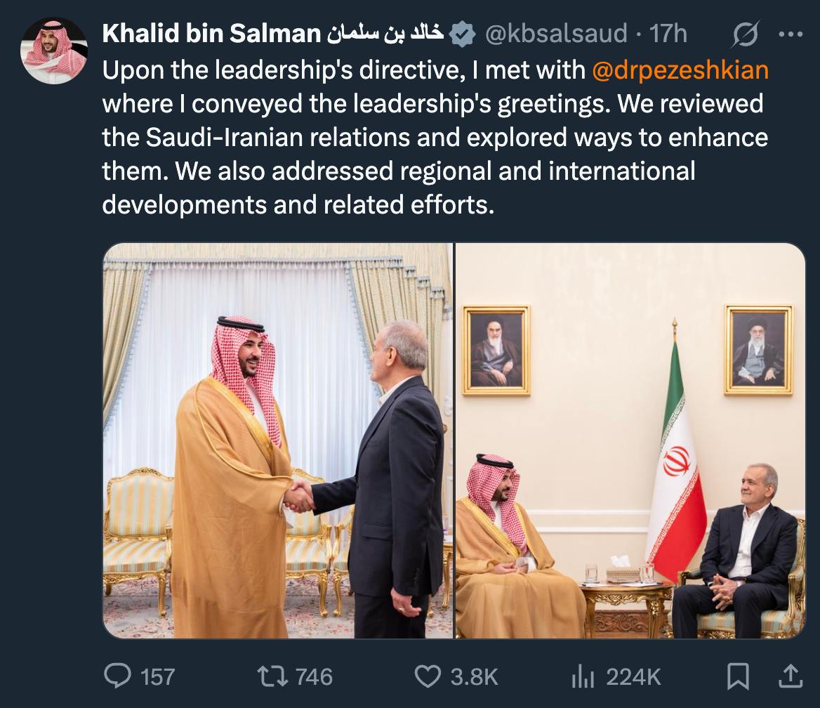 Home/World Saudi Defense Minister Khalid bin Salman tweets about meeting with Masoud PezeshkianRead1 minute -Friday 2025/04/18 - 15:39News Code:16514Share On the orders of the Supreme Leader, I met with the ninth president of the Islamic Republic of Iran and conveyed I met with the ninth president of the Islamic Republic of Iran on the orders of the leadership and announced the greeting of the leadership. We examined Saudi-Iranian relations and explored ways to strengthen them. We also addressed regional and international developments and related efforts. Take less than a minute, register and share your opinion under this post.Insulting or inciting messages will be deleted.Sign UpComming Up Next American announcements and warnings in Persianخواندن 0 Trump on how he got Hamas to accept the deal: I spoke a little bit tough and that was enough. That's what works in a tough world like this: You have to speak tough.خواندن 1 minute Venezuelan opposition leader Maria Corina Machado has won the 2025 Nobel Peace Prize.خواندن 0 Hamas statement: We announce the achievement of an agreement that will end the war on Gaza, the occupiers will withdraw from it, humanitarian aid will reach Gaza, and a prisoner exchange will take place.خواندن 1 minute Tom Barrack, U.S. Special Envoy: The Middle East is nothing but an illusion.خواندن 1 minuteMost ReadMemories of Akbar Hashemi - February 20, 2000 - Meeting with Abdullah Jasbi and Concerns About Election ResultsMovie / Where is Commander Morteza Talaie?Akbar Hashemi's memoirs - 1999 September 10 - The two-person political negotiations with Vaez Tabasi continued until he was escorted to Tehran, where Hashemi apparently decided to seriously participate in the sixth parliamentary elections.The records of the recent periods of the Islamic Council showed that the parliament is not in charge of affairs and cannot interfere or pass resolutions on the authority of the Commander-in-Chief of the Armed Forces at any level, let alone supervise.What will be the future of Iran with the announced candidates for the presidential election? / Conversation with Dr. Taghi Azad AramakiCan I feel tired with you?A Basiji veterinarian was appointed head of the health network instead of an otolaryngologist.Akbar Hashemi's memoirs - 1999 September 5 - The meeting of the senior managers of the judiciary with Hashemi Rafsanjani and their complaint about the neglect of Hashemi Shahroudi, the new head of the judiciary, continues.Memories of Akbar Hashemi - 1999 September 7 - In continuation of the efforts of the late Vaez Tabasi, who used to encourage Hashemi to participate in the elections in frequent meetings, this time he also met with Hashemi.Akbar Hashemi's memories - 1999 September 9 - Continued visits to the belongings, buildings and works of Astan Quds