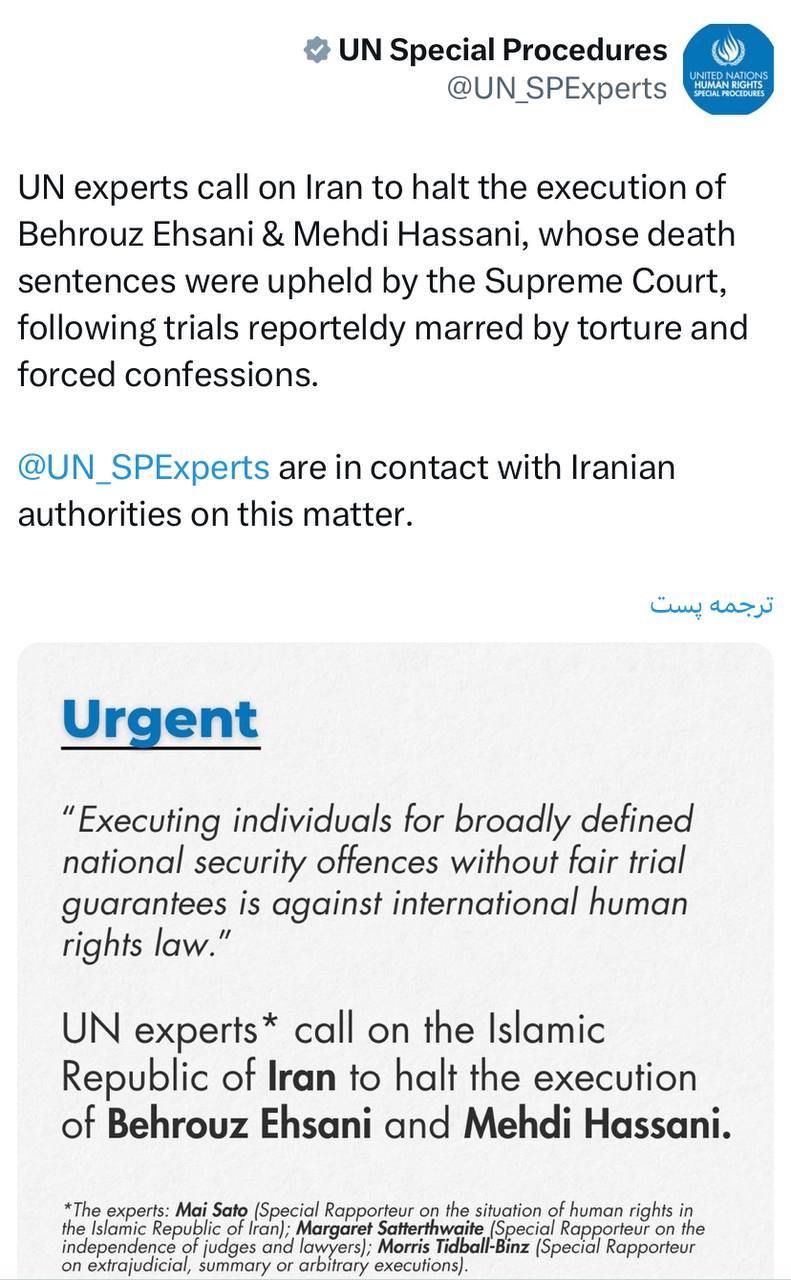 Home/World UN experts and rapporteurs called on Iran to halt the executions of Behrouz Ehsani and Mehdi Hassani. Read0 -Tuesday 2025/02/25 - 23:03News Code:14056Share Take less than a minute, register and share your opinion under this post.Insulting or inciting messages will be deleted.Sign UpComming Up Next American announcements and warnings in Persianخواندن 0 Trump on how he got Hamas to accept the deal: I spoke a little bit tough and that was enough. That's what works in a tough world like this: You have to speak tough.خواندن 1 minute Venezuelan opposition leader Maria Corina Machado has won the 2025 Nobel Peace Prize.خواندن 0 Hamas statement: We announce the achievement of an agreement that will end the war on Gaza, the occupiers will withdraw from it, humanitarian aid will reach Gaza, and a prisoner exchange will take place.خواندن 1 minute Tom Barrack, U.S. Special Envoy: The Middle East is nothing but an illusion.خواندن 1 minuteMost ReadMemories of Akbar Hashemi - February 20, 2000 - Meeting with Abdullah Jasbi and Concerns About Election ResultsMovie / Where is Commander Morteza Talaie?Akbar Hashemi's memoirs - 1999 September 10 - The two-person political negotiations with Vaez Tabasi continued until he was escorted to Tehran, where Hashemi apparently decided to seriously participate in the sixth parliamentary elections.The records of the recent periods of the Islamic Council showed that the parliament is not in charge of affairs and cannot interfere or pass resolutions on the authority of the Commander-in-Chief of the Armed Forces at any level, let alone supervise.What will be the future of Iran with the announced candidates for the presidential election? / Conversation with Dr. Taghi Azad AramakiCan I feel tired with you?A Basiji veterinarian was appointed head of the health network instead of an otolaryngologist.Akbar Hashemi's memoirs - 1999 September 5 - The meeting of the senior managers of the judiciary with Hashemi Rafsanjani and their complaint about the neglect of Hashemi Shahroudi, the new head of the judiciary, continues.Memories of Akbar Hashemi - 1999 September 7 - In continuation of the efforts of the late Vaez Tabasi, who used to encourage Hashemi to participate in the elections in frequent meetings, this time he also met with Hashemi.Akbar Hashemi's memories - 1999 September 9 - Continued visits to the belongings, buildings and works of Astan Quds