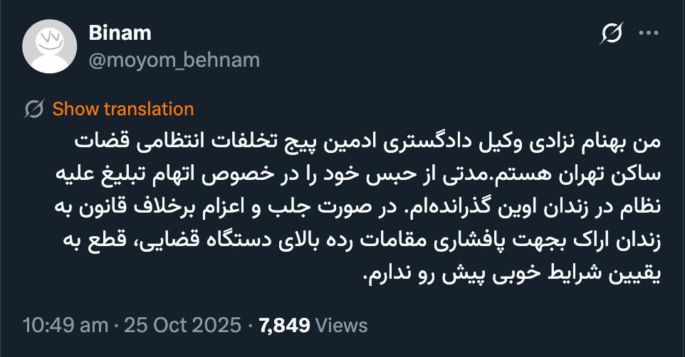 خانه/حقوقی آقای بهنام نزادی درود مراتب را شخصاً یا توسط وکیل خودتان، مستندا به آقای منصوری معاون دادستان کل کشور در امور نظارت بر ضابطین و دادسراهای کشور و آقای جعفری معاون نظارت و ارزشیابی قضات در دادسرای انتظامی قضات گزارش کنید.خواندن1 دقیقه -شنبه 1404/08/03 - 22:06کد خبر23232اشتراکگذاری اینکه مقام مجری حکم اصرار دارد حتما در زندان اراک تحمل کیفر کنید و ساکن تهران هستید و از اعطای نیابت به دادستان عمومی و انقلاب تهران خودداری میکنداینکه مقام مجری حکم اصرار دارد حتما در زندان اراک تحمل کیفر کنید و ساکن تهران هستید و از اعطای نیابت به دادستان عمومی و انقلاب تهران خودداری میکند و همچنین ایام بازداشت قبلی در زندان اوین را به عنوان بازداشت غیر قانونی قلمداد میکند و مشخص نیست پس چگونه شما در حبس بودید را به آنها منعکس کنید.همچنین توصیه میکنم حتی اگر قرار منع تعقیب احتمالی برای قاضی یا قضات مورد نظر صادر شود برای اینکه سابقهای باشد شکایت کیفری در دادسرای کارکنان دولت مطرح کنید. کمتر از یک دقیقه زمان بگذارید، ثبتنام کنید و نظرتان را زیر همین پست به اشتراک بگذارید.پیامهای توهینآمیز و یا حاوی دعوت به خشونت حذف خواهند شد.ثبت نامدر ادامه بخوانید یک سوال در مورد پرونده قضایی بانک آینده و علی انصاریخواندن 1 دقیقه صرف نظر از اینکه این حساب کاربری به شیخ غلامحسین محسنی اژیه منتسب است یا نه؟خواندن 1 دقیقه یادداشت من در مورد تیم حاکم بر قوه قضاییه و دستگاه های دیگر بدون اینکه قضاوتی علیه یا له آنان کنم که یادتان هست؟خواندن 1 دقیقه حاج حبیبالله حقیقی معاون سابق وزارت اطلاعات رییس حفاظت اطلاعات قوه قضاییه نشد اما...خواندن 1 دقیقه بخشنامه مهم سرجمع مستند به بند (و) ماده ۱۲ آنخواندن 1 دقیقهباید خواندخاطرات اکبر هاشمی - ۱ اسفند ۱۳۷۸ - ملاقات عبدالله جاسبی و نگرانی از نتایج انتخاباتفیلم/ سردار مرتضی طلایی کجاست؟خاطرات اکبر هاشمی - ۱۹ شهريور ۱۳۷۸ - مذاکرات دو نفره سیاسی با واعظ طبسی تا هنگام بدرقه به سوی تهران هم ادامه داشته که در نهایت هاشمی ظاهرا از اینجا تصمیم به شرکت جدی در انتخابات مجلس ششم گرفتسوابق ادوار اخیر مجلس شورای اسلامی نشان داد که مجلس در راس امور نیست و در اختیارات فرمانده کل قوا و نیروهای مسلح در هیچ سطحی نمیتواند دخالت و یا مصوبه طی کند، چه برسد که نظارت کندآینده ایران با نامزدهای اعلام شده انتخابات ریاست جمهوری چه میشود؟ / گفتگو با دکتر تقی آزاد ارمکیمیشه با شما احساس خستگی کرد؟یک دامپزشک بسیجی بجای جراح گوش و حلق و بینی سرپرست شبکه بهداشت ایذه شد!خاطرات اکبر هاشمی - ۱۴ شهريور ۱۳۷۸ - دیدار مدیران ارشد دستگاه قضایی با هاشمی رفسنجانی و گله آنان از بی توجهی هاشمی شاهرودی رییس جدید قوه قضاییه ادامه داردخاطرات اکبر هاشمی - ۱۶ شهريور ۱۳۷۸ - در ادامه تلاش های مرحوم واعظ طبسی که در دیدارهای مکرر برای تشویق هاشمی به شرکت در انتخابات اقدام میکرد این بار هم او با هاشمی ملاقات کردخاطرات اکبر هاشمی - ۱۸ شهريور ۱۳۷۸ - ادامه بازدید ها از متعلقات و ابنیه و آثار آستان قدس