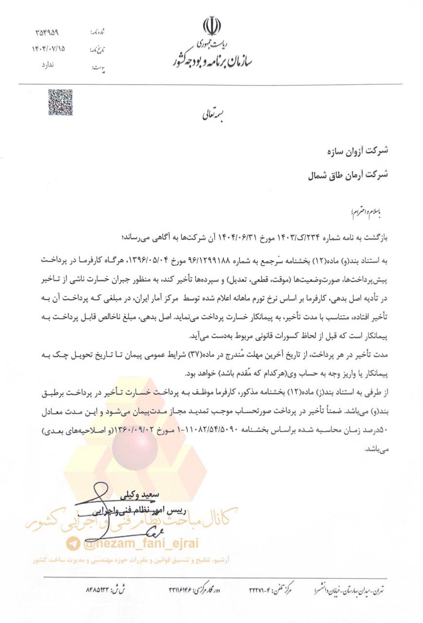 خانه/حقوقیبخشنامه مهم سرجمع مستند به بند (و) ماده ۱۲ آنخواندن1 دقیقه -چهارشنبه 1404/07/30 - 23:24کد خبر23169اشتراکگذاری مبنای محاسبه خسارت، نرخ تورم ماهانه اعلامشده توسط مرکز آمار ایران میباشدتاریخ تنظیم نامه: ۱۴۰۴/۰۷/۱۵ کارفرما درصورت تأخیر در پرداخت پیشپرداخت، صورت وضعیتهای موقت یا قطعی، تعدیل و سپردهها، موظف به پرداخت خسارت تأخیر است مبنای محاسبه خسارت، نرخ تورم ماهانه اعلامشده توسط مرکز آمار ایران میباشد اصل بدهی برای محاسبه خسارت، مبلغ ناخالص قابل پرداخت به پیمانکار پیش از کسورات قانونی است مدت تأخیر از تاریخ پایان مهلت مندرج در ماده ۳۷ شرایط عمومی پیمان تا زمان تحویل چک یا واریز وجه (هرکدام زودتر باشد) محاسبه میشود طبق بند (ز) ماده ۱۲، پرداخت خسارت تأخیر توسط کارفرما الزامی است و جنبه اختیاری ندارد تأخیر در پرداختها موجب تمدید مدت مجاز پیمان میشود میزان تمدید مدت پیمان برابر است با ۵۰٪ زمان تأخیر محاسبهشده طبق بخشنامه۱۱۰۸۲/۵۴/۵۰۹۰-۱ مورخ ۱۳۶۰/۰۹/۰۲ و اصلاحیههای بعدی آنسازمان برنامه و بودجه کشوررئیس امور نظام فنی و اجرایی کشورمباحث نظام فنی و اجرایی کشور کمتر از یک دقیقه زمان بگذارید، ثبتنام کنید و نظرتان را زیر همین پست به اشتراک بگذارید.پیامهای توهینآمیز و یا حاوی دعوت به خشونت حذف خواهند شد.ثبت نامدر ادامه بخوانید حاج حبیبالله حقیقی معاون سابق وزارت اطلاعات رییس حفاظت اطلاعات قوه قضاییه نشد اما...خواندن 1 دقیقه آقای مدیرعامل خبرگزاری میزان درود بالاخره این حساب کاربری متعلق به شیخ غلامحسین محسنی اژیه هست یا خیر؟خواندن 1 دقیقه مفهوم مخالف این اقرار این است که تا الان هم در اعلام جرم تاخیر کرده ایم و مصلحت در این اقدام نبوده.خواندن 1 دقیقه خبر مهم رئیس دستگاه قضا در مورد وضعیت بانک آیندهخواندن 1 دقیقه نامه تعدادی از زندانیان زندان تهرانبزرگ درباره وضعیت فاجعهبار آب آشامیدنی و بهداشتی این زندانخواندن 3 دقیقهباید خواندخاطرات اکبر هاشمی - ۱ اسفند ۱۳۷۸ - ملاقات عبدالله جاسبی و نگرانی از نتایج انتخاباتفیلم/ سردار مرتضی طلایی کجاست؟خاطرات اکبر هاشمی - ۱۹ شهريور ۱۳۷۸ - مذاکرات دو نفره سیاسی با واعظ طبسی تا هنگام بدرقه به سوی تهران هم ادامه داشته که در نهایت هاشمی ظاهرا از اینجا تصمیم به شرکت جدی در انتخابات مجلس ششم گرفتسوابق ادوار اخیر مجلس شورای اسلامی نشان داد که مجلس در راس امور نیست و در اختیارات فرمانده کل قوا و نیروهای مسلح در هیچ سطحی نمیتواند دخالت و یا مصوبه طی کند، چه برسد که نظارت کندآینده ایران با نامزدهای اعلام شده انتخابات ریاست جمهوری چه میشود؟ / گفتگو با دکتر تقی آزاد ارمکیمیشه با شما احساس خستگی کرد؟یک دامپزشک بسیجی بجای جراح گوش و حلق و بینی سرپرست شبکه بهداشت ایذه شد!خاطرات اکبر هاشمی - ۱۴ شهريور ۱۳۷۸ - دیدار مدیران ارشد دستگاه قضایی با هاشمی رفسنجانی و گله آنان از بی توجهی هاشمی شاهرودی رییس جدید قوه قضاییه ادامه داردخاطرات اکبر هاشمی - ۱۶ شهريور ۱۳۷۸ - در ادامه تلاش های مرحوم واعظ طبسی که در دیدارهای مکرر برای تشویق هاشمی به شرکت در انتخابات اقدام میکرد این بار هم او با هاشمی ملاقات کردخاطرات اکبر هاشمی - ۱۸ شهريور ۱۳۷۸ - ادامه بازدید ها از متعلقات و ابنیه و آثار آستان قدس