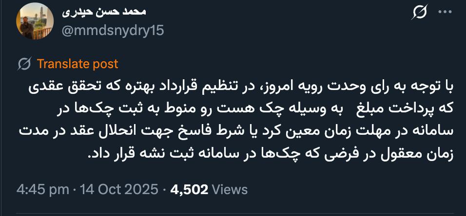 خانه/حقوقیپیشنهاد یک وکیل دادگستری برای تنظیم قراردهای دارای چک با توجه به رای وحدت رویه اخیر دیوان عالی کشورخواندن0 -جمعه 1404/07/25 - 10:33کد خبر23073اشتراکگذاری کمتر از یک دقیقه زمان بگذارید، ثبتنام کنید و نظرتان را زیر همین پست به اشتراک بگذارید.پیامهای توهینآمیز و یا حاوی دعوت به خشونت حذف خواهند شد.ثبت نامدر ادامه بخوانید کاش اصحاب حقوق بیشتر دقت کنند که محکوم_علیه صحیح است نه مجرم.خواندن 1 دقیقه درود به این قاضی شریف و سپاس از شما برای به اشتراک گذاشتن این رای ارزشمند و انسانی و با امید به اینکه در مراحل بعدی نقض نشودخواندن 1 دقیقه نشست قضایی دادگستری تهران درباره وضعیت رد مال در صورت فوت متهمخواندن 1 دقیقه بخشی در دادسرای عمومی و انقلاب ناحیه ۲۰ تهران در حال رسیدگی است مابقی هم در مرکز حقوقی بین المللی ریاست جمهوری در حال تهیه استخواندن 1 دقیقه رئیس قوه قضاییه: پرونده شهادت حجتالاسلاموالمسلمین حیدری به سرعت رسیدگی شودخواندن 1 دقیقهباید خواندخاطرات اکبر هاشمی - ۱ اسفند ۱۳۷۸ - ملاقات عبدالله جاسبی و نگرانی از نتایج انتخاباتفیلم/ سردار مرتضی طلایی کجاست؟خاطرات اکبر هاشمی - ۱۹ شهريور ۱۳۷۸ - مذاکرات دو نفره سیاسی با واعظ طبسی تا هنگام بدرقه به سوی تهران هم ادامه داشته که در نهایت هاشمی ظاهرا از اینجا تصمیم به شرکت جدی در انتخابات مجلس ششم گرفتسوابق ادوار اخیر مجلس شورای اسلامی نشان داد که مجلس در راس امور نیست و در اختیارات فرمانده کل قوا و نیروهای مسلح در هیچ سطحی نمیتواند دخالت و یا مصوبه طی کند، چه برسد که نظارت کندآینده ایران با نامزدهای اعلام شده انتخابات ریاست جمهوری چه میشود؟ / گفتگو با دکتر تقی آزاد ارمکیمیشه با شما احساس خستگی کرد؟یک دامپزشک بسیجی بجای جراح گوش و حلق و بینی سرپرست شبکه بهداشت ایذه شد!خاطرات اکبر هاشمی - ۱۴ شهريور ۱۳۷۸ - دیدار مدیران ارشد دستگاه قضایی با هاشمی رفسنجانی و گله آنان از بی توجهی هاشمی شاهرودی رییس جدید قوه قضاییه ادامه داردخاطرات اکبر هاشمی - ۱۶ شهريور ۱۳۷۸ - در ادامه تلاش های مرحوم واعظ طبسی که در دیدارهای مکرر برای تشویق هاشمی به شرکت در انتخابات اقدام میکرد این بار هم او با هاشمی ملاقات کردخاطرات اکبر هاشمی - ۱۸ شهريور ۱۳۷۸ - ادامه بازدید ها از متعلقات و ابنیه و آثار آستان قدس