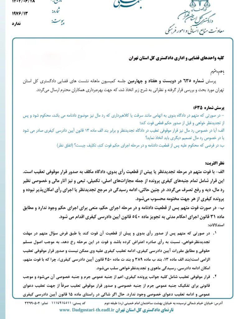 خانه/حقوقی نشست قضایی دادگستری تهران درباره وضعیت رد مال در صورت فوت متهمخواندن1 دقیقه -شنبه 1404/07/19 - 13:13کد خبر23024اشتراکگذاری در صورت فوت متهم پیش از قطعیت حکم (در مرحله تجدیدنظر)، صدور قرار موقوفی تعقیب برای کلیه تصویر تصویر تصویر در پاسخ به پرسش درباره وضعیت رد مال در صورت فوت متهم، نشست قضایی دادگستری استان تهران با اکثریت آرا نظر داده است که با فوت متهم پیش از قطعیت حکم، کل پرونده کیفری از جمله رد مال مختومه میشود.نظر اکثریت (اتفاقی):- در صورت فوت متهم پیش از قطعیت حکم (در مرحله تجدیدنظر)، صدور قرار موقوفی تعقیب برای کلیه جنبههای پرونده از جمله رد مال الزامی است. این قرار شامل تمام آثار کیفری و مالی مانند مجازاتها، رد مال و دیه میشود.- در صورت فوت متهم پس از قطعیت حکم، اجرای حکم از ترکه متوفی امکانپذیر است.استدلالهای کلیدی اکثریت:1. قانون آیین دادرسی کیفری تفکیک جنبه عمومی و خصوصی جرم در صورت فوت متهم را مجاز نمیداند.2. تحقق مسئولیت کیفری و تبعات آن منوط به حیات متهم تا پایان رسیدگی است.3. رویه قضایی غالب و آرای دیوان عالی کشور موید این تفسیر است. کمتر از یک دقیقه زمان بگذارید، ثبتنام کنید و نظرتان را زیر همین پست به اشتراک بگذارید.پیامهای توهینآمیز و یا حاوی دعوت به خشونت حذف خواهند شد.ثبت نامدر ادامه بخوانید بخشی در دادسرای عمومی و انقلاب ناحیه ۲۰ تهران در حال رسیدگی است مابقی هم در مرکز حقوقی بین المللی ریاست جمهوری در حال تهیه استخواندن 1 دقیقه رئیس قوه قضاییه: پرونده شهادت حجتالاسلاموالمسلمین حیدری به سرعت رسیدگی شودخواندن 1 دقیقه بهنام نزادی وکیل دادگستری با تقدیم دادخواستی به هیئت عمومی دیوان عدالت اداری محدودیت سطح عملیات بانکی مشتریان موسسات اعتباری را برابر رای قبلی مشابه هیئت عمومی دیوان عدالت اداری خارج از حدود اختیارات مرکز اطلاعات مالی دانسته و تقاضای ابطال آن را نمود.خواندن 1 دقیقه اخطار دادگستری کل استان خراسان رضوی به کانون های وکلا برای عدم استفاده از کد ملی: ۱۱۱۱۱۱۱۱۱۱خواندن 1 دقیقه هیات دادرسان شعبه ۳۱ دادگاه تجدید نظر تهران به ریاست حسن امین ناصری (معاون سابق دادستان و سرپرست دادسرای ویژه امنیت تهران) بهنام نزادی وکیل دادگستری را از محکومیت عجیب و غریب گذراندن دوره روانی و اضطراب و آموزش تخلفات انتظامی قضات بدل از حبس، تبرئه کرد.خواندن 1 دقیقهباید خواندخاطرات اکبر هاشمی - ۱ اسفند ۱۳۷۸ - ملاقات عبدالله جاسبی و نگرانی از نتایج انتخاباتفیلم/ سردار مرتضی طلایی کجاست؟خاطرات اکبر هاشمی - ۱۹ شهريور ۱۳۷۸ - مذاکرات دو نفره سیاسی با واعظ طبسی تا هنگام بدرقه به سوی تهران هم ادامه داشته که در نهایت هاشمی ظاهرا از اینجا تصمیم به شرکت جدی در انتخابات مجلس ششم گرفتسوابق ادوار اخیر مجلس شورای اسلامی نشان داد که مجلس در راس امور نیست و در اختیارات فرمانده کل قوا و نیروهای مسلح در هیچ سطحی نمیتواند دخالت و یا مصوبه طی کند، چه برسد که نظارت کندآینده ایران با نامزدهای اعلام شده انتخابات ریاست جمهوری چه میشود؟ / گفتگو با دکتر تقی آزاد ارمکیمیشه با شما احساس خستگی کرد؟یک دامپزشک بسیجی بجای جراح گوش و حلق و بینی سرپرست شبکه بهداشت ایذه شد!خاطرات اکبر هاشمی - ۱۴ شهريور ۱۳۷۸ - دیدار مدیران ارشد دستگاه قضایی با هاشمی رفسنجانی و گله آنان از بی توجهی هاشمی شاهرودی رییس جدید قوه قضاییه ادامه داردخاطرات اکبر هاشمی - ۱۶ شهريور ۱۳۷۸ - در ادامه تلاش های مرحوم واعظ طبسی که در دیدارهای مکرر برای تشویق هاشمی به شرکت در انتخابات اقدام میکرد این بار هم او با هاشمی ملاقات کردخاطرات اکبر هاشمی - ۱۸ شهريور ۱۳۷۸ - ادامه بازدید ها از متعلقات و ابنیه و آثار آستان قدس