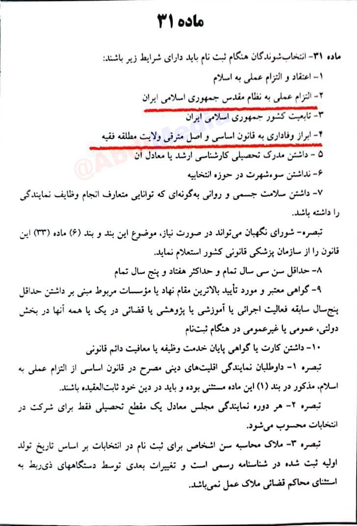 خانه/سیاستماده ۳۱ قانون انتخابات مجلس و بندهای آن را دقت بفرماییدخواندن1 دقیقه -جمعه 1403/07/06 - 18:53کد خبر4410اشتراکگذاری علاوه بر التزام «عملی» به نظام مقدس جمهوری اسلامی ایران ابراز وفاداری به قانون اساسی و اصل مترقی #ولایتمطلقه فقیه، بشرح قانون اساسی از شروط داوطلبان میباشد که بدیهی است تبلور آن در اصل۵۷ متمم قانون اساسی مصوب ۱۳۶۸ است.پیش از این در یادداشت جداگانهای در عبدی مدیا به شتاب و سهل انگاری شورای بازنگری قانون اساسی پس از اصلاح اصل ۵۷ و ۱۰۷ برای حذف قسمت اخیر اصل ۱۰۷ «رهبر در برابر قوانین با سایر افراد کشور مساوی است» اشاره کردم.این عبارت را عملاً در دوره فعلی ساختار جمهوری اسلامی باید امری تعلیق به محال فرض کرد. کمتر از یک دقیقه زمان بگذارید، ثبتنام کنید و نظرتان را زیر همین پست به اشتراک بگذارید.پیامهای توهینآمیز و یا حاوی دعوت به خشونت حذف خواهند شد.ثبت نامدر ادامه بخوانید وضعیت سری تر و پیچیده تر از مواردی است که رسانه ها یا مردم یا حتی به جز حلقه های خیلی خاص پیرامون رهبر جمهوری اسلامی بدانند.خواندن 1 دقیقه آیا جمهوری اسلامی برای اعمال جراحی اقتصادی و امورات دیگر همچنان به فضای جنگی نیاز دارد؟خواندن 1 دقیقه بسیار متاثرم باید دستگاه های بازداشت کننده امکان تماس با خانواده را طبق قانون آیین دادرسی کیفری مهیا کنند.خواندن 1 دقیقه منظورم مطلقا سید مجتبی خامنهای یا هیچ یک از وابستگان به خانواده آیتالله خامنهای نیست.خواندن 1 دقیقه روحانی یا روحانیون؟!!خواندن 1 دقیقهباید خواندخاطرات اکبر هاشمی - ۱ اسفند ۱۳۷۸ - ملاقات عبدالله جاسبی و نگرانی از نتایج انتخاباتفیلم/ سردار مرتضی طلایی کجاست؟خاطرات اکبر هاشمی - ۱۹ شهريور ۱۳۷۸ - مذاکرات دو نفره سیاسی با واعظ طبسی تا هنگام بدرقه به سوی تهران هم ادامه داشته که در نهایت هاشمی ظاهرا از اینجا تصمیم به شرکت جدی در انتخابات مجلس ششم گرفتسوابق ادوار اخیر مجلس شورای اسلامی نشان داد که مجلس در راس امور نیست و در اختیارات فرمانده کل قوا و نیروهای مسلح در هیچ سطحی نمیتواند دخالت و یا مصوبه طی کند، چه برسد که نظارت کندآینده ایران با نامزدهای اعلام شده انتخابات ریاست جمهوری چه میشود؟ / گفتگو با دکتر تقی آزاد ارمکیمیشه با شما احساس خستگی کرد؟یک دامپزشک بسیجی بجای جراح گوش و حلق و بینی سرپرست شبکه بهداشت ایذه شد!خاطرات اکبر هاشمی - ۱۴ شهريور ۱۳۷۸ - دیدار مدیران ارشد دستگاه قضایی با هاشمی رفسنجانی و گله آنان از بی توجهی هاشمی شاهرودی رییس جدید قوه قضاییه ادامه داردخاطرات اکبر هاشمی - ۱۶ شهريور ۱۳۷۸ - در ادامه تلاش های مرحوم واعظ طبسی که در دیدارهای مکرر برای تشویق هاشمی به شرکت در انتخابات اقدام میکرد این بار هم او با هاشمی ملاقات کردخاطرات اکبر هاشمی - ۱۸ شهريور ۱۳۷۸ - ادامه بازدید ها از متعلقات و ابنیه و آثار آستان قدس