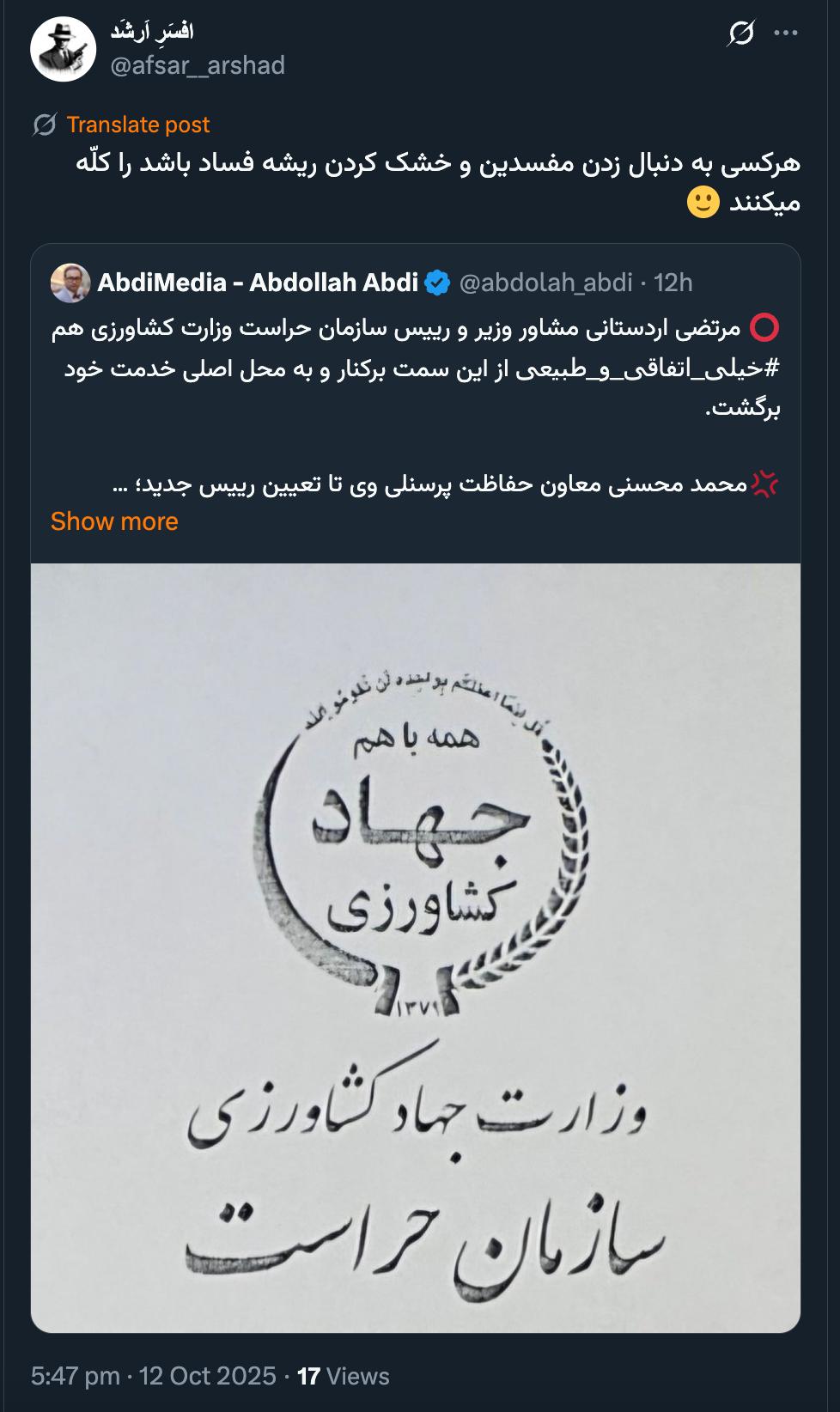 خانه/سیاستعجیب ترین پروندهای که همه تلاش خود را میکنند تا سرنخ ها و ارتباطات ذی نفعان را مسدود کنند و دیدهام، پدیده گروه مالی زاویه است که تا کنون بدون انتشار جزییات در عبدی مدیا به آن پرداختهامخواندن1 دقیقه -دوشنبه 1404/07/21 - 10:05کد خبر23038اشتراکگذاری هرکسی به دنبال زدن مفسدین و خشک کردن ریشه فساد باشد را کلّه میکنند 🙂 https://t.co/QrfT26Kgnt— افسَرِ اَرشَد (@afsar__arshad) October 12, 2025🔴 درودعجیب ترین پروندهای که همه تلاش خود را میکنند تا سرنخ ها و ارتباطات ذی نفعان را مسدود کنند و دیدهام، پدیده #گروه_مالی_زاویه است که تا کنون بدون انتشار جزییات در عبدی مدیا به آن پرداختهام— AbdiMedia - Abdollah Abdi (@abdolah_abdi) October 12, 2025اخبار مرتبط مرتضی اردستانی مشاور وزیر و رییس سازمان حراست وزارت کشاورزی هم خیلی اتفاقی و طبیعی از این سمت برکنار و به محل اصلی خدمت خود برگشت. کمتر از یک دقیقه زمان بگذارید، ثبتنام کنید و نظرتان را زیر همین پست به اشتراک بگذارید.پیامهای توهینآمیز و یا حاوی دعوت به خشونت حذف خواهند شد.ثبت نامدر ادامه بخوانید شمخانی: چون در حال تحریم هستیم هیچ جای دنیا با ما کار تسلیحاتی جدی نمیکندخواندن 1 دقیقه شمخانی: جمهوری اسلامی تجربه جنگ مستقیم با اسرائیل را نداشتخواندن 1 دقیقه شمخانی درباره عملیات عینالاسد: سریع و کافی بودخواندن 1 دقیقه اظهارات جنجالی شمخانی: در ماجرای هواپیمای اوکراینی، آقای روحانی از اول در جریان بودخواندن 1 دقیقه مرتضی اردستانی مشاور وزیر و رییس سازمان حراست وزارت کشاورزی هم خیلی اتفاقی و طبیعی از این سمت برکنار و به محل اصلی خدمت خود برگشت.خواندن 1 دقیقهباید خواندخاطرات اکبر هاشمی - ۱ اسفند ۱۳۷۸ - ملاقات عبدالله جاسبی و نگرانی از نتایج انتخاباتفیلم/ سردار مرتضی طلایی کجاست؟خاطرات اکبر هاشمی - ۱۹ شهريور ۱۳۷۸ - مذاکرات دو نفره سیاسی با واعظ طبسی تا هنگام بدرقه به سوی تهران هم ادامه داشته که در نهایت هاشمی ظاهرا از اینجا تصمیم به شرکت جدی در انتخابات مجلس ششم گرفتسوابق ادوار اخیر مجلس شورای اسلامی نشان داد که مجلس در راس امور نیست و در اختیارات فرمانده کل قوا و نیروهای مسلح در هیچ سطحی نمیتواند دخالت و یا مصوبه طی کند، چه برسد که نظارت کندآینده ایران با نامزدهای اعلام شده انتخابات ریاست جمهوری چه میشود؟ / گفتگو با دکتر تقی آزاد ارمکیمیشه با شما احساس خستگی کرد؟یک دامپزشک بسیجی بجای جراح گوش و حلق و بینی سرپرست شبکه بهداشت ایذه شد!خاطرات اکبر هاشمی - ۱۴ شهريور ۱۳۷۸ - دیدار مدیران ارشد دستگاه قضایی با هاشمی رفسنجانی و گله آنان از بی توجهی هاشمی شاهرودی رییس جدید قوه قضاییه ادامه داردخاطرات اکبر هاشمی - ۱۶ شهريور ۱۳۷۸ - در ادامه تلاش های مرحوم واعظ طبسی که در دیدارهای مکرر برای تشویق هاشمی به شرکت در انتخابات اقدام میکرد این بار هم او با هاشمی ملاقات کردخاطرات اکبر هاشمی - ۱۸ شهريور ۱۳۷۸ - ادامه بازدید ها از متعلقات و ابنیه و آثار آستان قدس