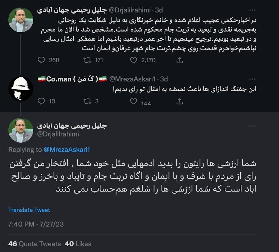 خانه/سیاستبعد از توییت حاشیهدار نسبت به سید مصطفی محقق داماد این بار توییت نماینده مجلس نسبت به ارزشیهاخواندن1 دقیقه -چهارشنبه 1403/07/04 - 08:07کد خبر3933اشتراکگذاری آیا واقعا آقای نماینده مجلس انقلابی متوجه ابعاد و اطراف توییتهای خود هست؟ کمتر از یک دقیقه زمان بگذارید، ثبتنام کنید و نظرتان را زیر همین پست به اشتراک بگذارید.پیامهای توهینآمیز و یا حاوی دعوت به خشونت حذف خواهند شد.ثبت نامدر ادامه بخوانید وضعیت سری تر و پیچیده تر از مواردی است که رسانه ها یا مردم یا حتی به جز حلقه های خیلی خاص پیرامون رهبر جمهوری اسلامی بدانند.خواندن 1 دقیقه آیا جمهوری اسلامی برای اعمال جراحی اقتصادی و امورات دیگر همچنان به فضای جنگی نیاز دارد؟خواندن 1 دقیقه بسیار متاثرم باید دستگاه های بازداشت کننده امکان تماس با خانواده را طبق قانون آیین دادرسی کیفری مهیا کنند.خواندن 1 دقیقه منظورم مطلقا سید مجتبی خامنهای یا هیچ یک از وابستگان به خانواده آیتالله خامنهای نیست.خواندن 1 دقیقه روحانی یا روحانیون؟!!خواندن 1 دقیقهباید خواندخاطرات اکبر هاشمی - ۱ اسفند ۱۳۷۸ - ملاقات عبدالله جاسبی و نگرانی از نتایج انتخاباتفیلم/ سردار مرتضی طلایی کجاست؟خاطرات اکبر هاشمی - ۱۹ شهريور ۱۳۷۸ - مذاکرات دو نفره سیاسی با واعظ طبسی تا هنگام بدرقه به سوی تهران هم ادامه داشته که در نهایت هاشمی ظاهرا از اینجا تصمیم به شرکت جدی در انتخابات مجلس ششم گرفتسوابق ادوار اخیر مجلس شورای اسلامی نشان داد که مجلس در راس امور نیست و در اختیارات فرمانده کل قوا و نیروهای مسلح در هیچ سطحی نمیتواند دخالت و یا مصوبه طی کند، چه برسد که نظارت کندآینده ایران با نامزدهای اعلام شده انتخابات ریاست جمهوری چه میشود؟ / گفتگو با دکتر تقی آزاد ارمکیمیشه با شما احساس خستگی کرد؟یک دامپزشک بسیجی بجای جراح گوش و حلق و بینی سرپرست شبکه بهداشت ایذه شد!خاطرات اکبر هاشمی - ۱۴ شهريور ۱۳۷۸ - دیدار مدیران ارشد دستگاه قضایی با هاشمی رفسنجانی و گله آنان از بی توجهی هاشمی شاهرودی رییس جدید قوه قضاییه ادامه داردخاطرات اکبر هاشمی - ۱۶ شهريور ۱۳۷۸ - در ادامه تلاش های مرحوم واعظ طبسی که در دیدارهای مکرر برای تشویق هاشمی به شرکت در انتخابات اقدام میکرد این بار هم او با هاشمی ملاقات کردخاطرات اکبر هاشمی - ۱۸ شهريور ۱۳۷۸ - ادامه بازدید ها از متعلقات و ابنیه و آثار آستان قدس