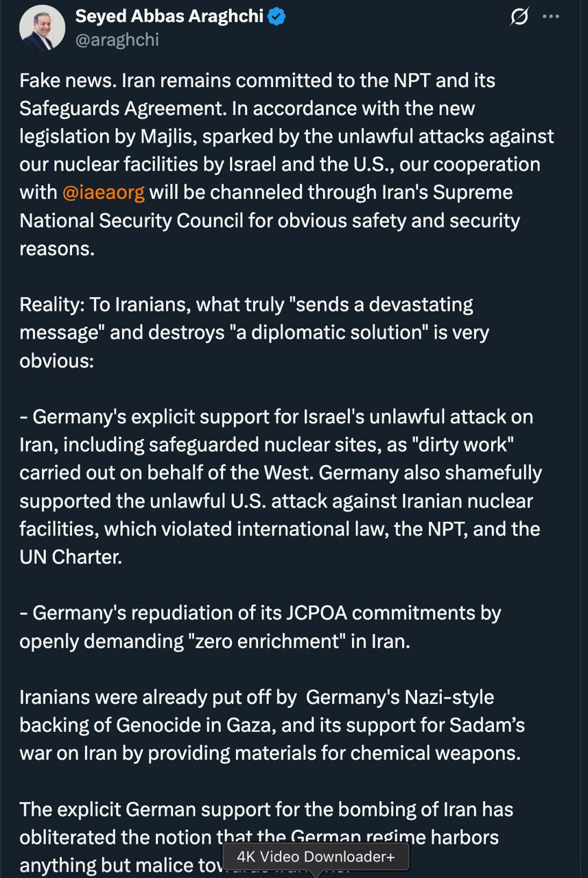 خانه/سیاست واکنش عراقچی به اظهارات وزارت خارجۀ آلمان در ایکسخواندن1 دقیقه -پنجشنبه 1404/04/12 - 17:02کد خبر20801اشتراکگذاری ایران همچنان به معاهدهۀعدم اشاعه و توافقنامه پادمان پایبند است. مطابق با قانون جدید مصوب مجلسایران همچنان به معاهدهۀعدم اشاعه و توافقنامه پادمان پایبند است. مطابق با قانون جدید مصوب مجلس که در واکنش به حملات غیرقانونی علیه تأسیسات هستهای ایران توسط اسرائیل و آمریکا تصویب شد، همکاری ایران با آژانس بهدلایل بدیهی ایمنی و امنیتی، صرفا از طریق شورای عالی امنیت ملی ایران ساماندهی خواهد شد.واقعیت این است: برای مردم ایران، آنچه واقعاً «پیام ویرانگر» میفرستد و «راهحل دیپلماتیک» را نابود میکند، کاملاً آشکار است.حمایت آشکار آلمان از حملۀ غیرقانونی اسرائیل به ایران، از جمله حمله به تأسیسات هستهای تحت پادمان، که آن را «کار کثیف» انجامشده به نیابت از غرب توصیف کردند.آلمان همچنین با وقاحت از حملۀ غیرقانونی آمریکا به تأسیسات هستهای ایران حمایت کرد؛ حملهای که ناقض حقوق بینالملل، معاهده عدم اشاعه و منشور سازمان ملل بود.نقض صریح تعهدات برجامی از سوی آلمان، از طریق مطالبه آشکار «غنیسازی صفر» در ایران.ایرانیها پیش از این نیز، از حمایت نازیگونۀ دولت آلمان از نسلکشی در غزه و همچنین حمایت آن از جنگ صدام علیه ایران از طریق تأمین مواد لازم برای ساخت سلاحهای شیمیایی، منزجر و بیزار بودند.اکنون، حمایت آشکار آلمان از بمباران ایران، این تصور را بهطور کامل از بین برده که رژیم آلمان چیزی جز سوءنیت و دشمنی نسبت به ملت ایران در سر دارد.اخبار مرتبط وزارت خارجه آلمان: تصمیم ایران برای تعلیق همکاری با آژانس پیام ویرانگری ارسال میکند: این اقدام هرگونه امکان نظارت بینالمللی بر برنامه هستهای ایران را که برای یک راهحل دیپلماتیک بسیار مهم است، از بین میبرد. ایران باید این تصمیم را لغو کند. کمتر از یک دقیقه زمان بگذارید، ثبتنام کنید و نظرتان را زیر همین پست به اشتراک بگذارید.پیامهای توهینآمیز و یا حاوی دعوت به خشونت حذف خواهند شد.ثبت نامدر ادامه بخوانید پاسخ های توئیتری ۱۳ مهرخواندن 1 دقیقه آقای رحیمی درود صرف نظر از اینکه بایسته آن بود یک حساب کاربری از ابتدا به نام خود ایجاد می کردید و برای شفافیت موارد اقدام می کردید نه این حساب کاربری انتقال یافته به نام شماخواندن 2 دقیقه البته توصیه آیتالله سبحانی اگر به آیتالله خامنهای ارسال میشد تا نظر فقهی خود را در صورت انطباق با نظر آیتالله سبحانی برای اعمال به مجمع تشخیص مصلحت و مجلس و شورای نگهبان ارجاع میداد، کاربردی تر بود.خواندن 1 دقیقه البته عجیب است مسئولان قوه قضاییه بویژه دادسرا و دادگاه های ویژه روحانیت هم برای این قاضی پیشین خود پیام تسلیت علنی هم ندادند.خواندن 1 دقیقه تابناک زیر تیغ داماد برادر محسن / داماد سرلشگر محسن رضایی از پدر همسرش خواست تا درباره ارتباطش با رسانه تابناک شفاف سازی کندخواندن 1 دقیقهباید خواندخاطرات اکبر هاشمی - ۱ اسفند ۱۳۷۸ - ملاقات عبدالله جاسبی و نگرانی از نتایج انتخاباتفیلم/ سردار مرتضی طلایی کجاست؟خاطرات اکبر هاشمی - ۱۹ شهريور ۱۳۷۸ - مذاکرات دو نفره سیاسی با واعظ طبسی تا هنگام بدرقه به سوی تهران هم ادامه داشته که در نهایت هاشمی ظاهرا از اینجا تصمیم به شرکت جدی در انتخابات مجلس ششم گرفتسوابق ادوار اخیر مجلس شورای اسلامی نشان داد که مجلس در راس امور نیست و در اختیارات فرمانده کل قوا و نیروهای مسلح در هیچ سطحی نمیتواند دخالت و یا مصوبه طی کند، چه برسد که نظارت کندآینده ایران با نامزدهای اعلام شده انتخابات ریاست جمهوری چه میشود؟ / گفتگو با دکتر تقی آزاد ارمکیمیشه با شما احساس خستگی کرد؟یک دامپزشک بسیجی بجای جراح گوش و حلق و بینی سرپرست شبکه بهداشت ایذه شد!خاطرات اکبر هاشمی - ۱۴ شهريور ۱۳۷۸ - دیدار مدیران ارشد دستگاه قضایی با هاشمی رفسنجانی و گله آنان از بی توجهی هاشمی شاهرودی رییس جدید قوه قضاییه ادامه داردخاطرات اکب