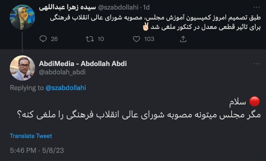 خانه/سیاست/سیاست داخلیمخالفت شورای عالی انقلاب فرهنگی با مصوبه کنکوری مجلس!خواندن2 دقیقه -یکشنبه 1403/07/01 - 17:32کد خبر3321اشتراکگذاری عبدالحسین خسروپناه در واکنش به طرح موضوع لغو مصوبه شورای عالی انقلاب فرهنگی درباره برگزاری کنکور از سوی مجلس به ایرنا گفت: بحثی که در کمیسیون آموزش مجلس مطرح شده، پیشنهاد برخی از نمایندگان مجلس است که البته حق دارند نظر بدهند قطعاً ما نباید جلوی آزادی بیان نمایندگان را بگیریم اما مصوبه کنکور به هیچ وجه تغییر نخواهد کرد.وی با بیان اینکه نمایندگان مجلس به شورای عالی انقلاب فرهنگی کمک می کنند، افزود: این مصوبه در حد همین کمیسیون آموزش مجلس مطرح شده است قطعاً این مصوبه به صحن نمی رود چرا که خلاف اصل ۵۷ قانون اساسی است.دبیر شورای عالی انقلاب فرهنگی گفت: رهبر معظم انقلاب و حضرت امام خمینی (ره) وظایفی را به شورای عالی انقلاب فرهنگی محول کرده اند و شورا در خصوص این مصوبه نیز طبق همین وظایف عمل خواهد کرد.خسروپناه اظهار داشت: شورای عالی انقلاب فرهنگی مصوبه ابلاغ شده در حوزه کنکور را پیگیری و دنبال می کند. خانواده ها آرامش داشته باشند و هیچ گونه نگرانی در این باره نداشته باشند و بدانند که همان مصوبه دنبال میشود و به هیچ وجه این مصوبه تغییر پیدا نمی کند.وی با تاکید بر اینکه قطعاً این مصوبه به صحن مجلس هم نمی رود، گفت: رییس مجلس شورای اسلامی هم با این مصوبه همراه است چرا که آقای قالیباف هم عضو شورای عالی انقلاب فرهنگی است.دبیر شورای عالی انقلاب فرهنگی یادآور شد: اگر طرح اصلاح قانون کنکور در نهایت هم در صحن مجلس تصویب شود، چون خلاف اصل ۵۷ قانون اساسی است در شورای نگهبان تایید نمی شود و رد خواهد شد./دولتبهار کمتر از یک دقیقه زمان بگذارید، ثبتنام کنید و نظرتان را زیر همین پست به اشتراک بگذارید.پیامهای توهینآمیز و یا حاوی دعوت به خشونت حذف خواهند شد.ثبت نامدر ادامه بخوانید بالاخره حمایت علنی معاون اول رییس جمهور از وزیر امور اقتصادی و داراییخواندن 0 کیهان: در بند زنان زندان اوین، محکومان سیاسی مشروبات الکلی دست ساز در اختیار دارندخواندن 1 دقیقه علیعسگری، مدیرعامل شرکت صنایع پتروشیمی خلیج فارس، حاضر به گفتوگو درباره شرایط استقلال نشدخواندن 0 موحدی: قانون عفاف و حجاب را سیاسی نکنیدخواندن 1 دقیقه رسایی: آقای قالیباف! چرا مجلس و بقیه دستگاهها به قانون شفافیت عمل نمیکنند؟خواندن 1 دقیقهباید خواندخاطرات اکبر هاشمی - ۱ اسفند ۱۳۷۸ - ملاقات عبدالله جاسبی و نگرانی از نتایج انتخاباتفیلم/ سردار مرتضی طلایی کجاست؟خاطرات اکبر هاشمی - ۱۹ شهريور ۱۳۷۸ - مذاکرات دو نفره سیاسی با واعظ طبسی تا هنگام بدرقه به سوی تهران هم ادامه داشته که در نهایت هاشمی ظاهرا از اینجا تصمیم به شرکت جدی در انتخابات مجلس ششم گرفتسوابق ادوار اخیر مجلس شورای اسلامی نشان داد که مجلس در راس امور نیست و در اختیارات فرمانده کل قوا و نیروهای مسلح در هیچ سطحی نمیتواند دخالت و یا مصوبه طی کند، چه برسد که نظارت کندآینده ایران با نامزدهای اعلام شده انتخابات ریاست جمهوری چه میشود؟ / گفتگو با دکتر تقی آزاد ارمکیمیشه با شما احساس خستگی کرد؟یک دامپزشک بسیجی بجای جراح گوش و حلق و بینی سرپرست شبکه بهداشت ایذه شد!خاطرات اکبر هاشمی - ۱۴ شهريور ۱۳۷۸ - دیدار مدیران ارشد دستگاه قضایی با هاشمی رفسنجانی و گله آنان از بی توجهی هاشمی شاهرودی رییس جدید قوه قضاییه ادامه داردخاطرات اکبر هاشمی - ۱۶ شهريور ۱۳۷۸ - در ادامه تلاش های مرحوم واعظ طبسی که در دیدارهای مکرر برای تشویق هاشمی به شرکت در انتخابات اقدام میکرد این بار هم او با هاشمی ملاقات کردخاطرات اکبر هاشمی - ۱۸ شهريور ۱۳۷۸ - ادامه بازدید ها از متعلقات و ابنیه و آثار آستان قدس