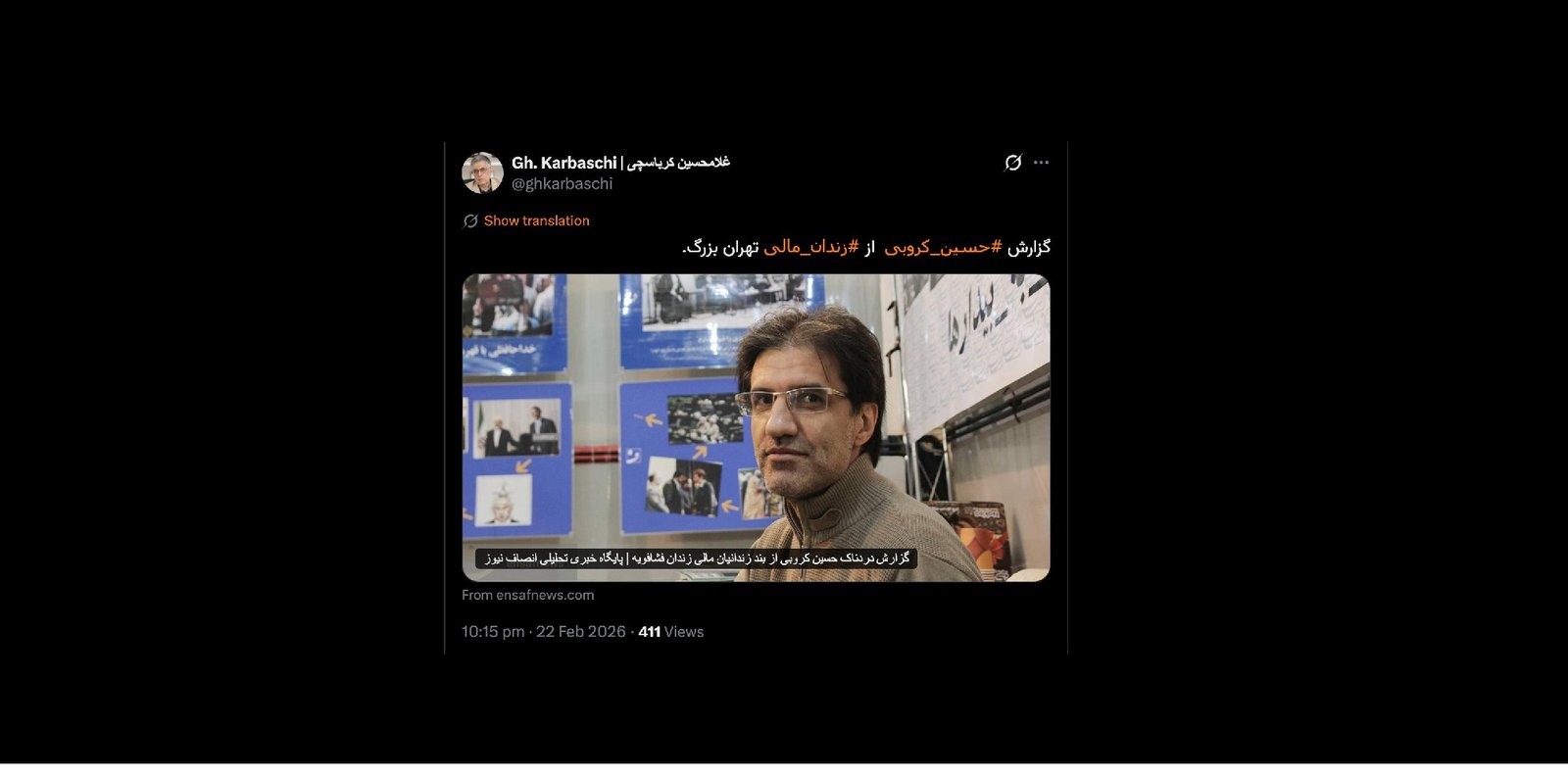 خانه/سیاستجناب کرباسچی درود کاش ایشان و دیگران در اندازه خود، همانقدر که جنابعالی دغدغه زندانیان در بند ۳۲۵ اوین را داشتید...خواندن1 دقیقه -دوشنبه 1404/12/04 - 09:25کد خبر24486اشتراکگذاری و به دوستان خود در ملاقات ها می گفتید و تماس می گرفتید و حتی در مواردی به آقای سید احمد زرگرکاش ایشان و دیگران در اندازه خود، همانقدر که جنابعالی دغدغه زندانیان در بند ۳۲۵ اوین را داشتید و به دوستان خود در ملاقات ها می گفتید و تماس می گرفتید و حتی در مواردی به آقای سید احمد زرگر قاضی وقت و خاص دادگاه انقلاب تماس می گرفتید و همچنین سید حسین مرعشی و اشخاص محترم دیگر، تلاش میکردند.و کاش همه افراد موثر، بهر نحو تلاش های بیشتری برای ارتقای وضع مجتمع ندامتگاهی تهران بزرگ کنند که مغفول واقع شده است. گزارش #حسین_کروبی از #زندان_مالی تهران بزرگ. https://t.co/ic3QxxrF05— Gh. Karbaschi | غلامحسین کرباسچی (@ghkarbaschi) February 22, 2026🔴 جناب کرباسچی @ghkarbaschi درود💢کاش ایشان و دیگران در اندازه خود، همانقدر که جنابعالی دغدغه زندانیان در بند ۳۲۵ اوین را داشتید و به دوستان خود در ملاقات ها می گفتید و تماس می گرفتید و حتی در مواردی به آقای سید احمد زرگر قاضی وقت و خاص دادگاه انقلاب تماس می گرفتید و همچنین سید… https://t.co/KU1YzKpTg7— AbdiMedia - Abdollah Abdi (@abdolah_abdi) February 22, 2026 کمتر از یک دقیقه زمان بگذارید، ثبتنام کنید و نظرتان را زیر همین پست به اشتراک بگذارید.پیامهای توهینآمیز و یا حاوی دعوت به خشونت حذف خواهند شد.ثبت نامدر ادامه بخوانید خواب هاشمی رفسنجانی درباره مذاکره با آمریکا - بخشی از روزنوشت جمعه ۱۵ اسفند ۱۳۸۲ اکبر هاشمی رفسنجانیخواندن 1 دقیقه آقای دکتر درود چه کسی و با چه مصلحتی وی را به عنوان فقیه در شورای نگهبان قانون اساسی حفظ کرده است؟خواندن 1 دقیقه درود حسین جان البته مانند دیگر پیام های تسلیت خود به سایرین علاوه بر توییتر در حساب های دیگر هم منتشر کرده و سردار رضایی هم بازنشسته نیستخواندن 1 دقیقه سیاست متغیر بقدری عجیب و بیرحم است که اگر جنگ محدود یا حتی ناگهان گسترده بین جمهوری اسلامی و ایالات متحده رخ دهد...خواندن 1 دقیقه آقای رییس قوه قضاییه مشابه چنین توصیهای را به سازمان بازرسی کل کشور کرده بود که فریب رقبا را نخورند و...خواندن 1 دقیقهباید خواندخاطرات اکبر هاشمی - ۱ اسفند ۱۳۷۸ - ملاقات عبدالله جاسبی و نگرانی از نتایج انتخاباتفیلم/ سردار مرتضی طلایی کجاست؟خاطرات اکبر هاشمی - ۱۹ شهريور ۱۳۷۸ - مذاکرات دو نفره سیاسی با واعظ طبسی تا هنگام بدرقه به سوی تهران هم ادامه داشته که در نهایت هاشمی ظاهرا از اینجا تصمیم به شرکت جدی در انتخابات مجلس ششم گرفتسوابق ادوار اخیر مجلس شورای اسلامی نشان داد که مجلس در راس امور نیست و در اختیارات فرمانده کل قوا و نیروهای مسلح در هیچ سطحی نمیتواند دخالت و یا مصوبه طی کند، چه برسد که نظارت کندآینده ایران با نامزدهای اعلام شده انتخابات ریاست جمهوری چه میشود؟ / گفتگو با دکتر تقی آزاد ارمکیمیشه با شما احساس خستگی کرد؟یک دامپزشک بسیجی بجای جراح گوش و حلق و بینی سرپرست شبکه بهداشت ایذه شد!خاطرات اکبر هاشمی - ۱۴ شهريور ۱۳۷۸ - دیدار مدیران ارشد دستگاه قضایی با هاشمی رفسنجانی و گله آنان از بی توجهی هاشمی شاهرودی رییس جدید قوه قضاییه ادامه داردخاطرات اکبر هاشمی - ۱۶ شهريور ۱۳۷۸ - در ادامه تلاش های مرحوم واعظ طبسی که در دیدارهای مکرر برای تشویق هاشمی به شرکت در انتخابات اقدام میکرد این بار هم او با هاشمی ملاقات کردخاطرات اکبر هاشمی - ۱۸ شهريور ۱۳۷۸ - ادامه بازدید ها از متعلقات و ابنیه و آثار آستان قدس